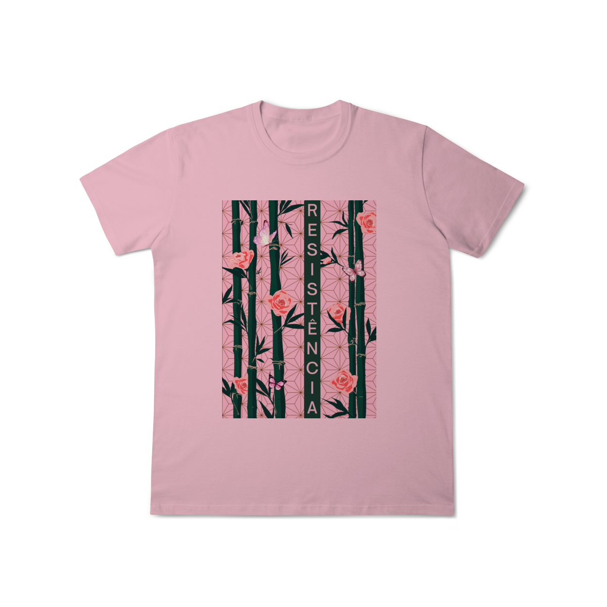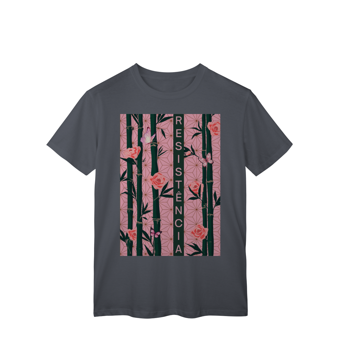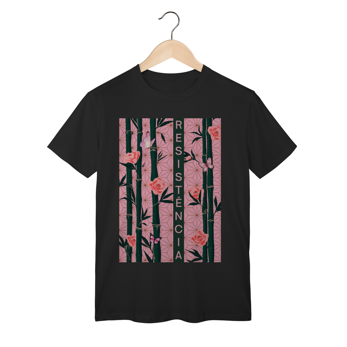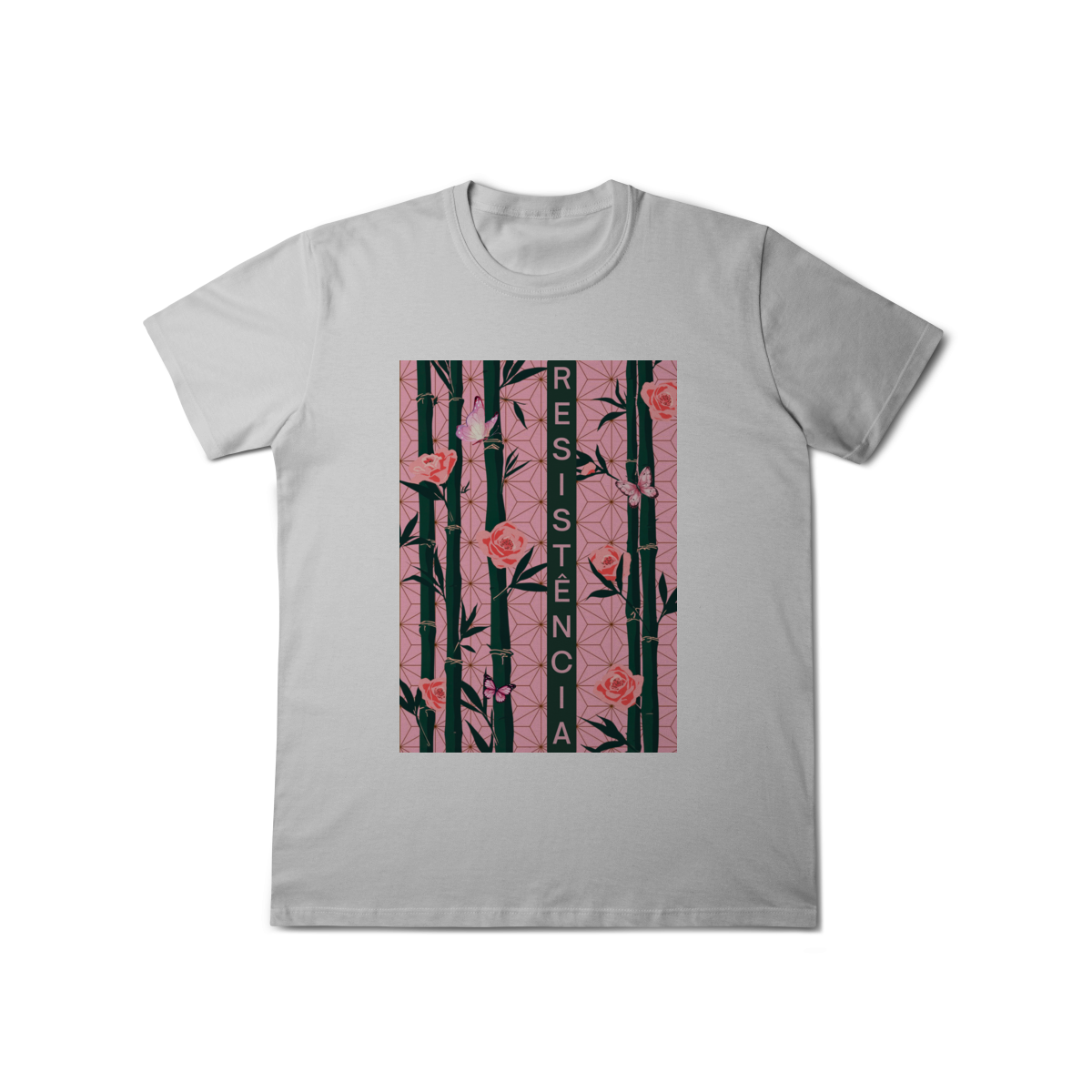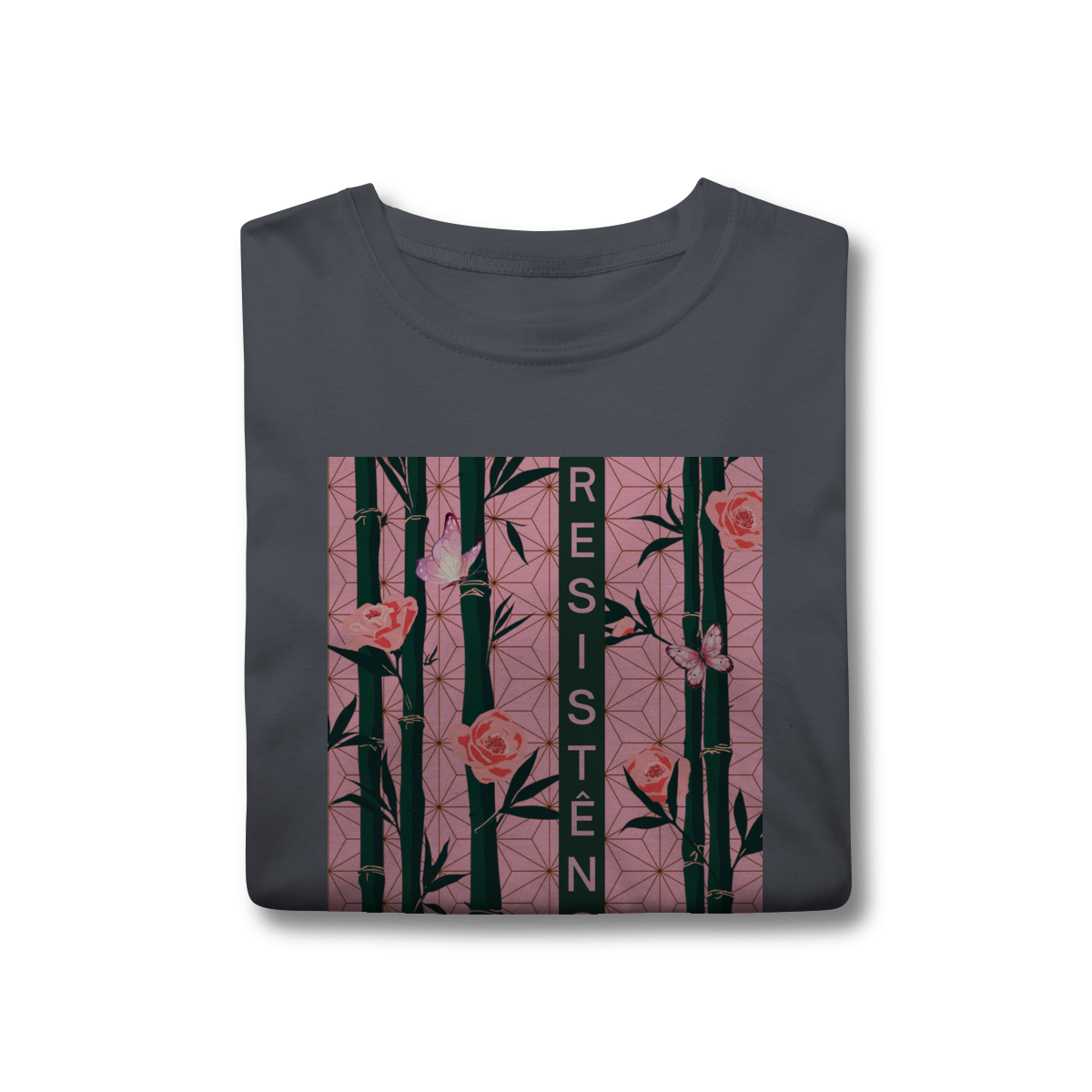 Inspirada em Nezuko Kamado, de Kimetsu no Yaiba, esta estampa mistura delicadeza e poder. O bambu, as flores e as borboletas simbolizam a resistência e a beleza que existe na luta silenciosa.