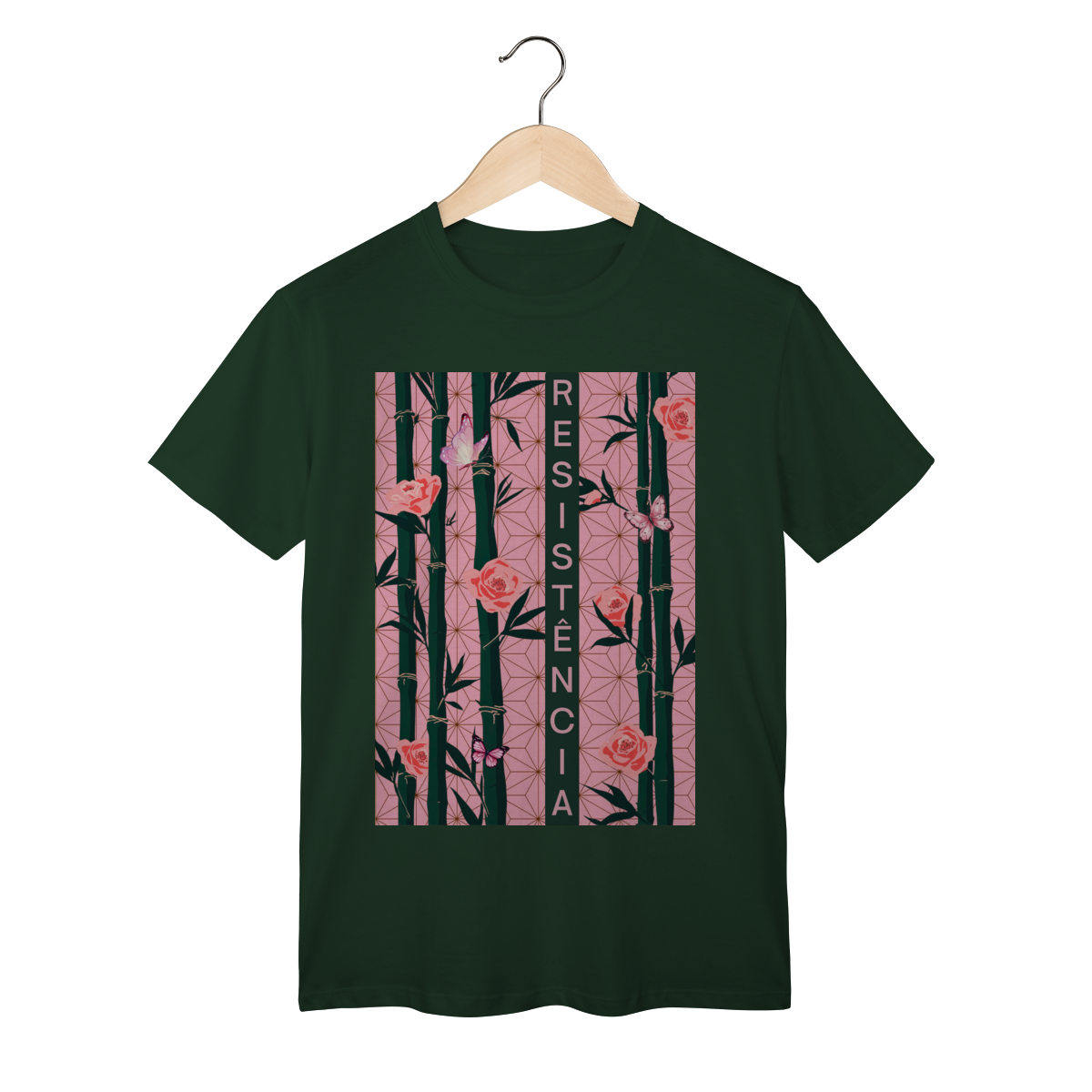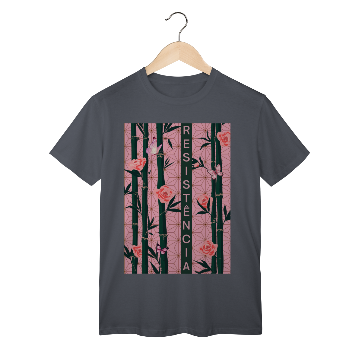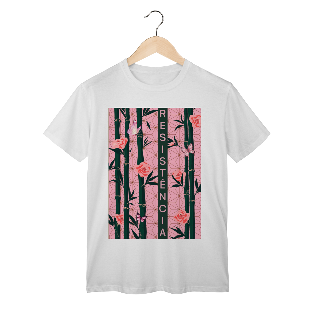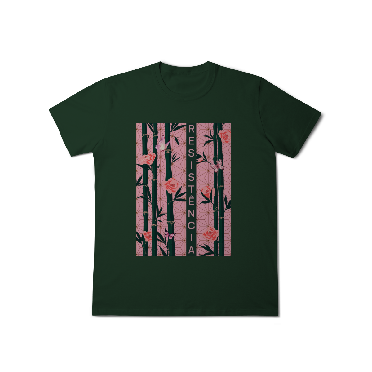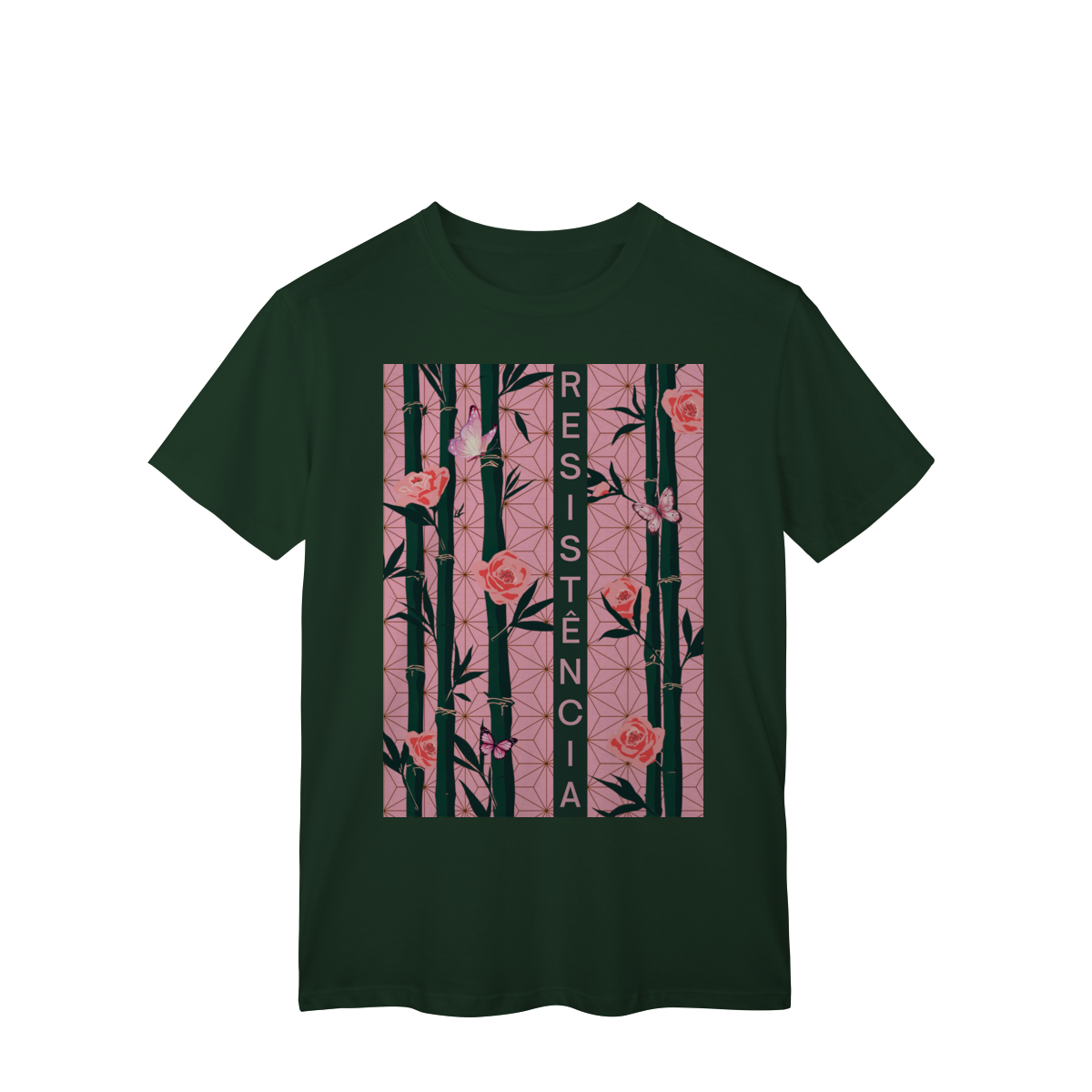 Inspirada em Nezuko Kamado, de Kimetsu no Yaiba, esta estampa mistura delicadeza e poder. O bambu, as flores e as borboletas simbolizam a resistência e a beleza que existe na luta silenciosa.