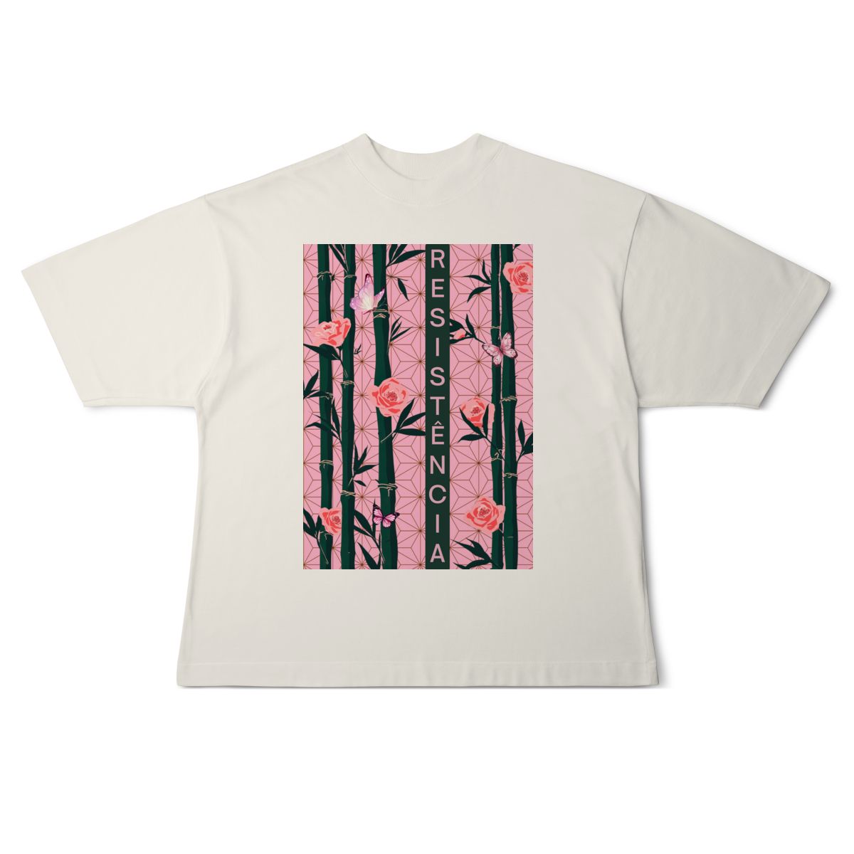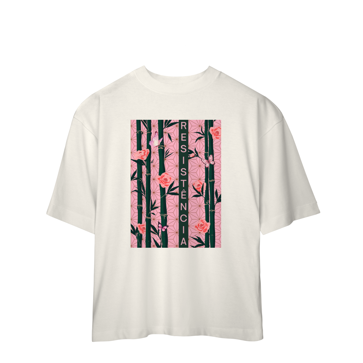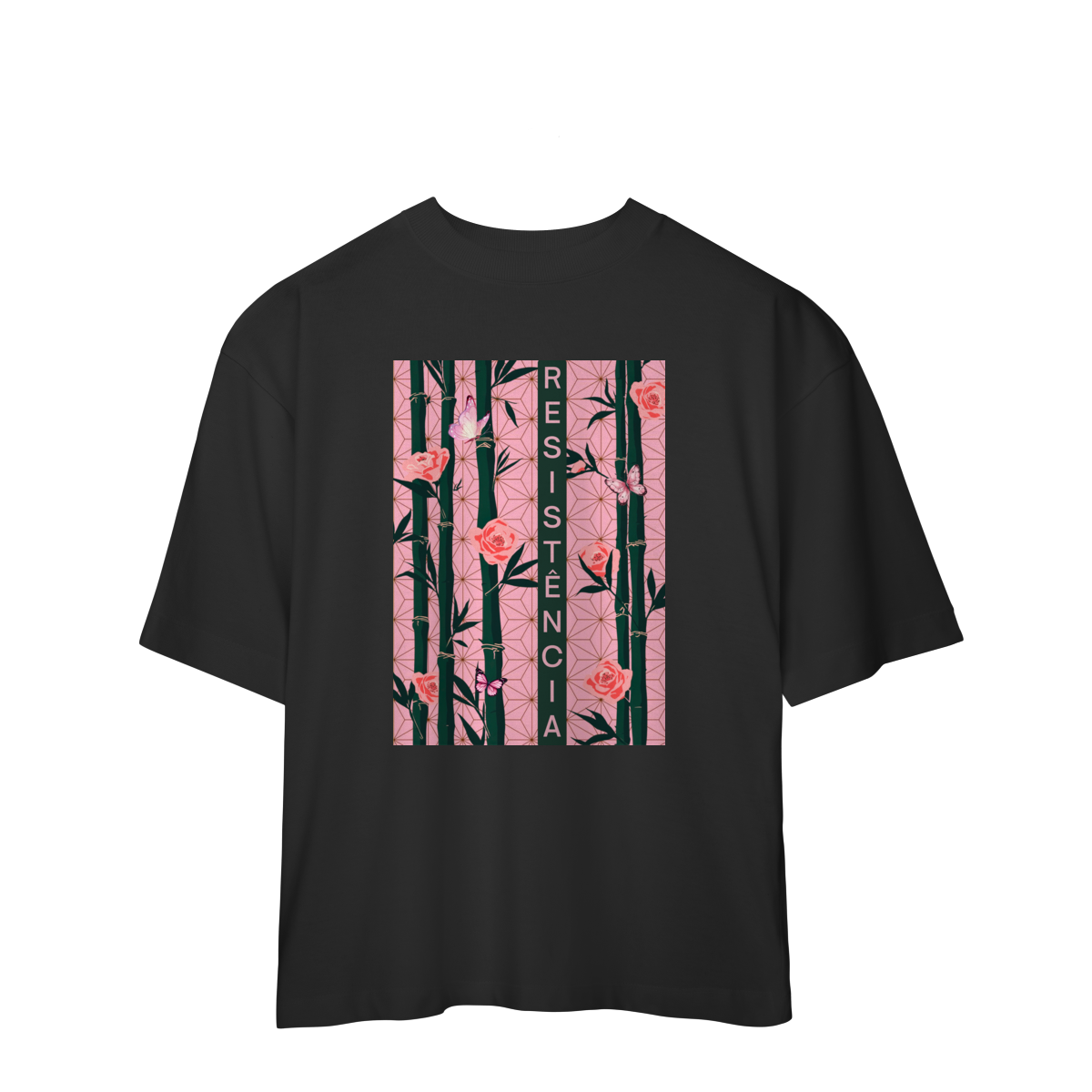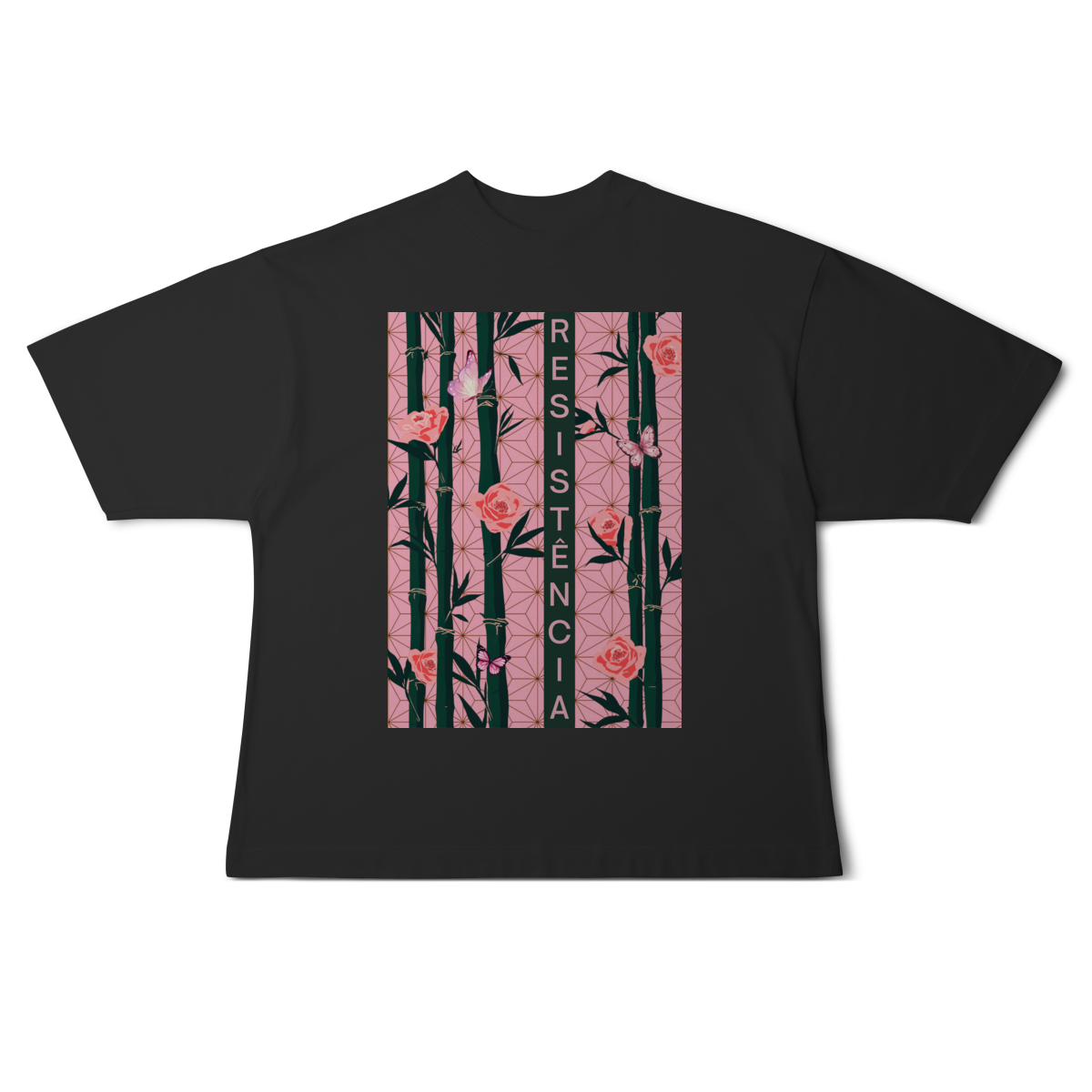 Inspirada em Nezuko Kamado, de Kimetsu no Yaiba, esta estampa mistura delicadeza e poder. O bambu, as flores e as borboletas simbolizam a resistência e a beleza que existe na luta silenciosa.