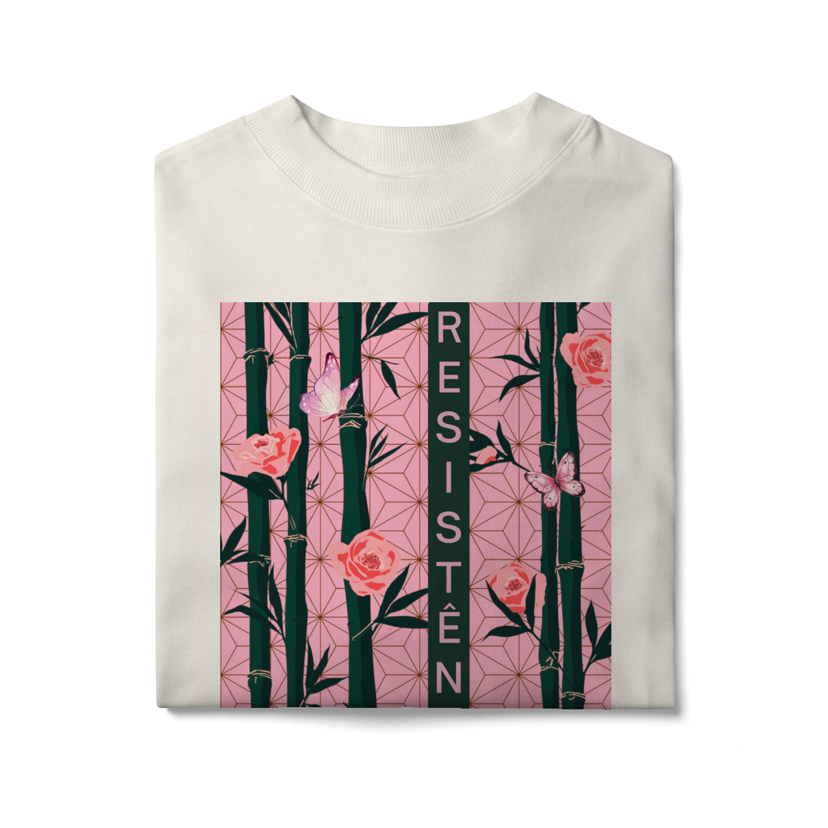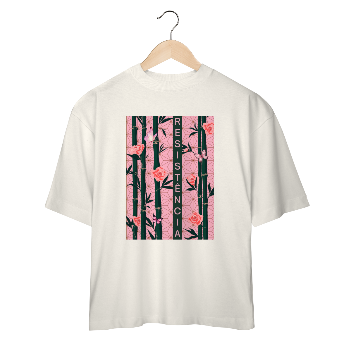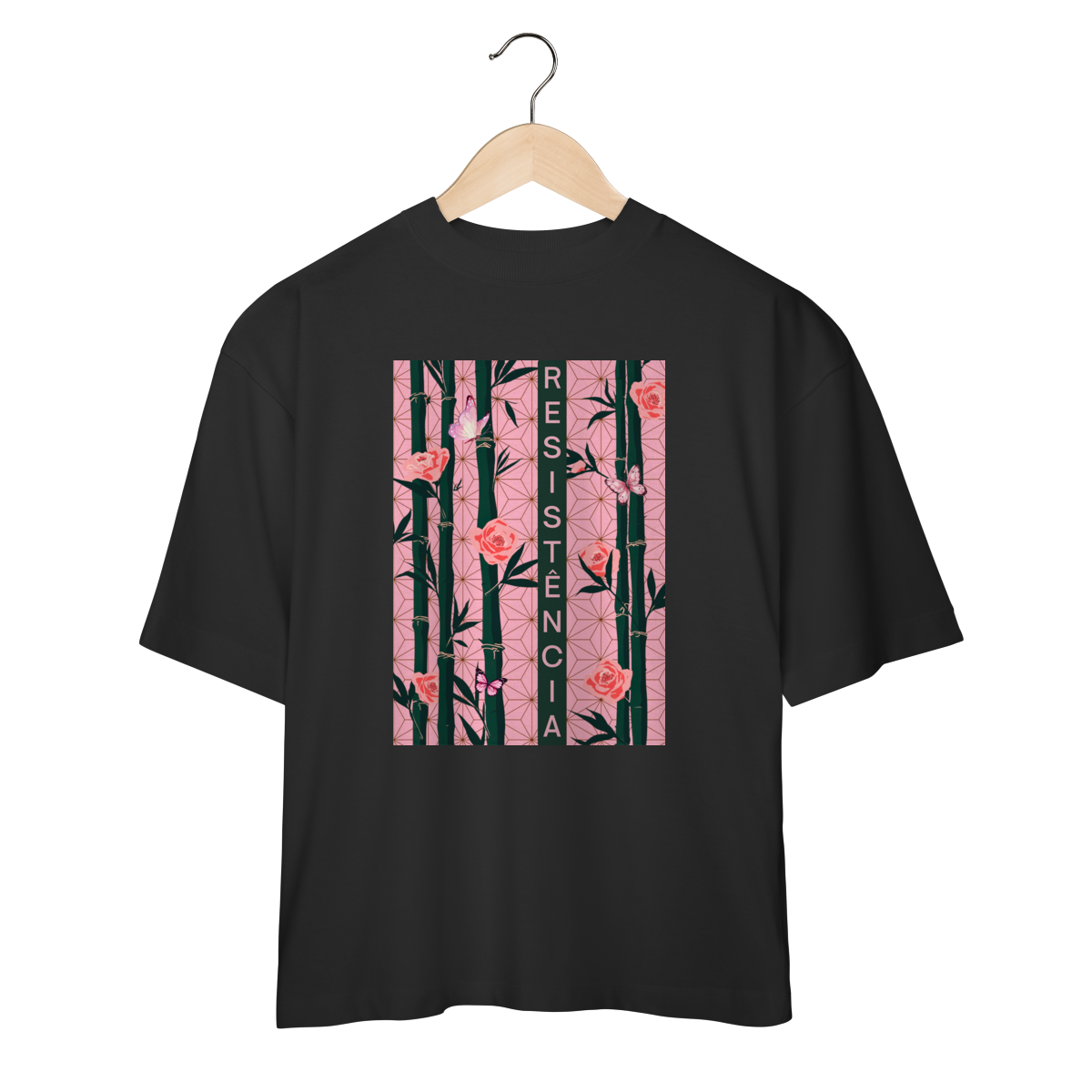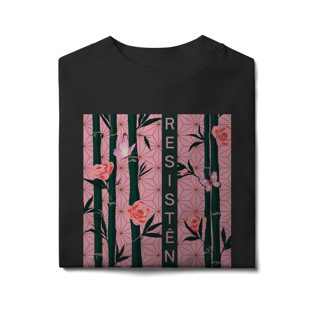 Inspirada em Nezuko Kamado, de Kimetsu no Yaiba, esta estampa mistura delicadeza e poder. O bambu, as flores e as borboletas simbolizam a resistência e a beleza que existe na luta silenciosa.