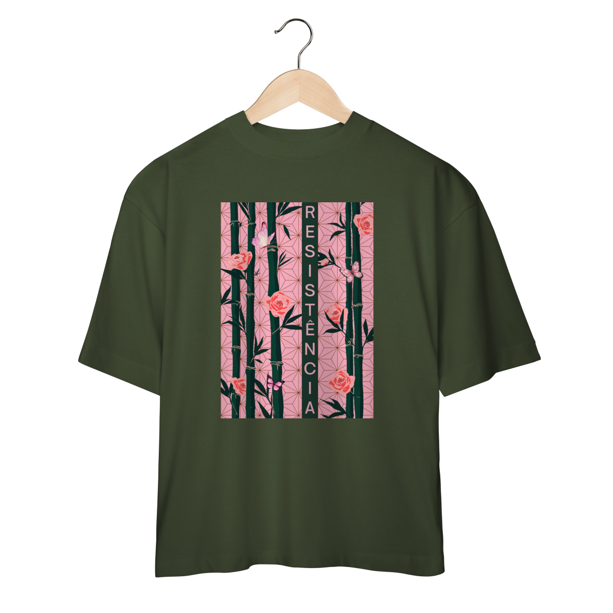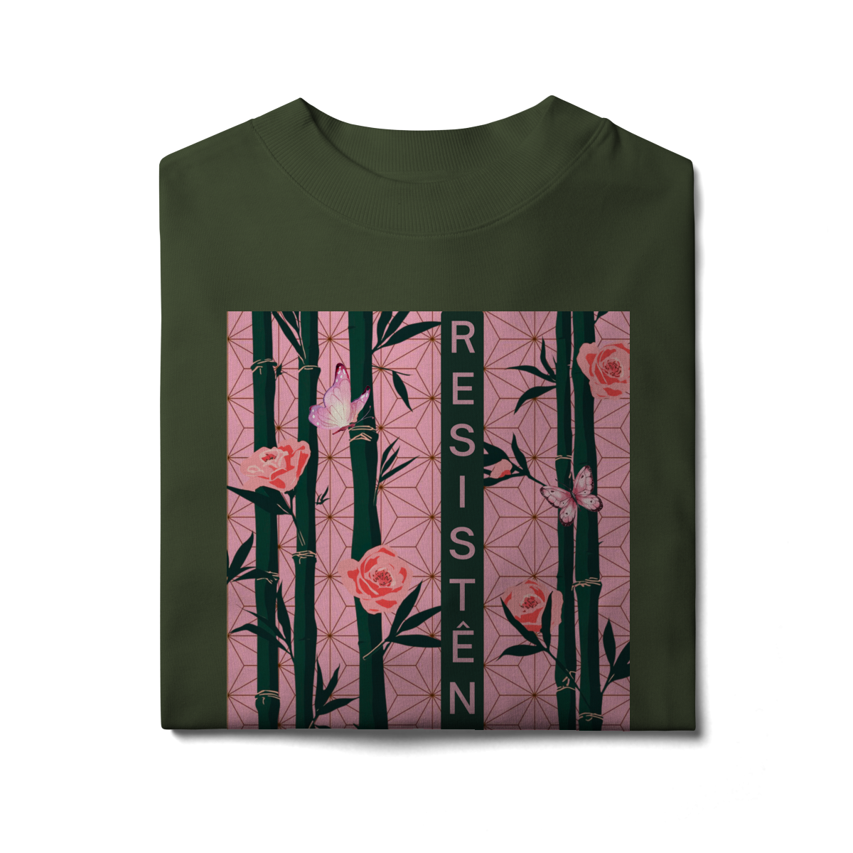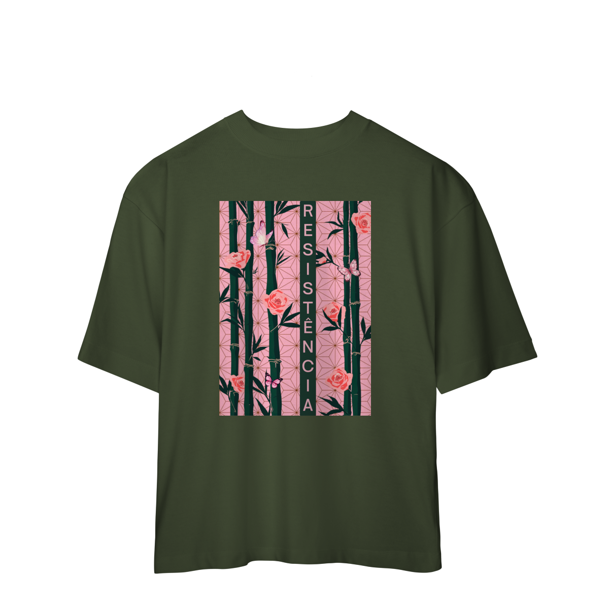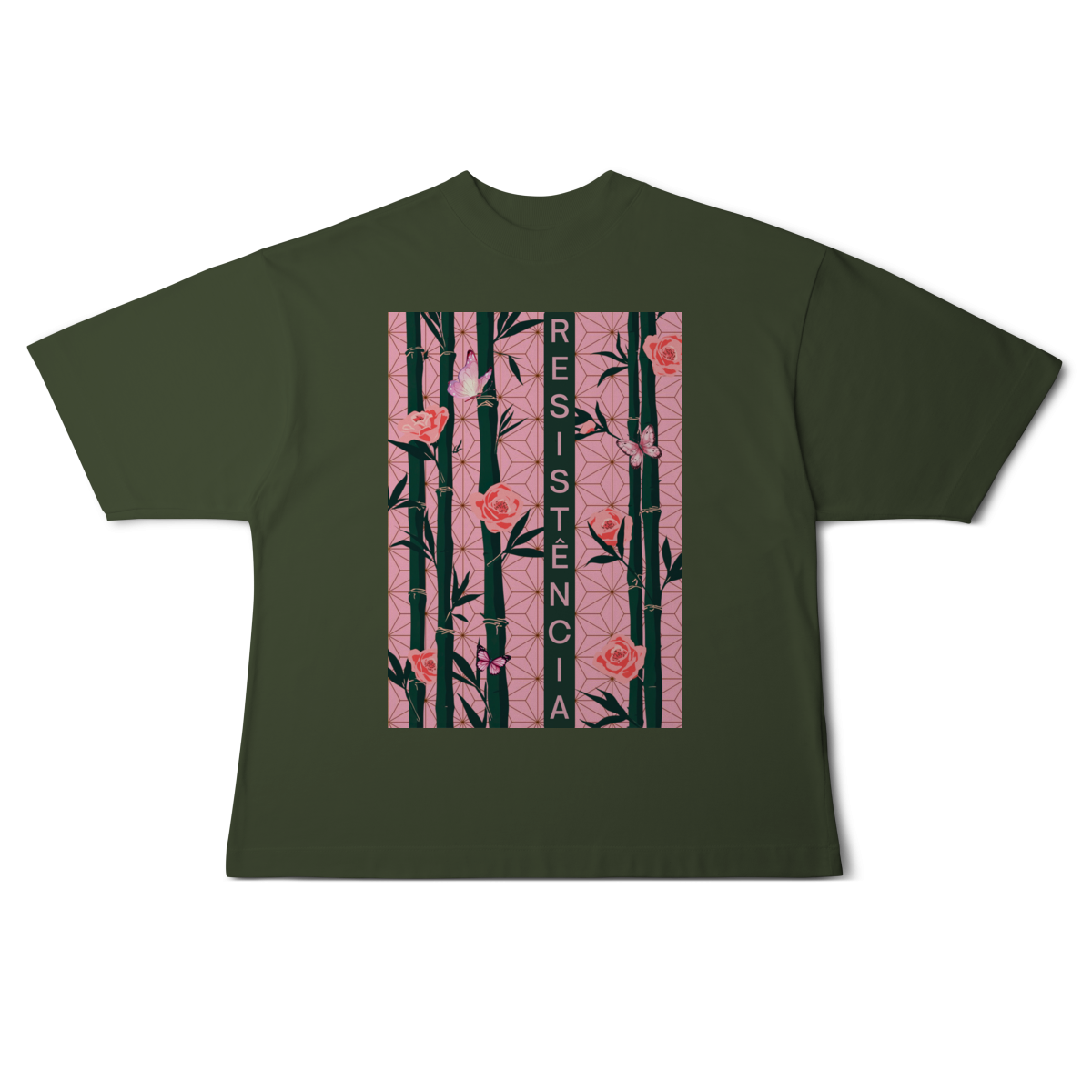 Inspirada em Nezuko Kamado, de Kimetsu no Yaiba, esta estampa mistura delicadeza e poder. O bambu, as flores e as borboletas simbolizam a resistência e a beleza que existe na luta silenciosa.