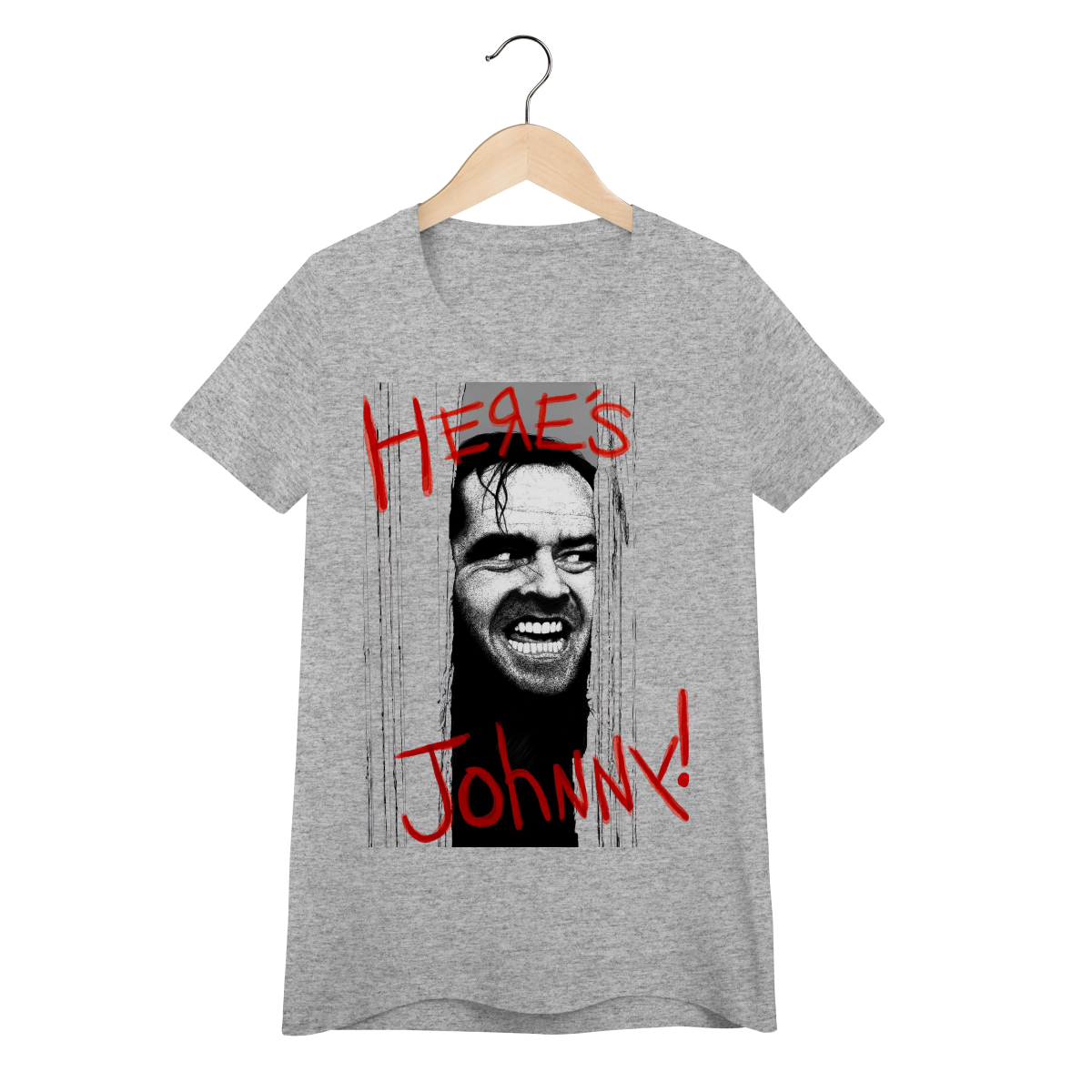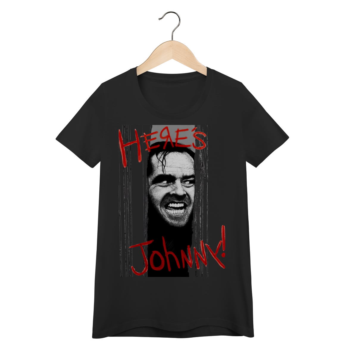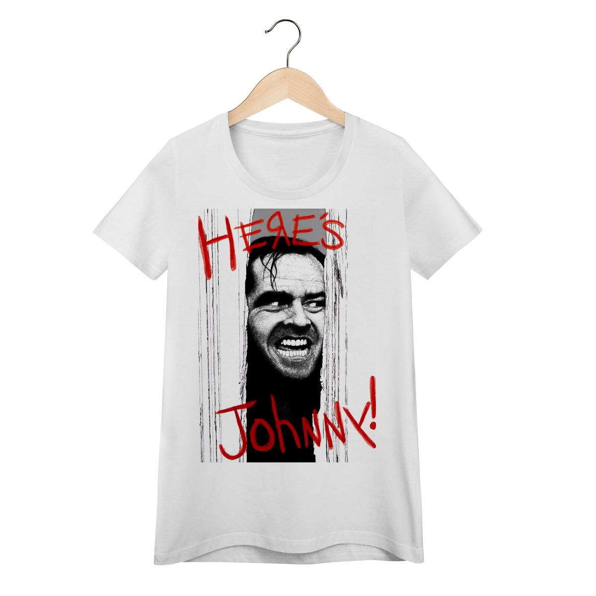 Reviva uma das cenas mais icônicas do cinema de terror com esta camiseta inspirada no clássico "O Iluminado" (1980), dirigido por Stanley Kubrick. Estampada com a imagem assustadora de Jack Nicholson (Jack Torrance) quebrando a porta e a frase lendária "Here's Johnny!", essa Baby Long