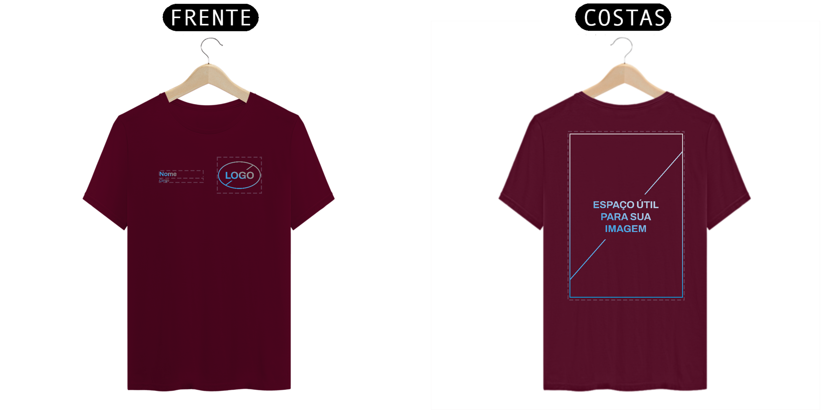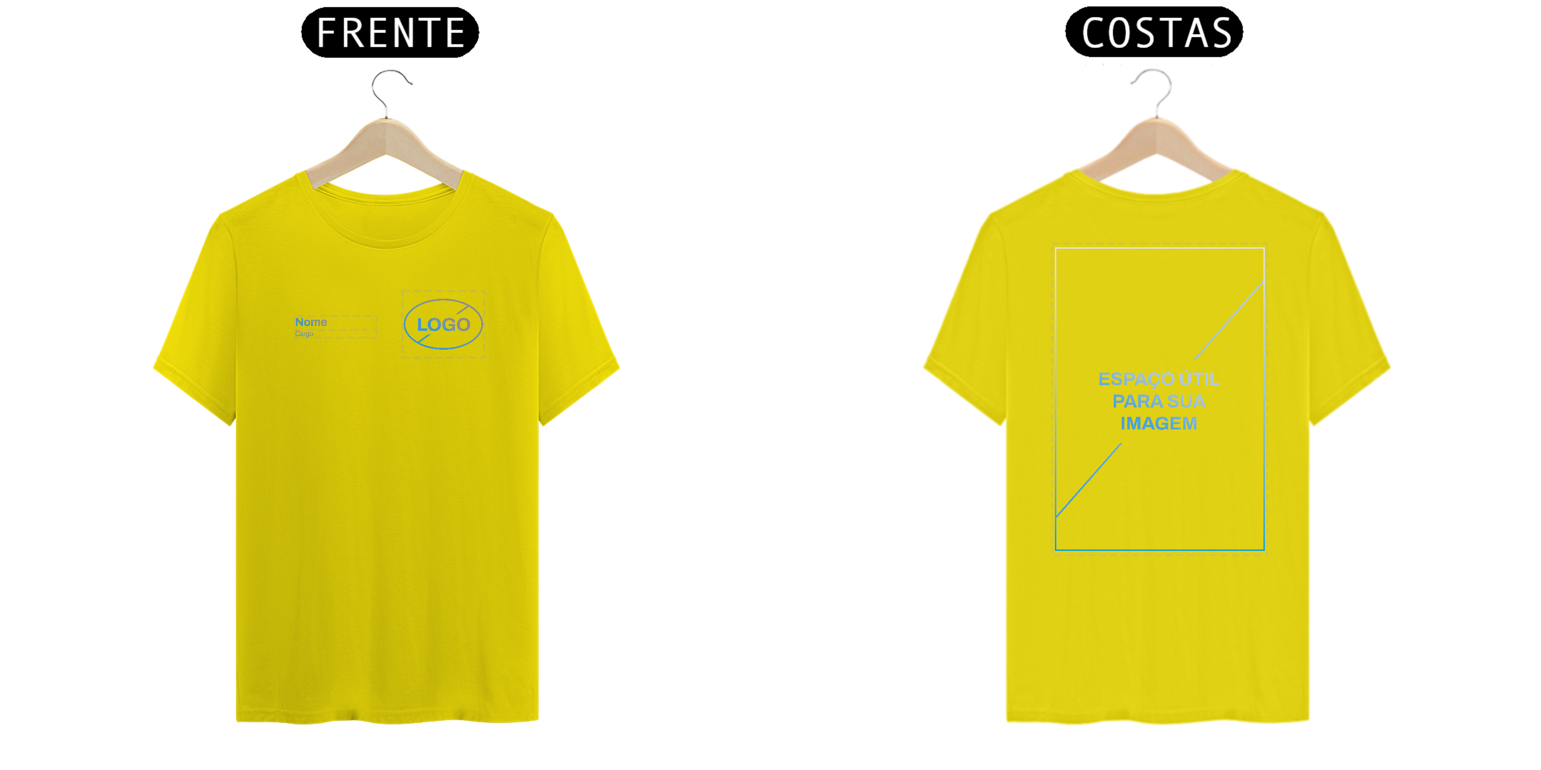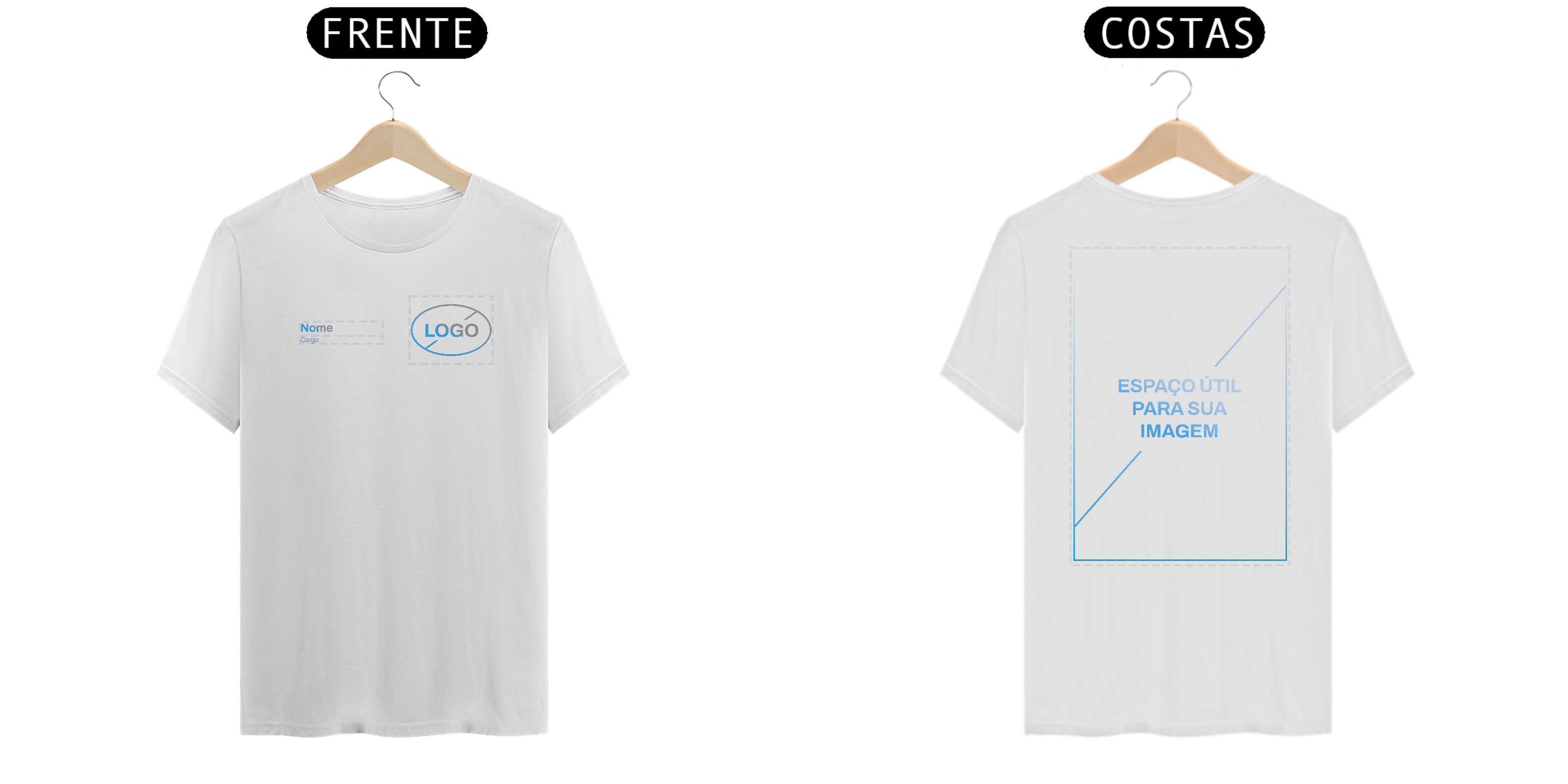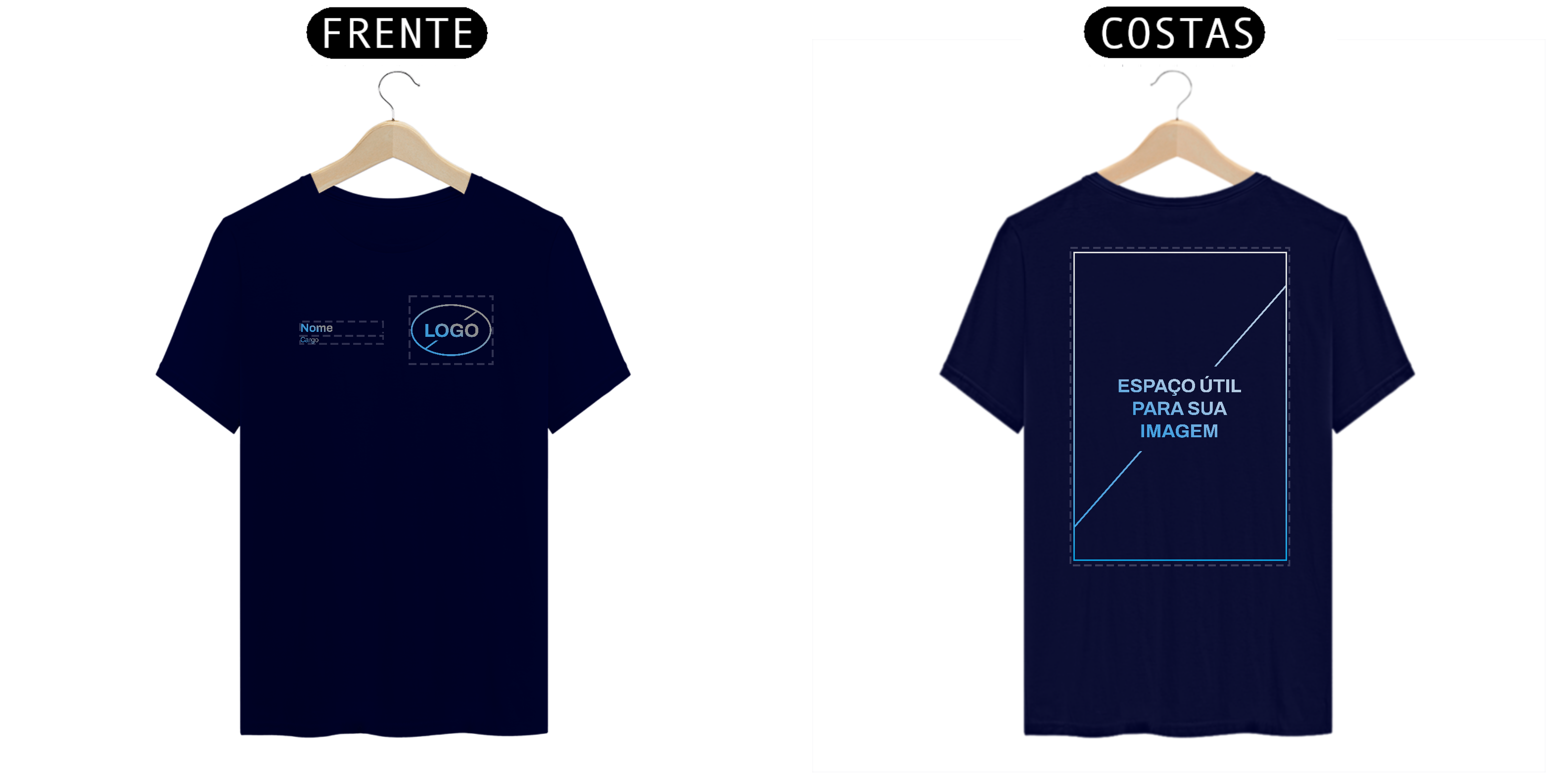 Neste modelo de Uniforme, você tem a autonomia de enviar o seu Logo e também inserir duas linhas de texto, para nome e cargo, na frente da camiseta.