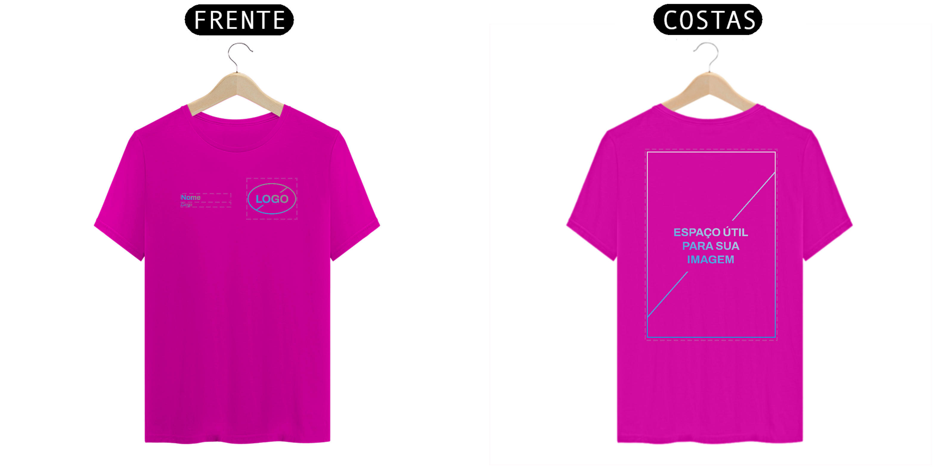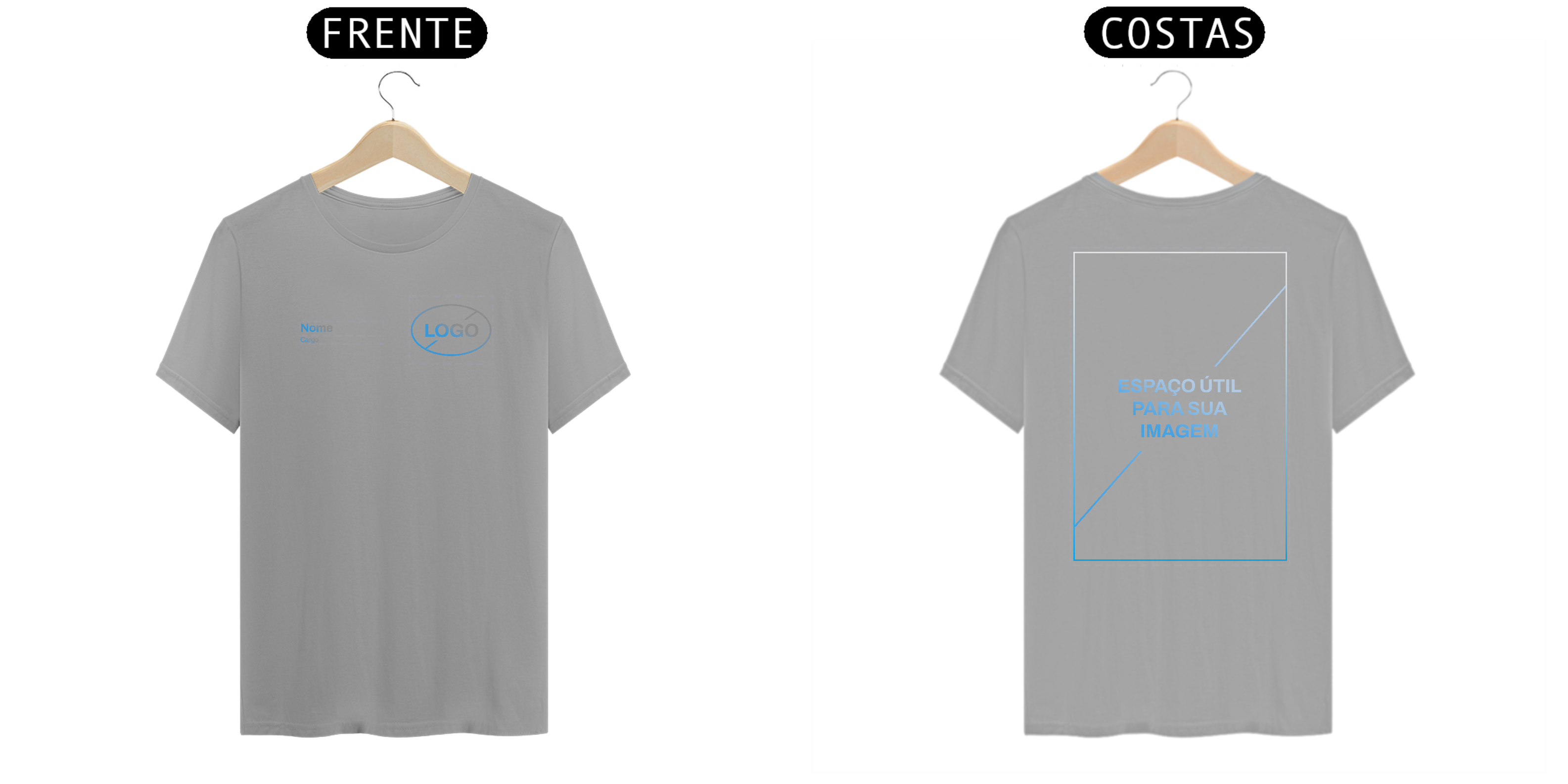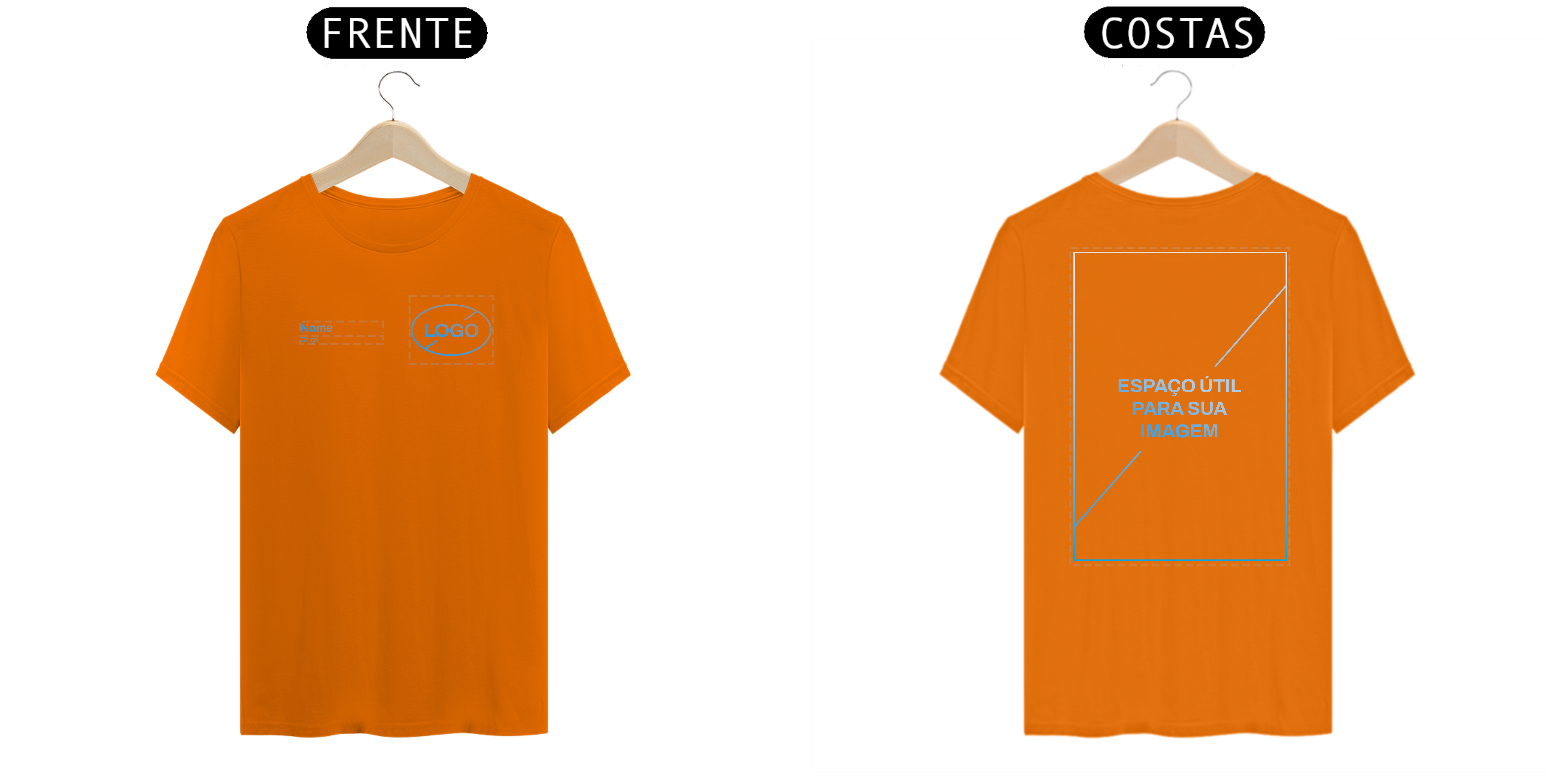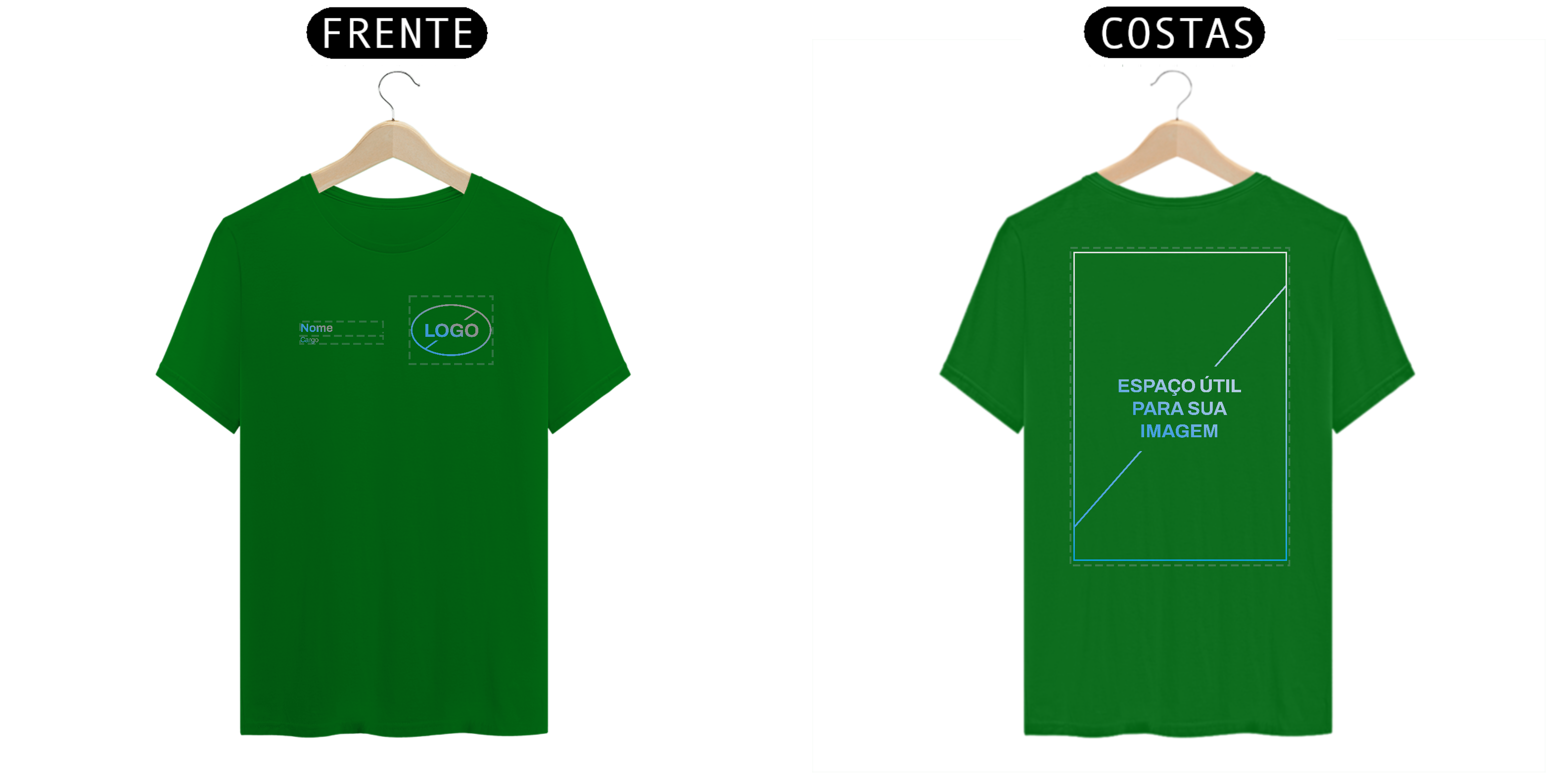 Neste modelo de Uniforme, você tem a autonomia de enviar o seu Logo e também inserir duas linhas de texto, para nome e cargo, na frente da camiseta.