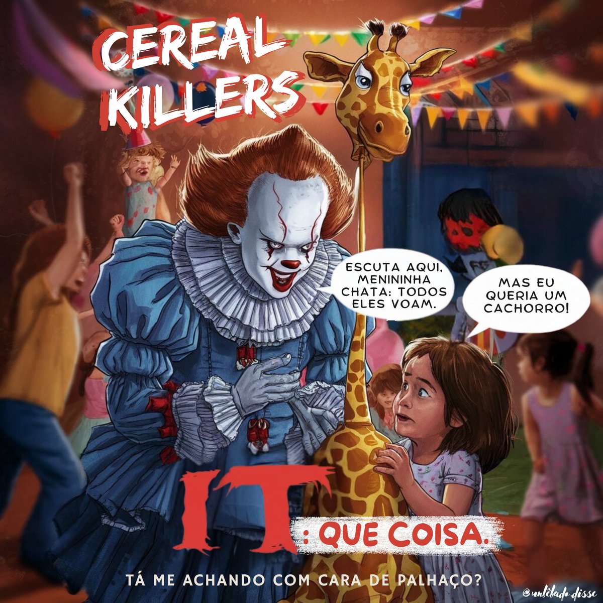 Tá me achando com cara de palhaço?! Porque, se for o Pennywise, a resposta é um sonoro SIM — e ele ainda trouxe o cereal! Nessa estampa maravilhosa da Loja do Bêbado, o palhaço mais temido dos bueiros invade a festinha infantil com um balão na mão e muita cara de quem vai... servir café da manhã. Só que do jeito mais errado possível.