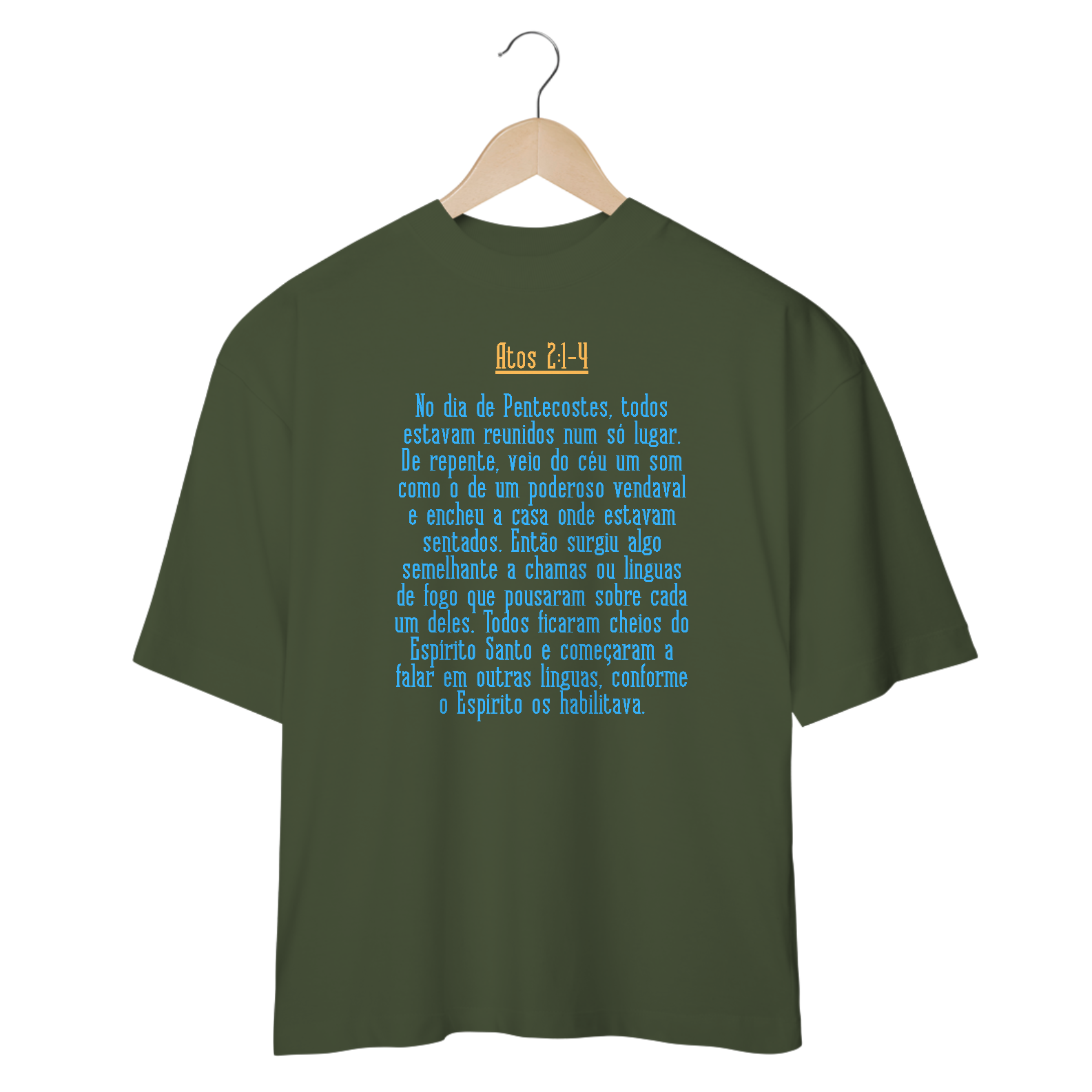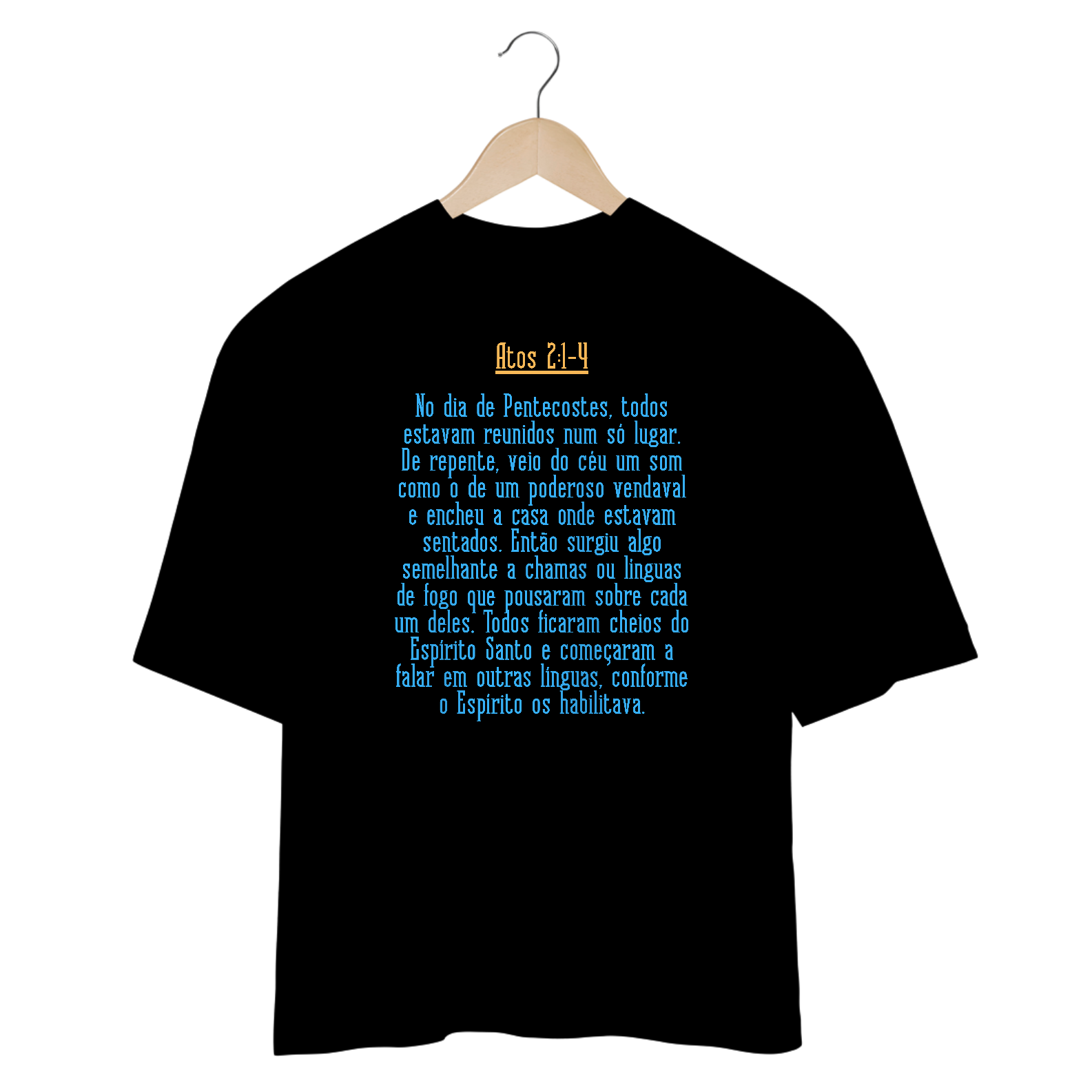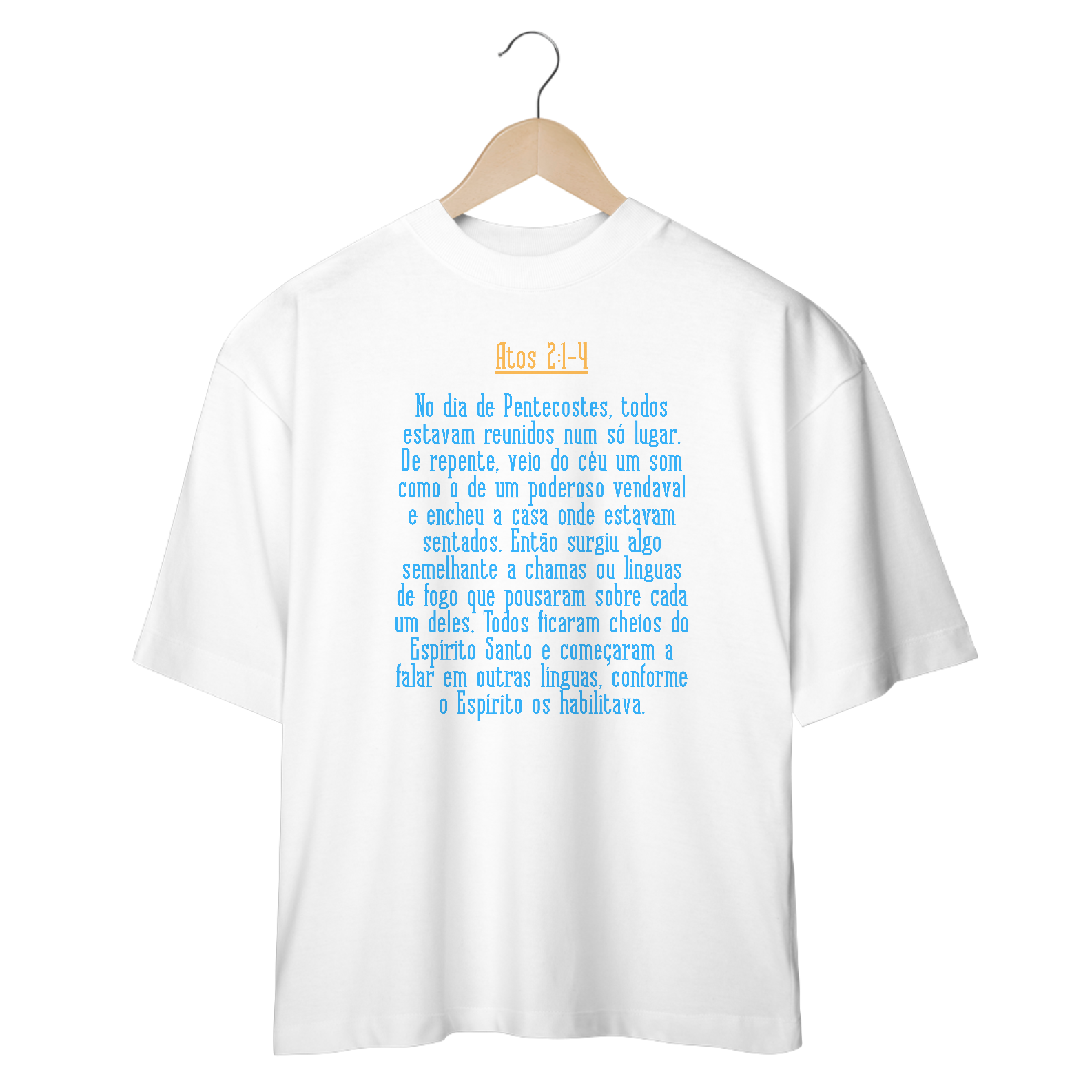 Camiseta oversized cristã com citação biblica de Atos 2:1-4 "No dia de Pentecostes, todos estavam reunidos num só lugar. De repente, veio do céu um som como o de um poderoso vendaval e encheu a casa onde estavam sentados. Então surgiu algo semelhante a chamas ou línguas de fogo que pousaram sobre cada um deles. Todos ficaram cheios do Espírito Santo e começaram a falar em outras línguas, conforme o Espírito os habilitava." momento do derramar do Espirito Santo sobre as pessoas