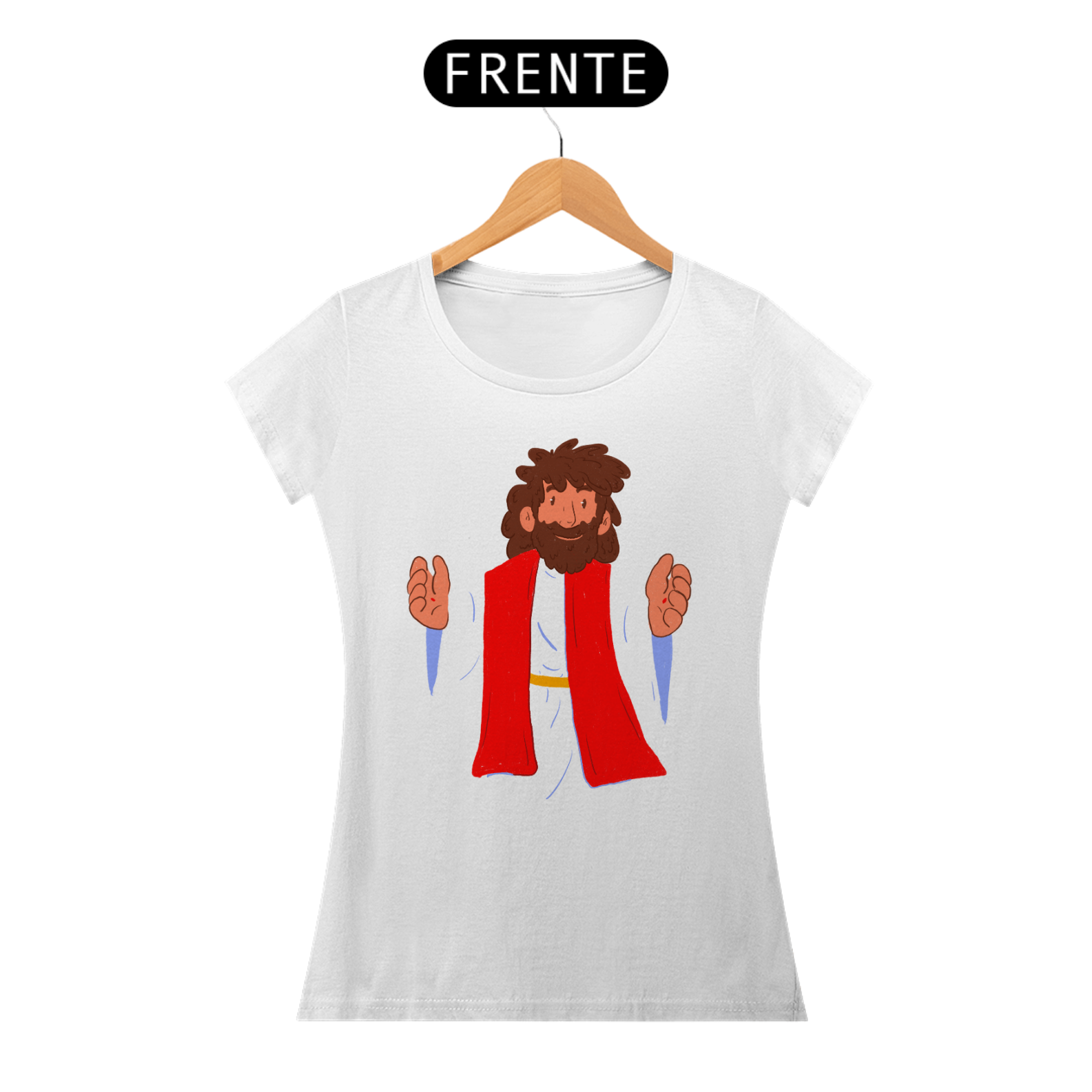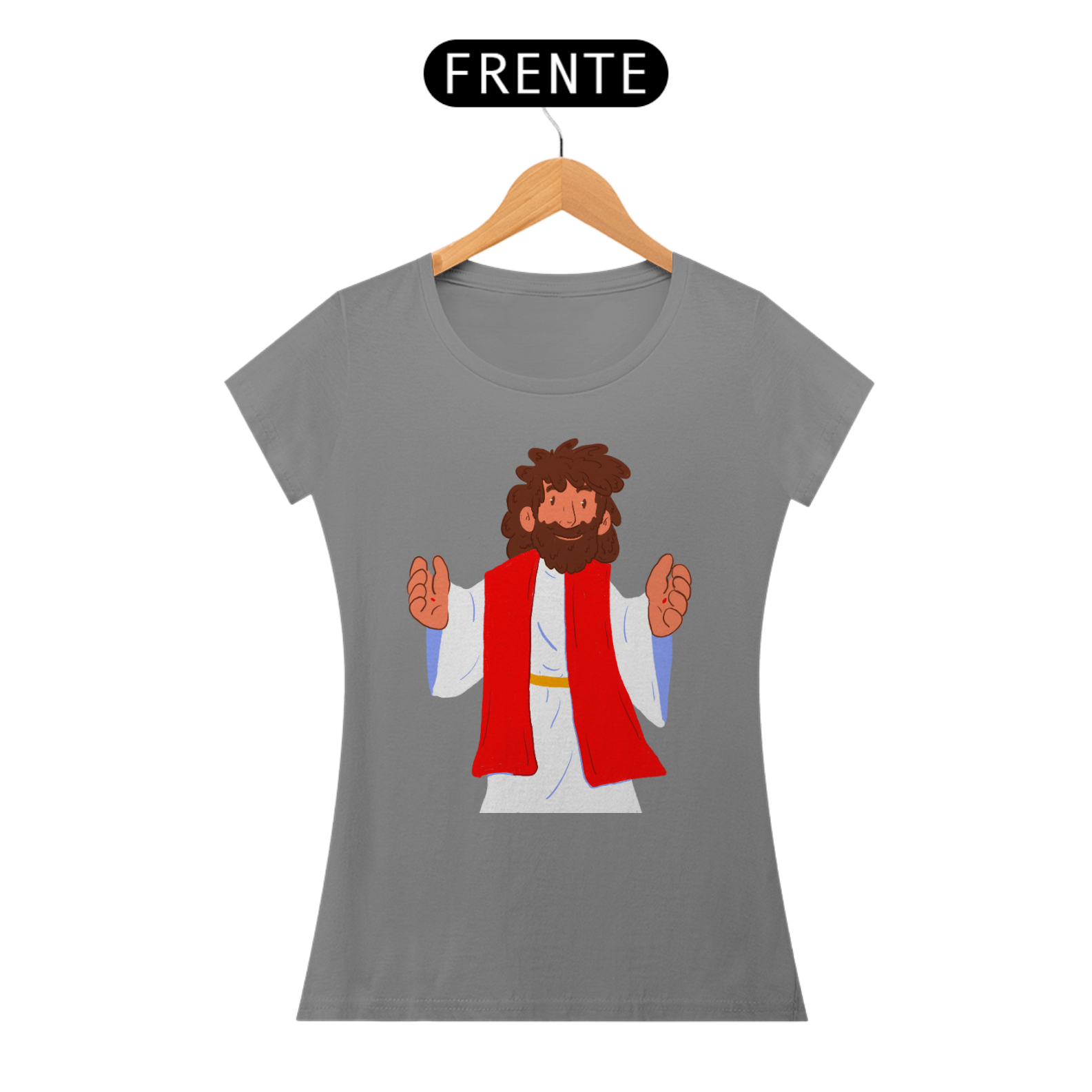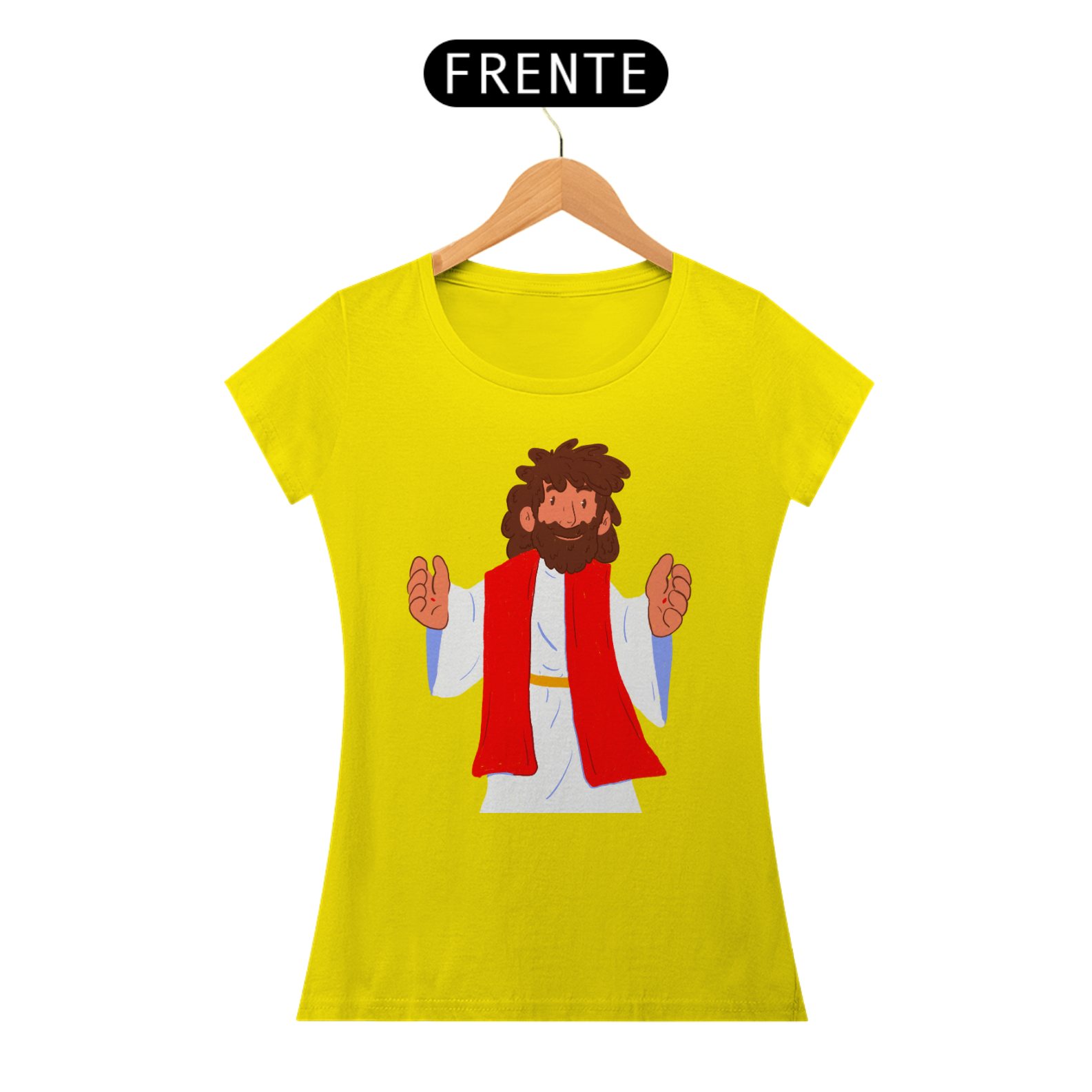 Camiseta cristã feminina com estampa ilustrada de Jesus Cristo no estilo cartoon