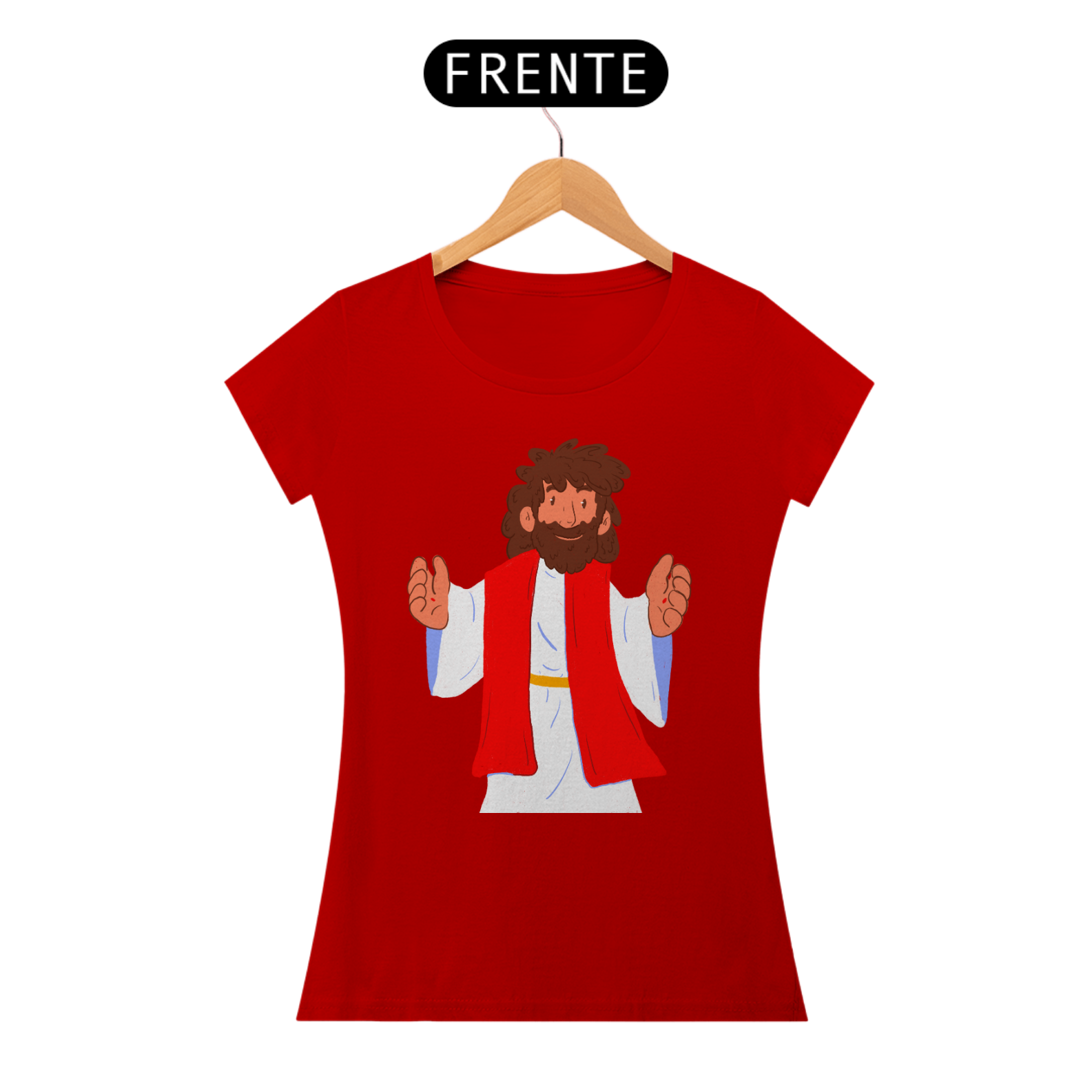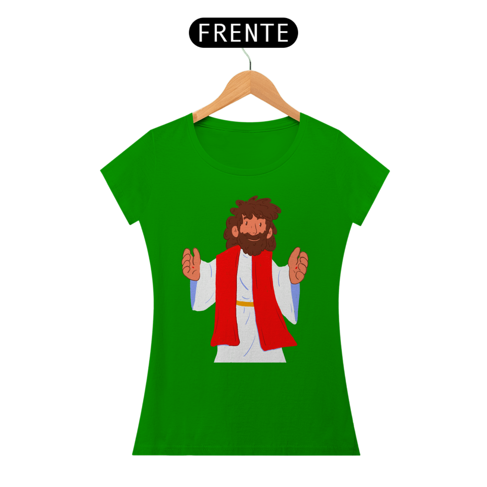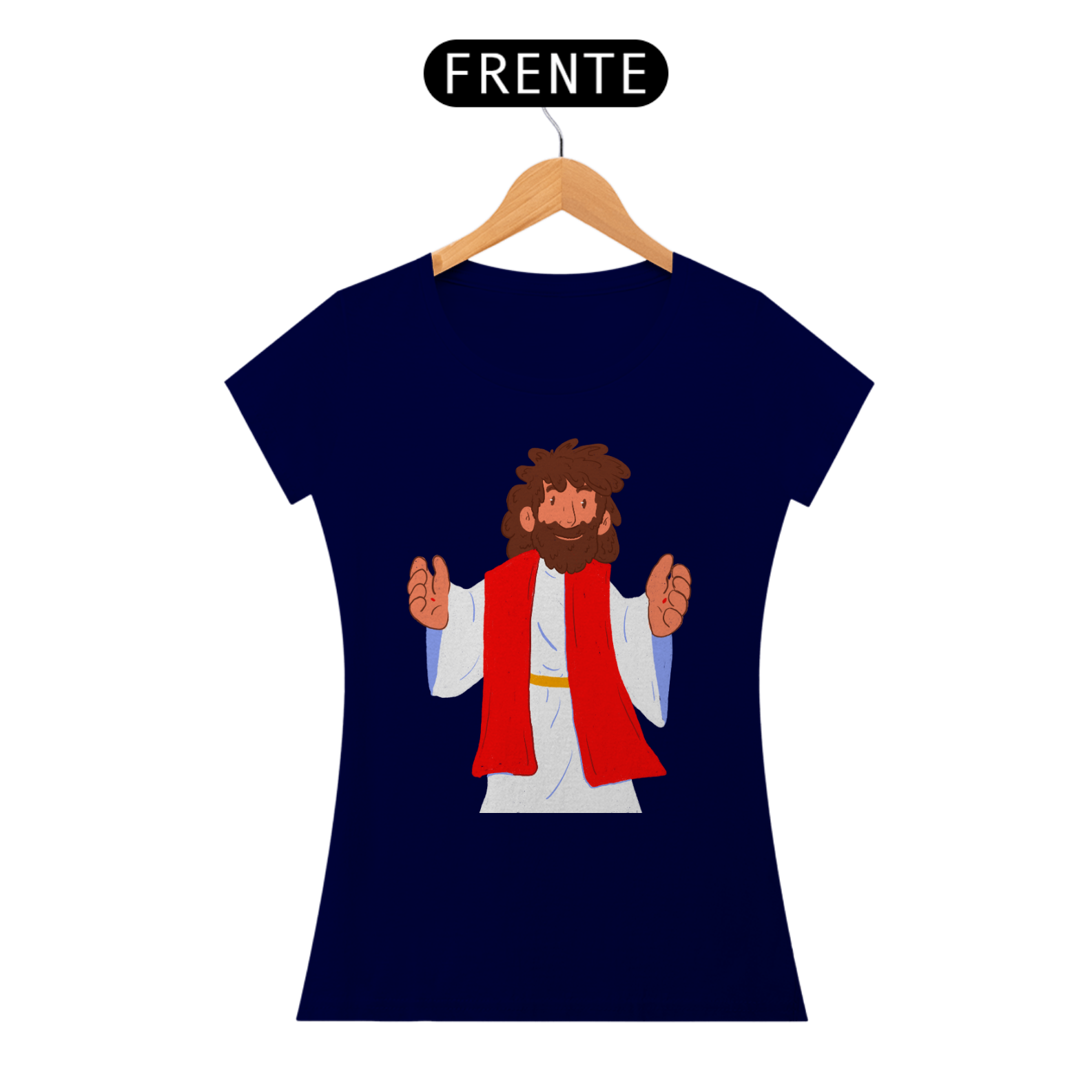 Camiseta cristã feminina com estampa ilustrada de Jesus Cristo no estilo cartoon