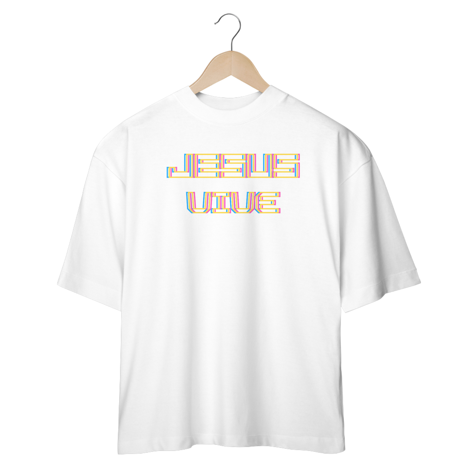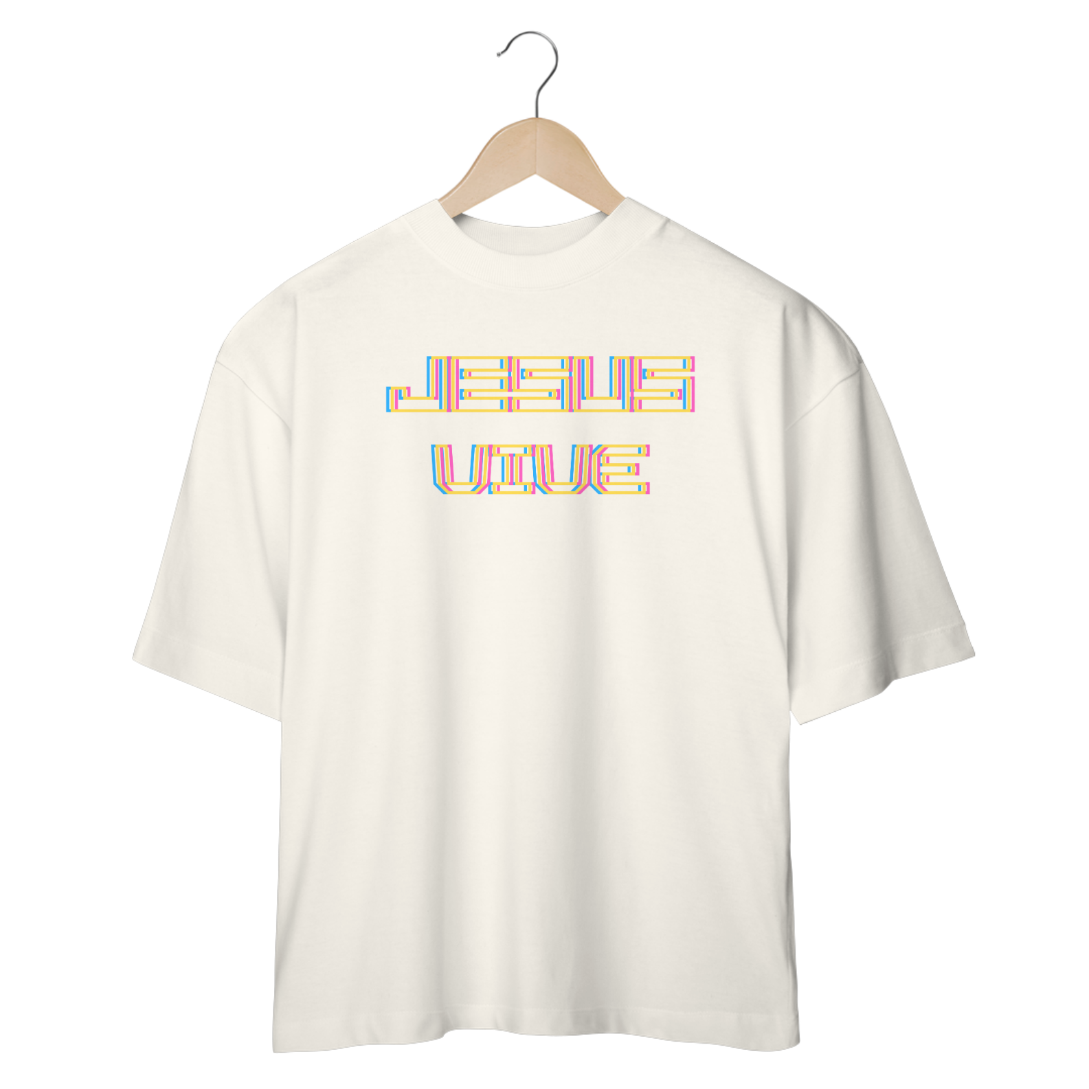Camiseta oversized cristã com estampa escrita Jesus Vive com letras vazadas e com efeito