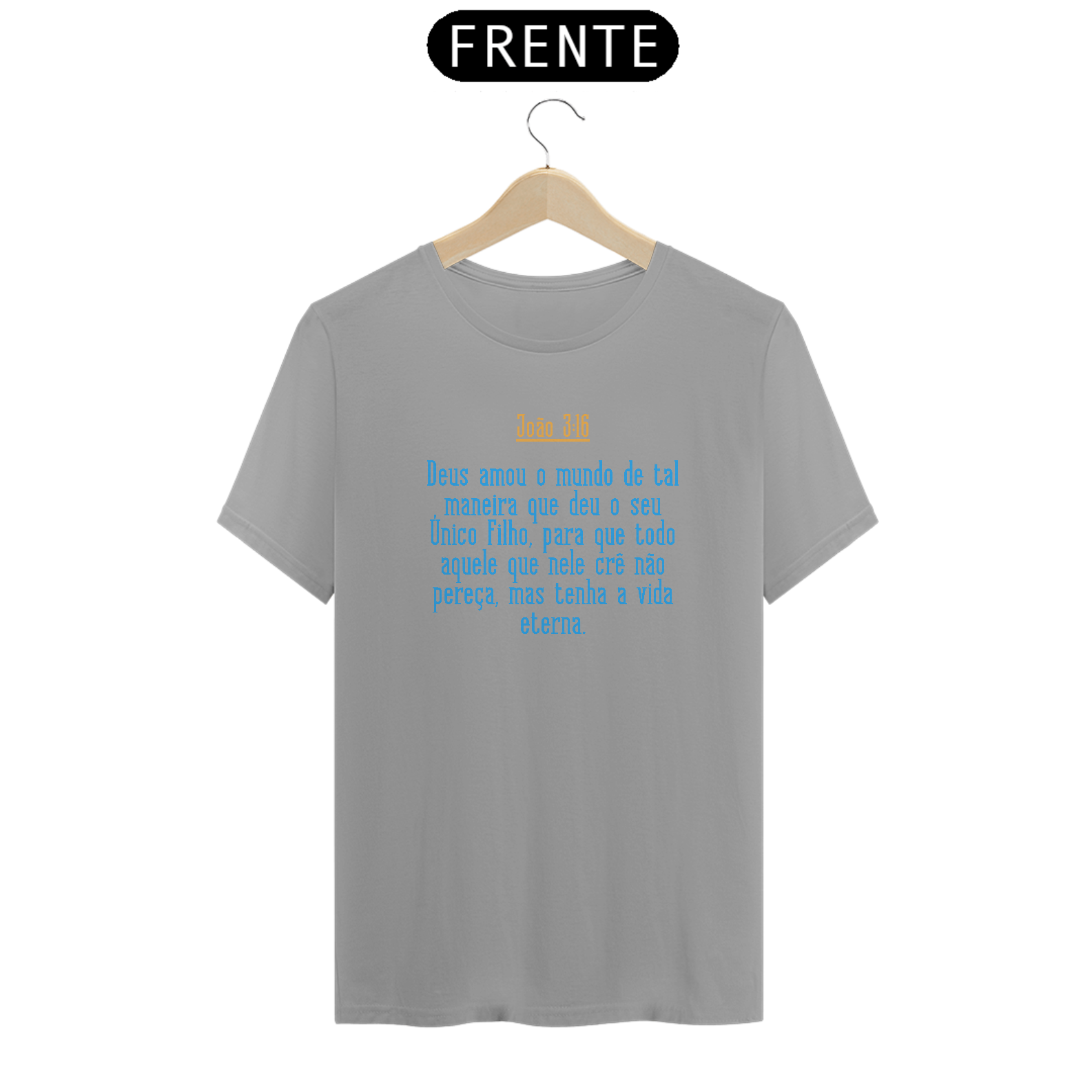 Camisa cristã com estampa citação do versículo bíblico João 3:16 "Deus amou o mundo de tal maneira que deu o seu Único Filho para que todo aquele que nele crê não pereça, mas tenha a vida eterna"