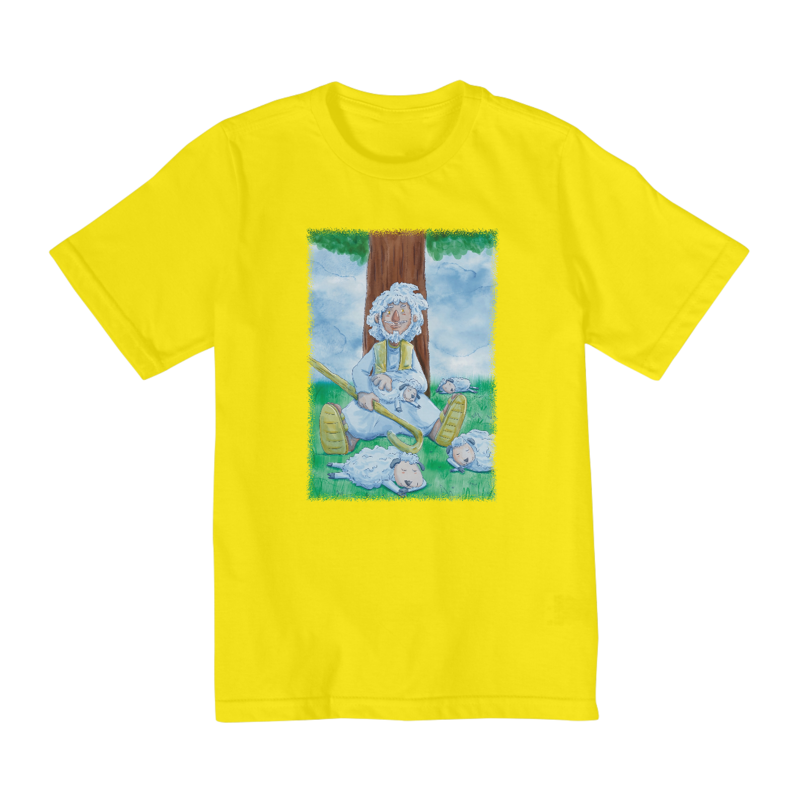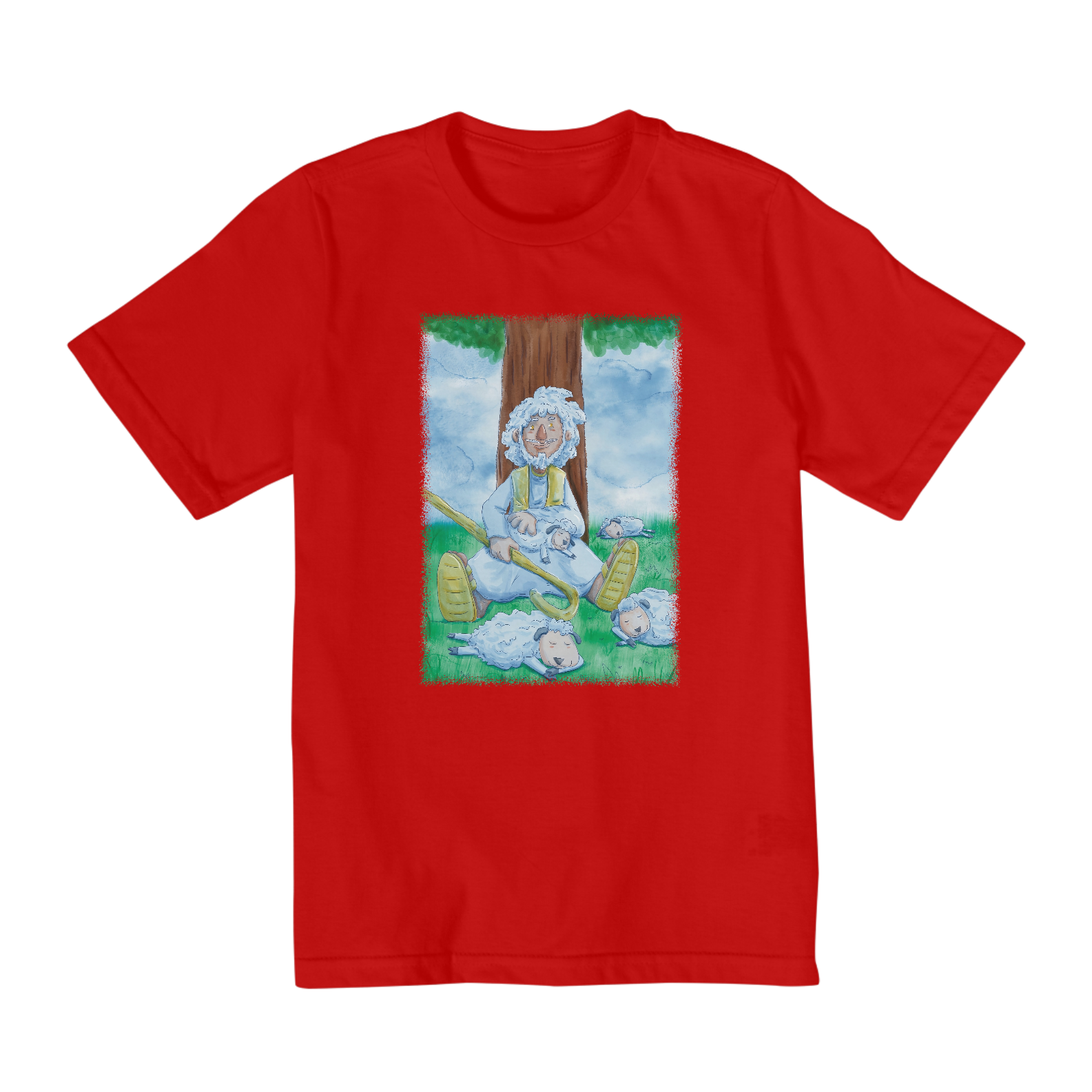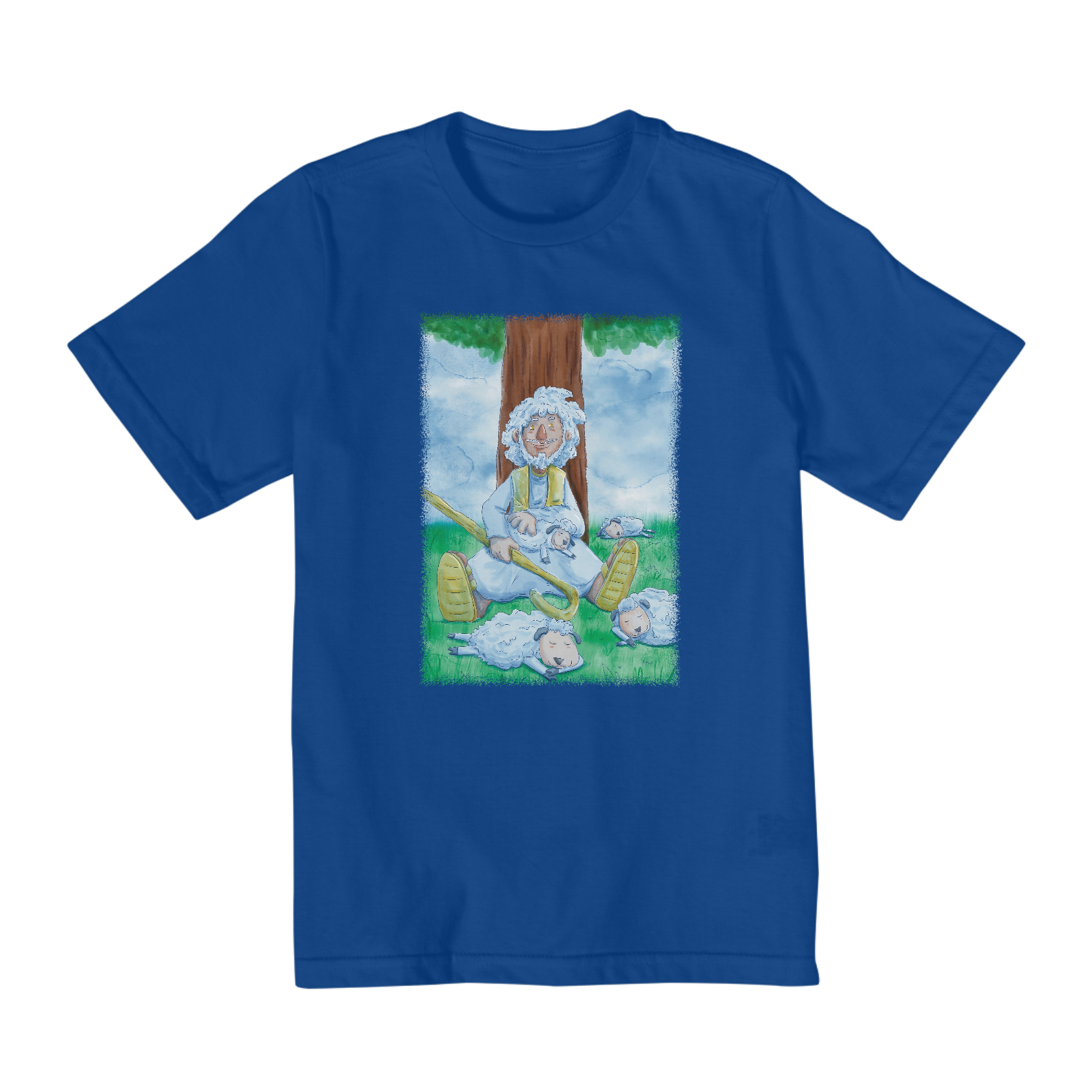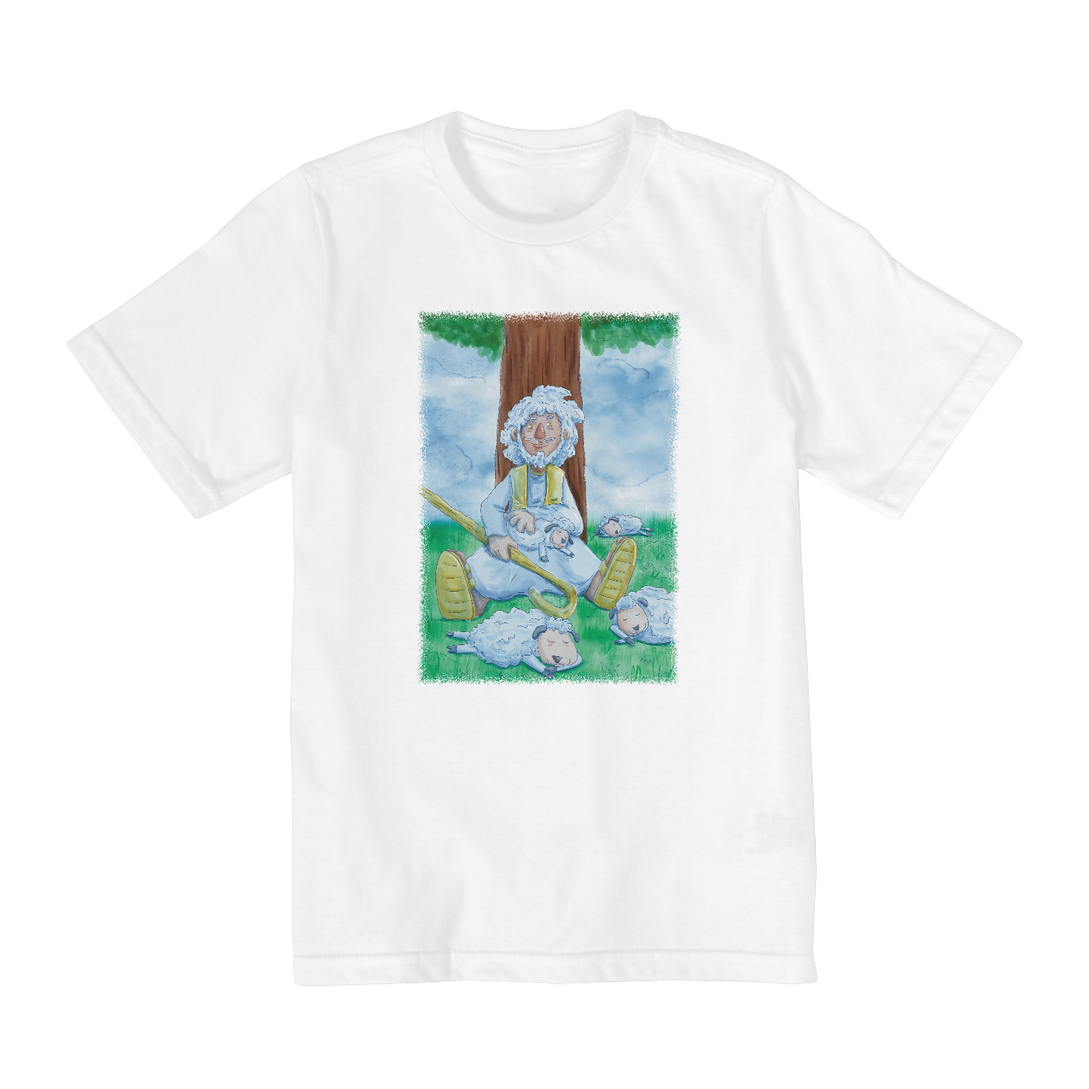 Camisa infantil cristã com ilustração no estilo cartoon e aquarela de Jesus cuidando de suas ovelhas