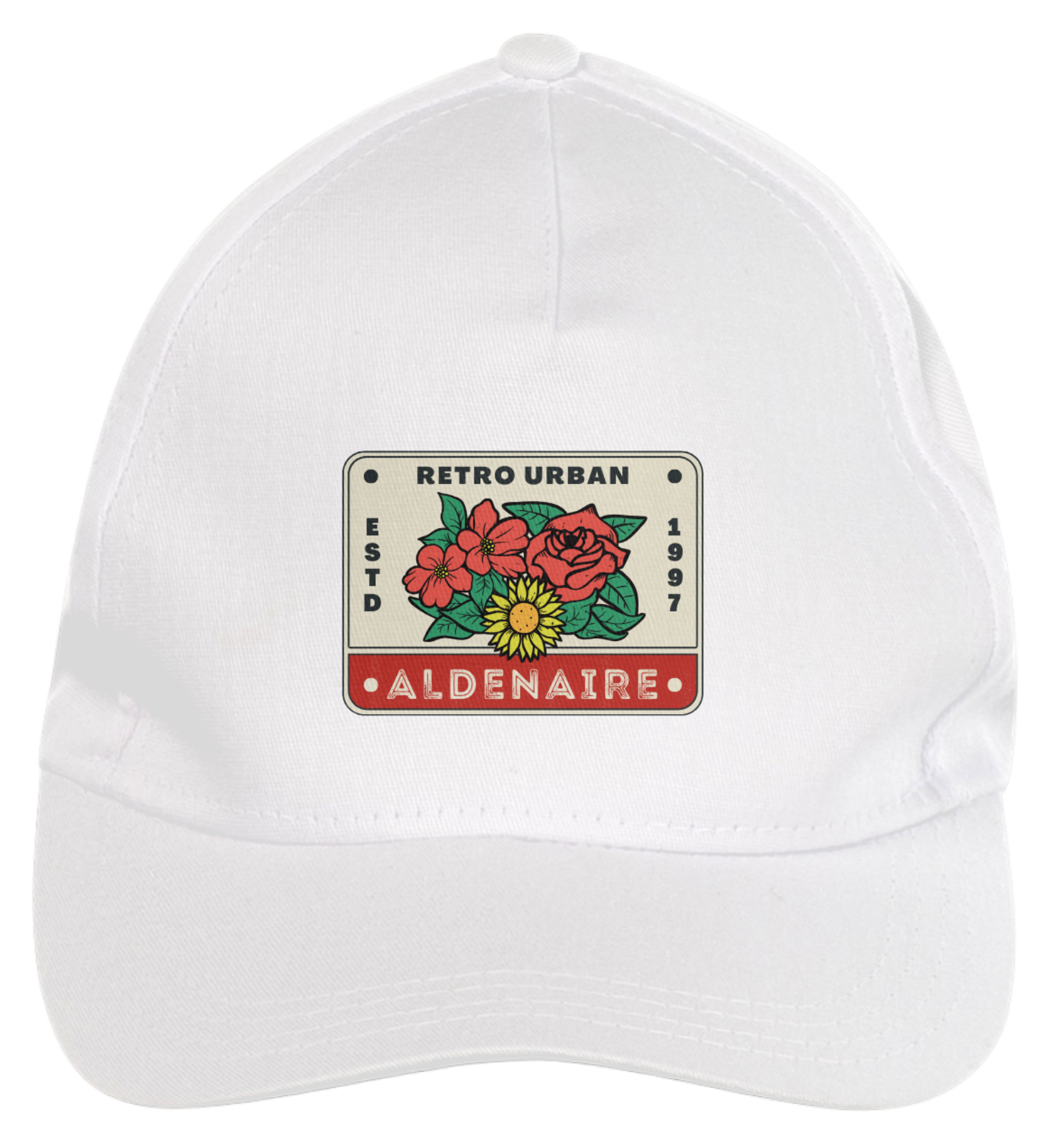 Boné americano com transfer frontal em alta qualidade, aba curva e fecho em tira totalmente regulável com pinos. O modelo veste tamanho "único".