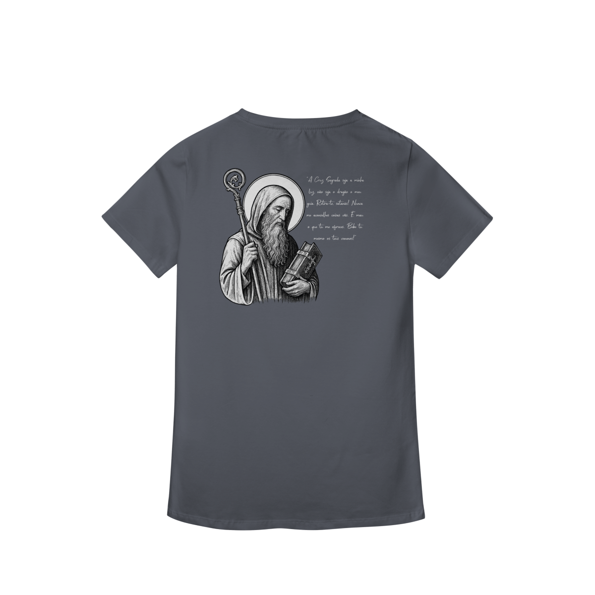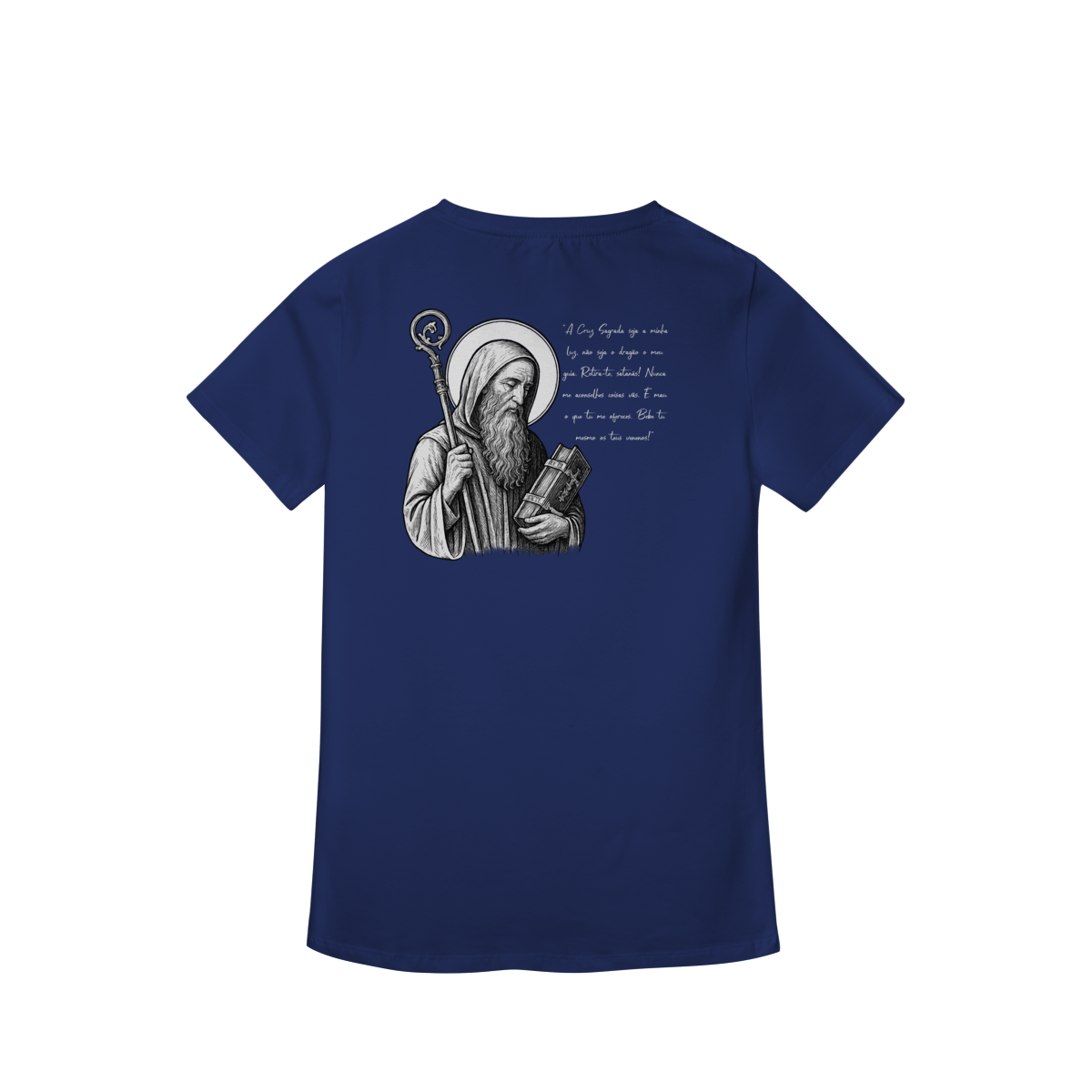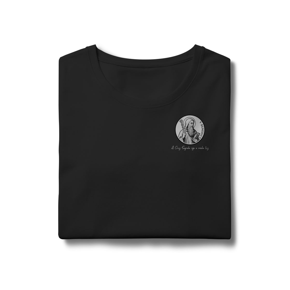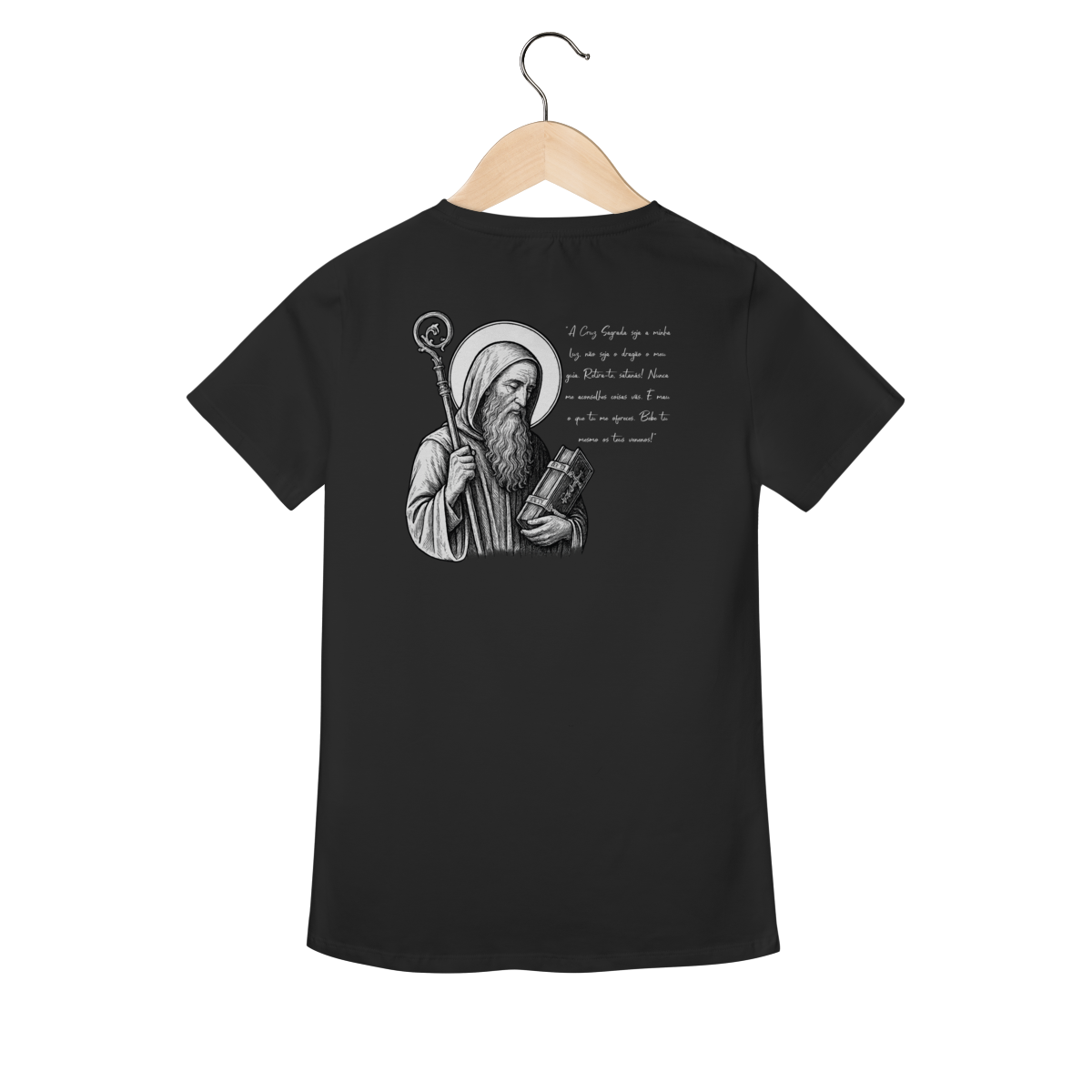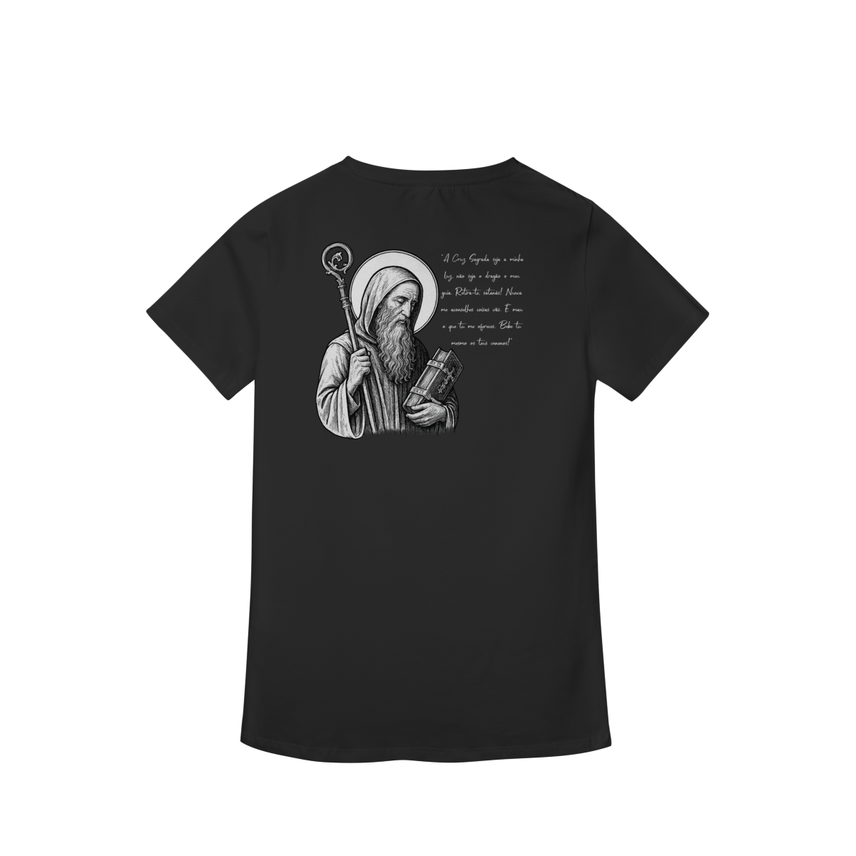 Na parte frontal, a estampa traz uma imagem pequena de São Bento, posicionada no lado esquerdo do peito, e logo abaixo a frase: