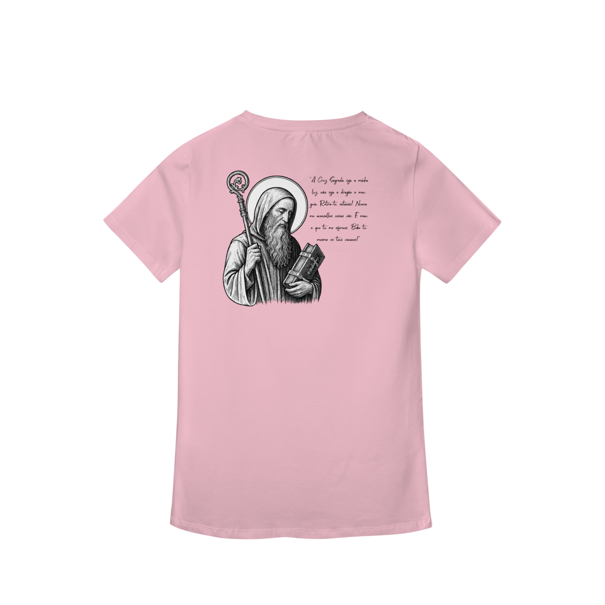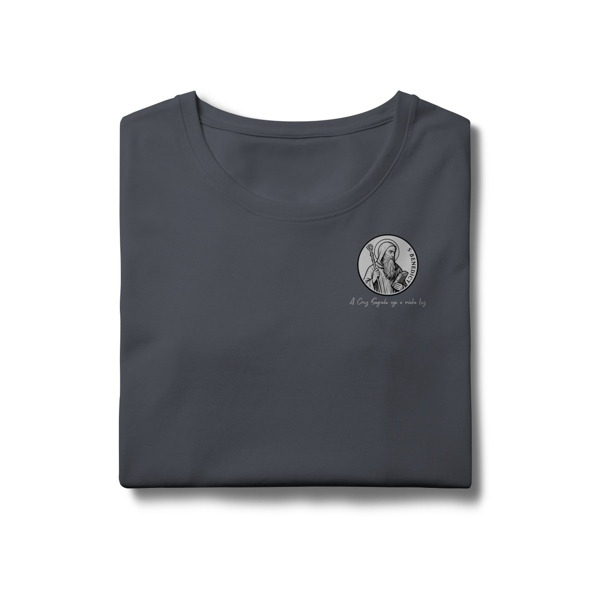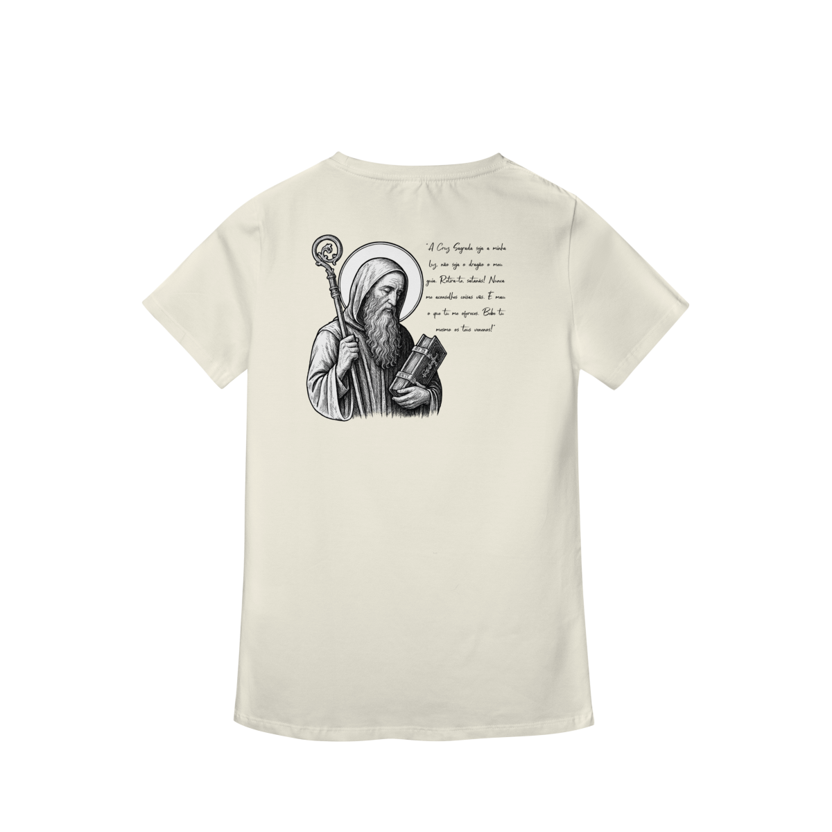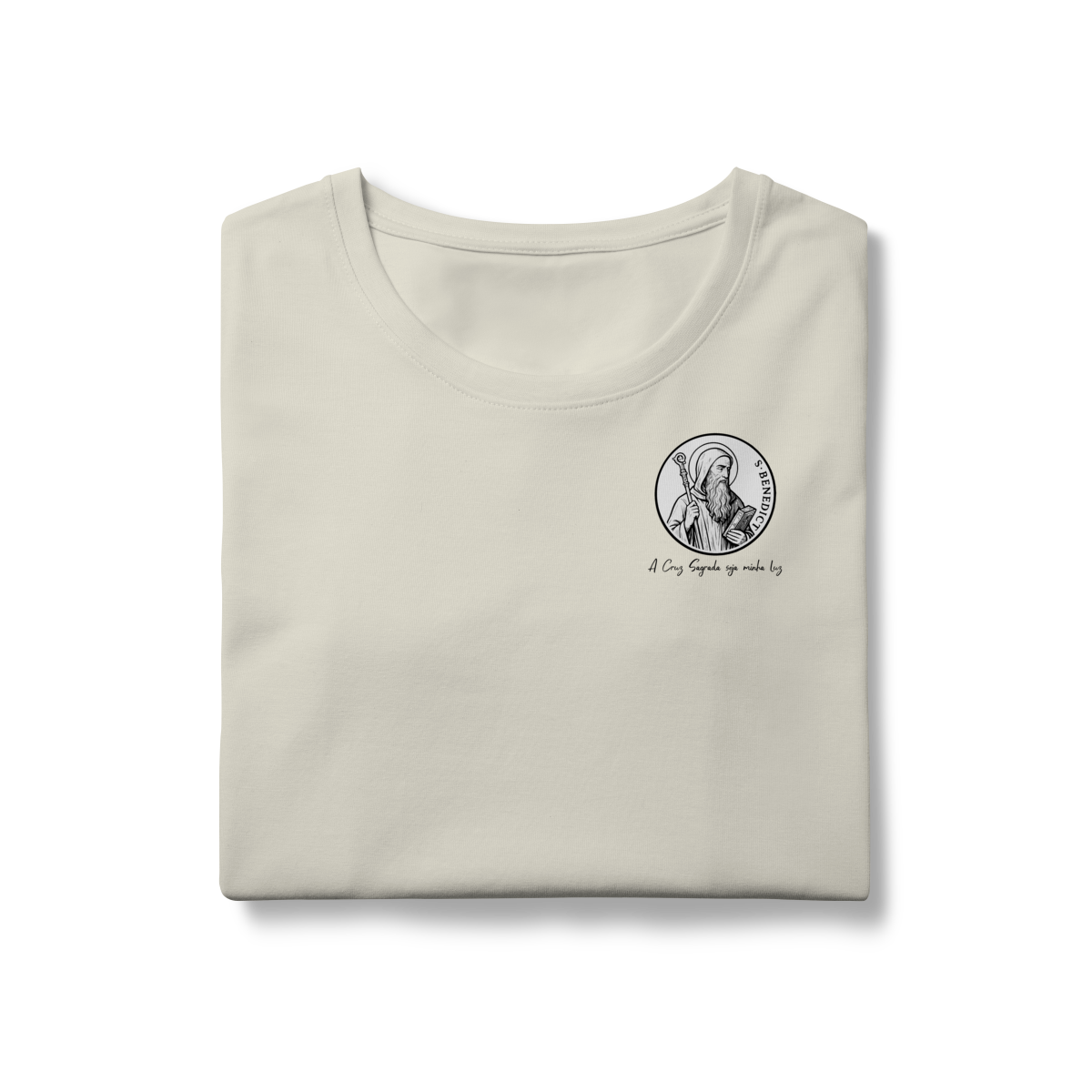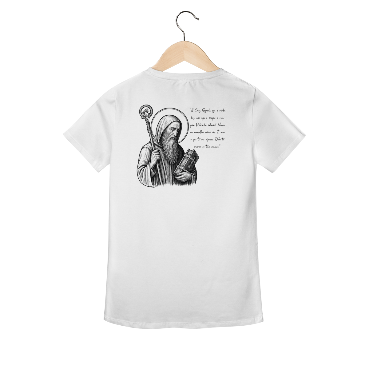 Na parte frontal, a estampa traz uma imagem pequena de São Bento, posicionada no lado esquerdo do peito, e logo abaixo a frase:
