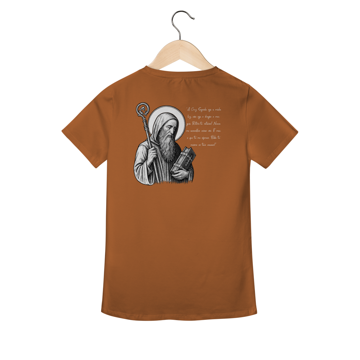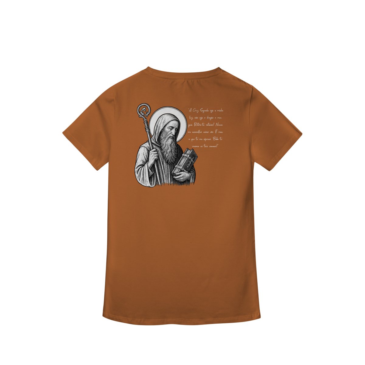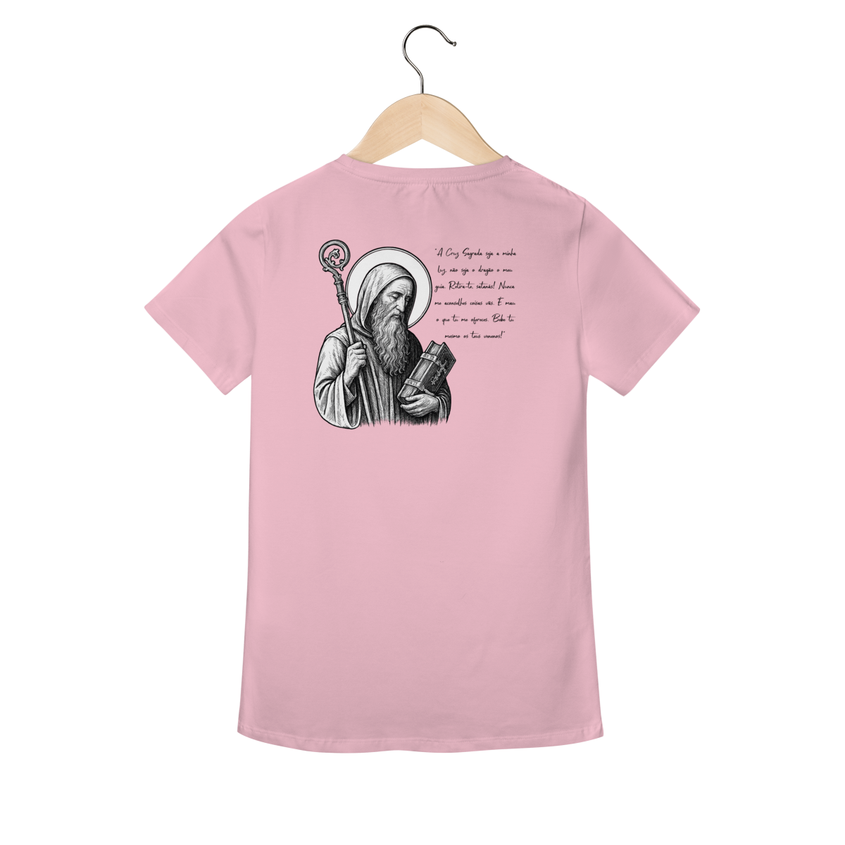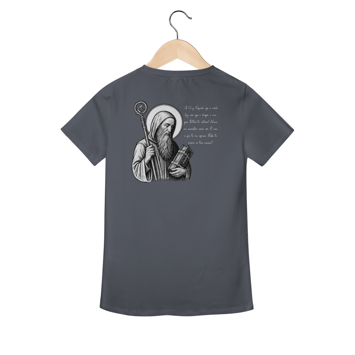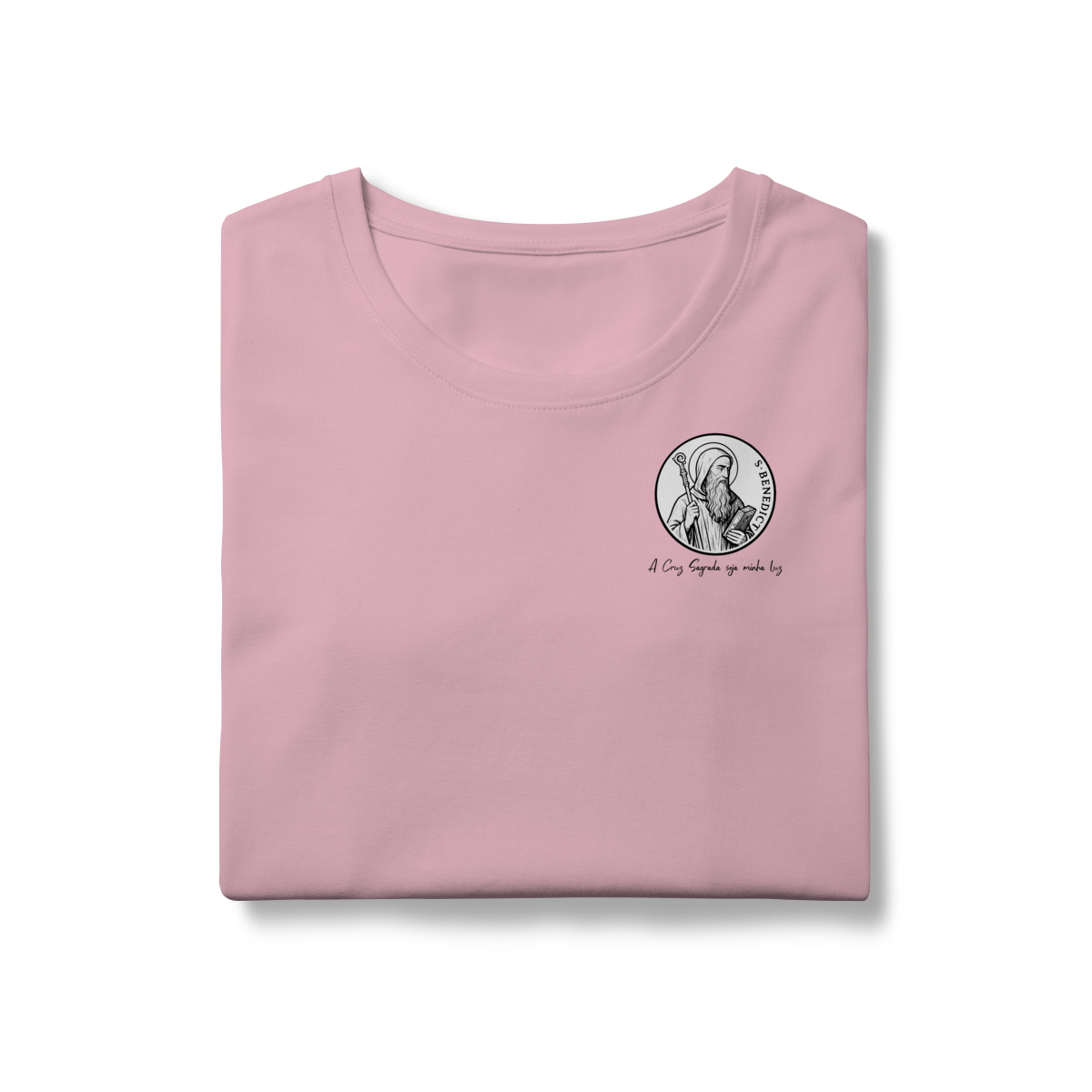 Na parte frontal, a estampa traz uma imagem pequena de São Bento, posicionada no lado esquerdo do peito, e logo abaixo a frase: