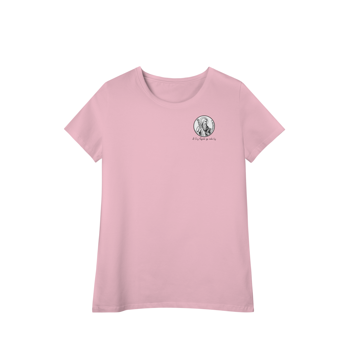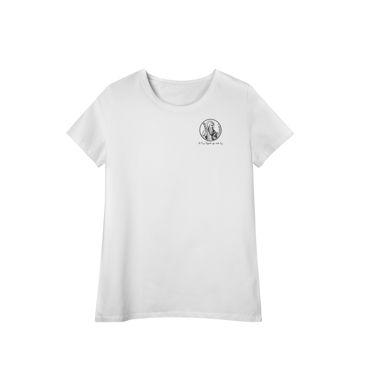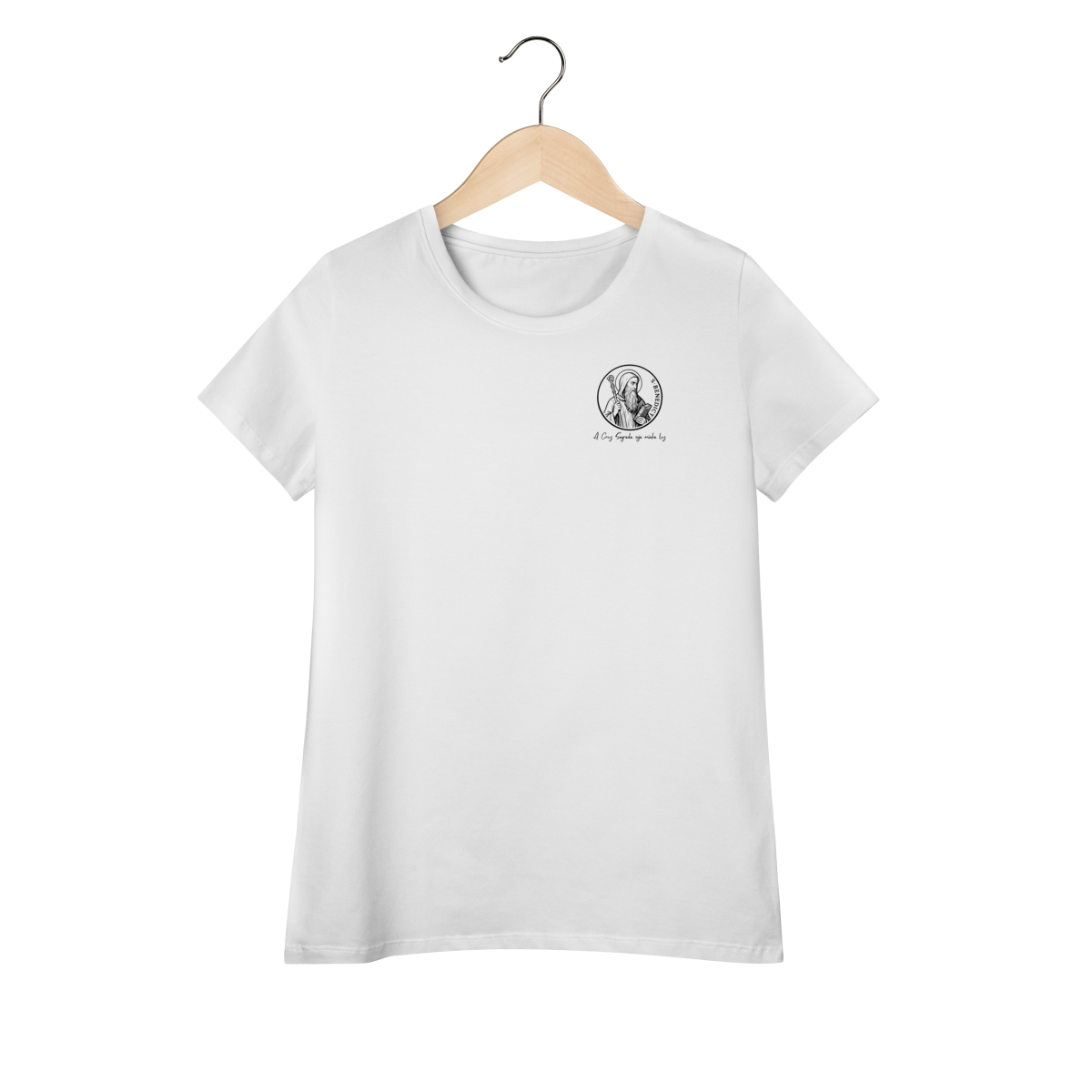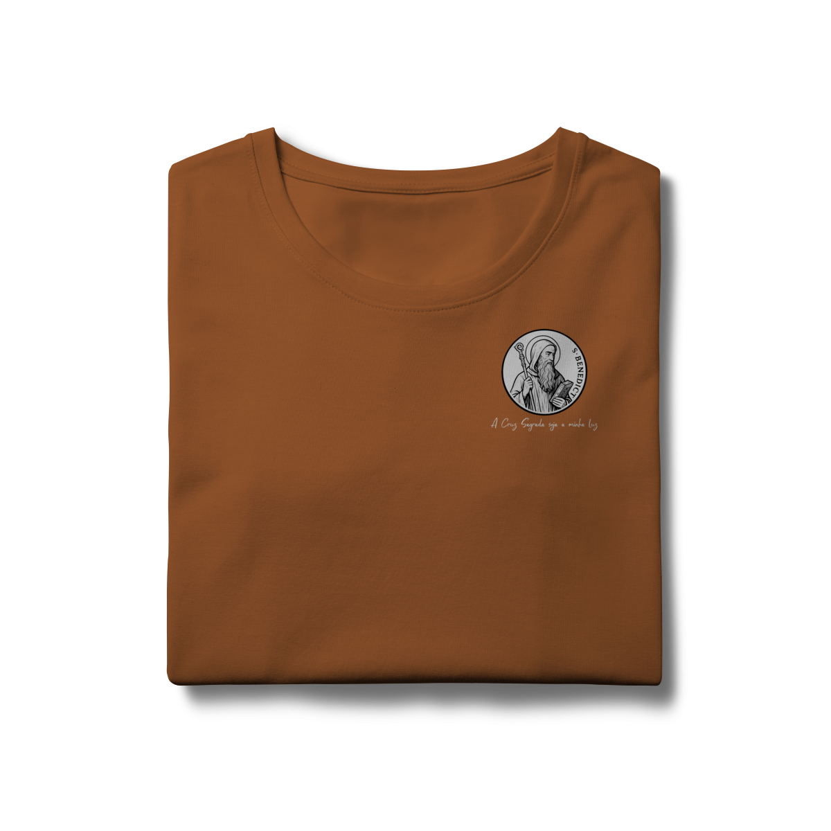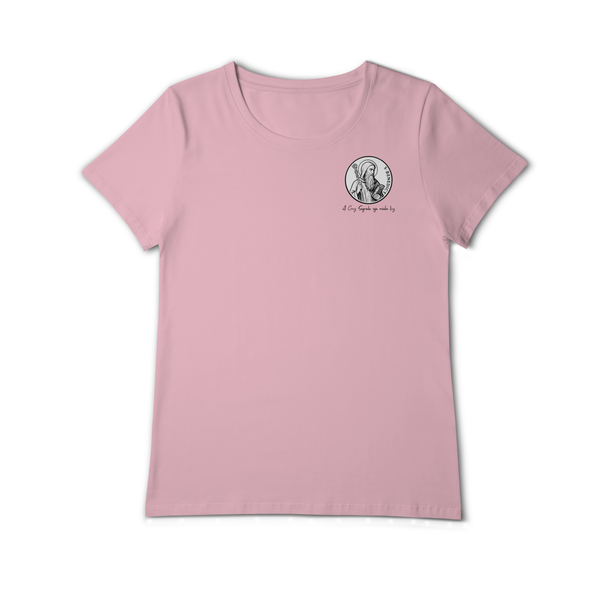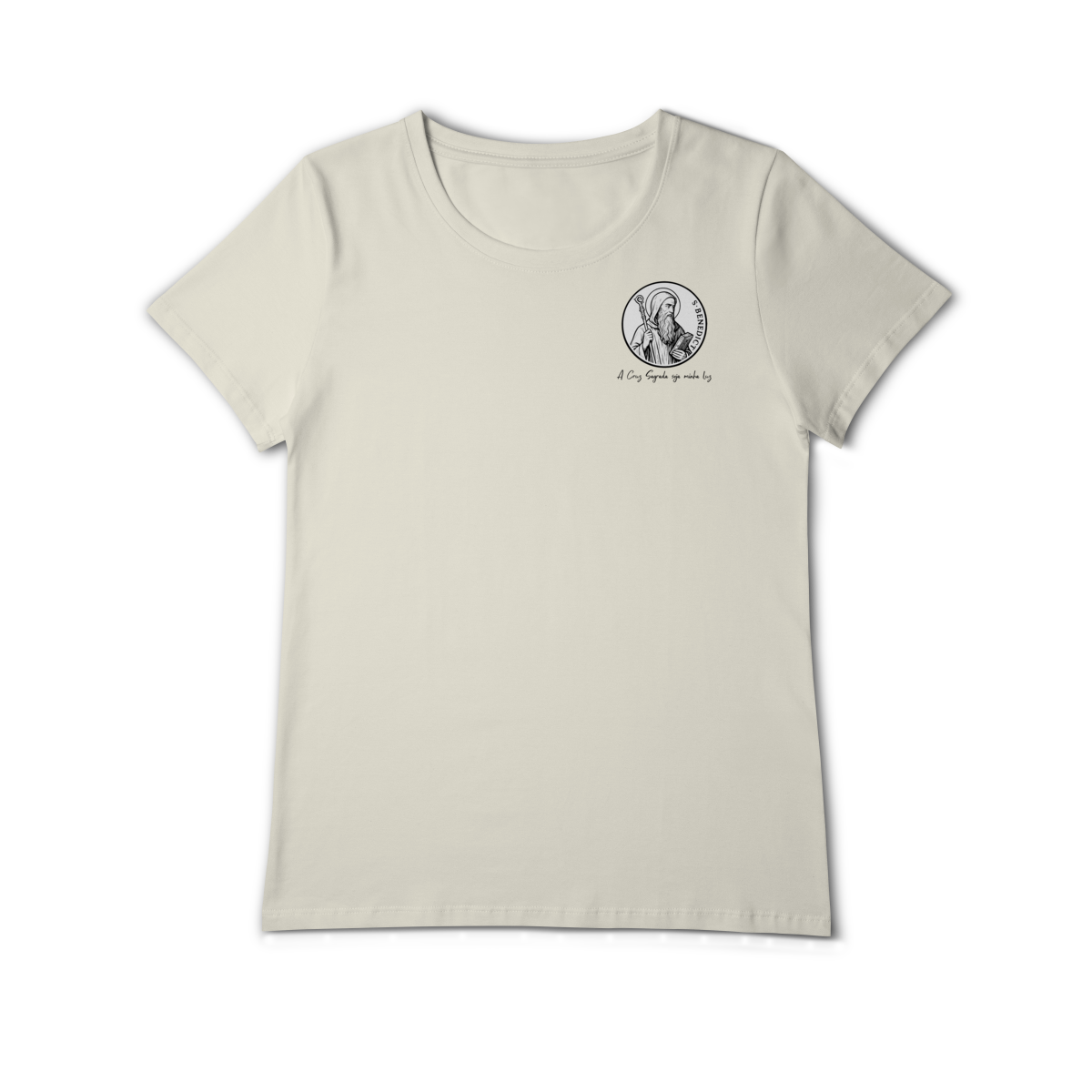 Na parte frontal, a estampa traz uma imagem pequena de São Bento, posicionada no lado esquerdo do peito, e logo abaixo a frase: