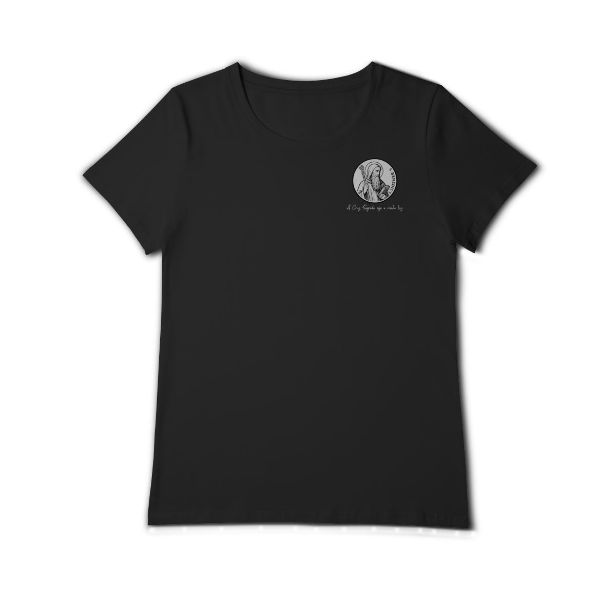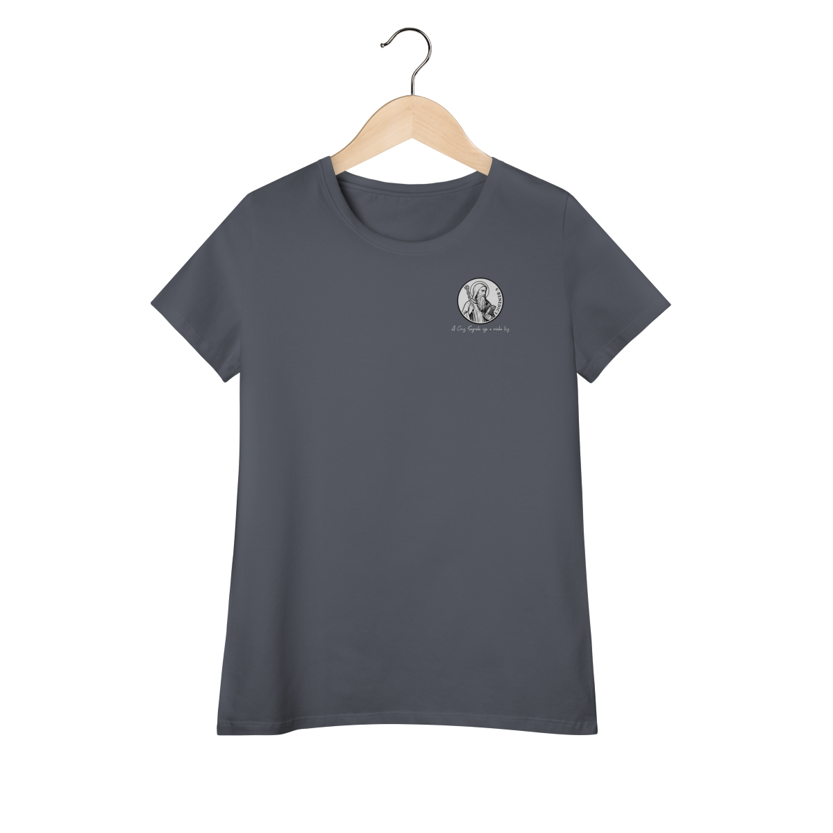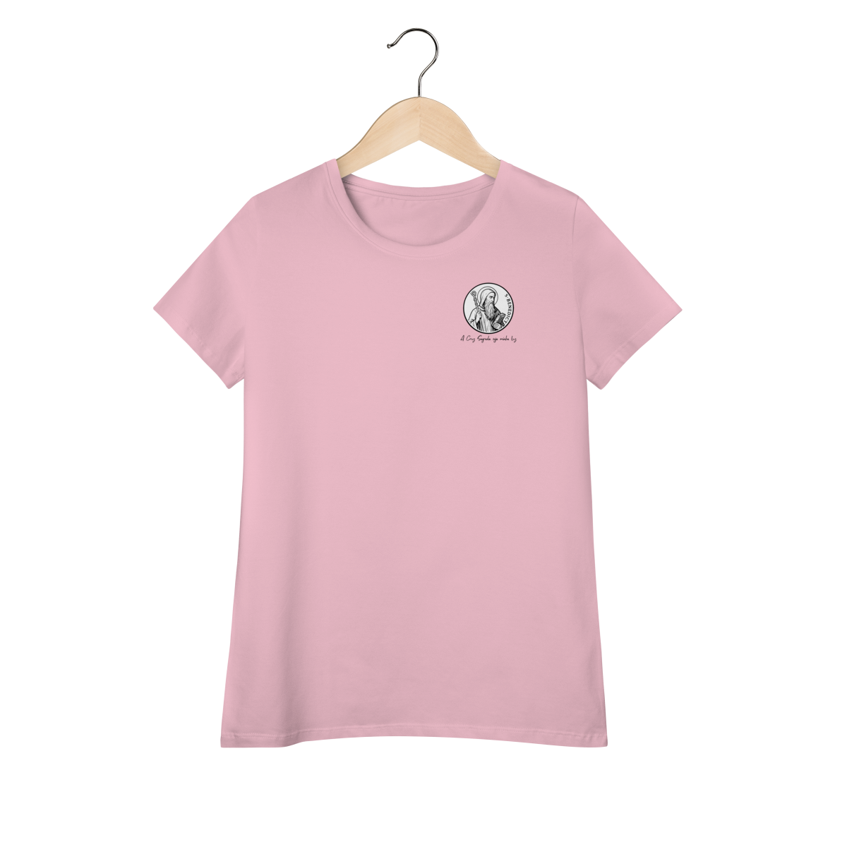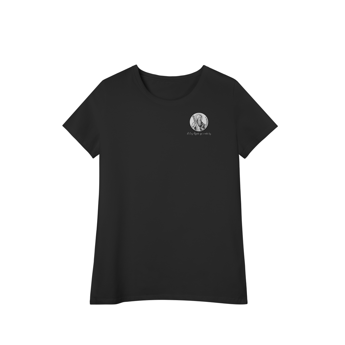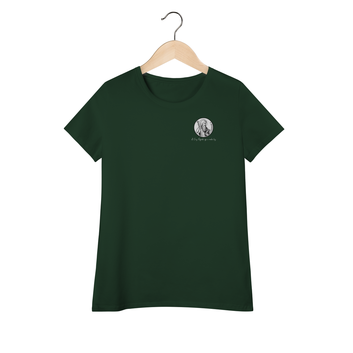 Na parte frontal, a estampa traz uma imagem pequena de São Bento, posicionada no lado esquerdo do peito, e logo abaixo a frase: