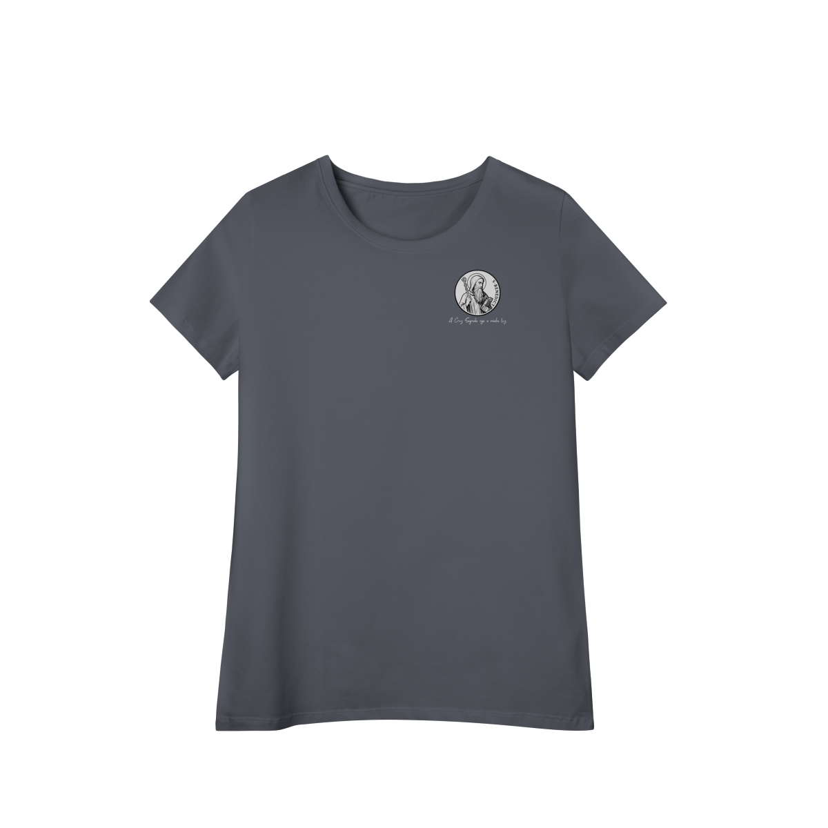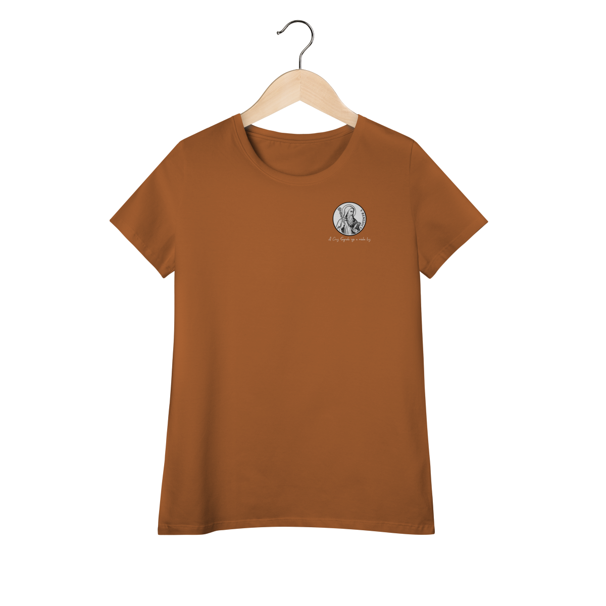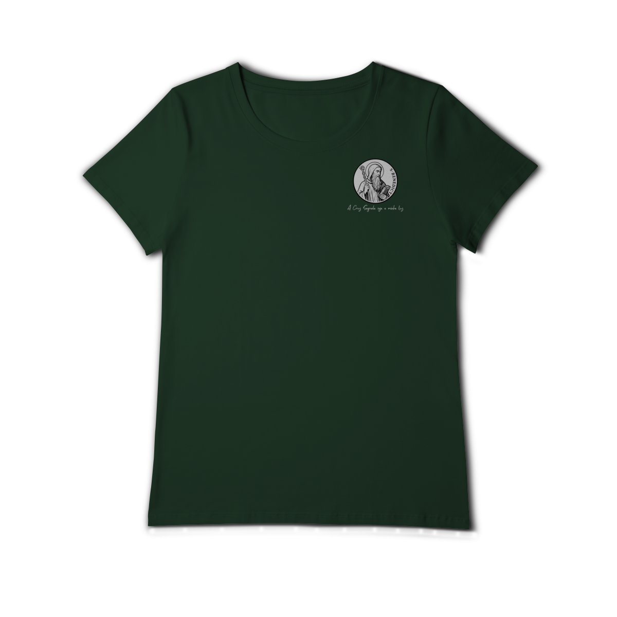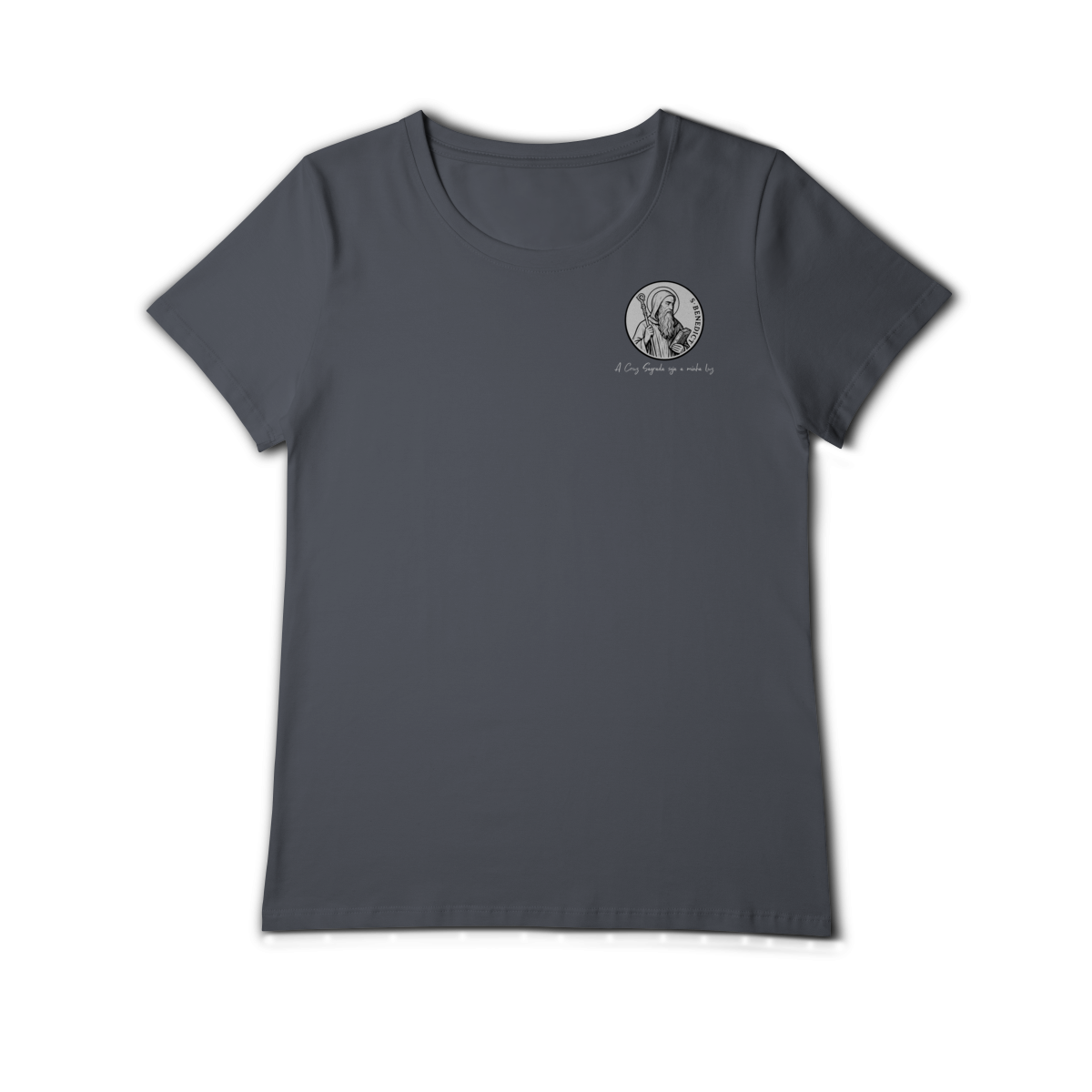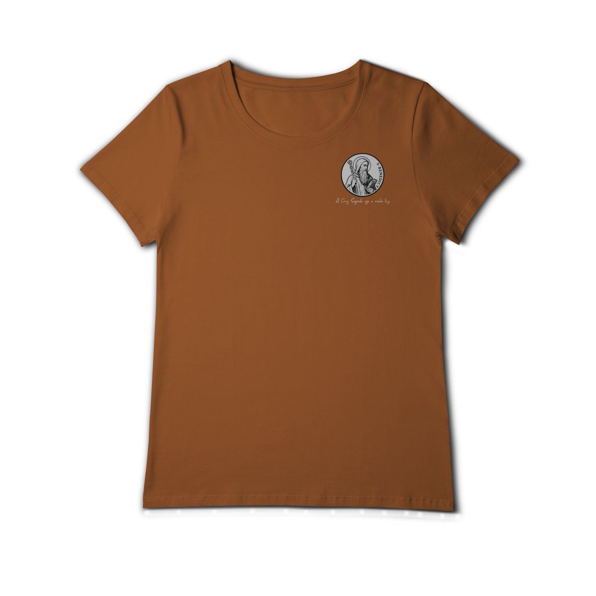 Na parte frontal, a estampa traz uma imagem pequena de São Bento, posicionada no lado esquerdo do peito, e logo abaixo a frase: