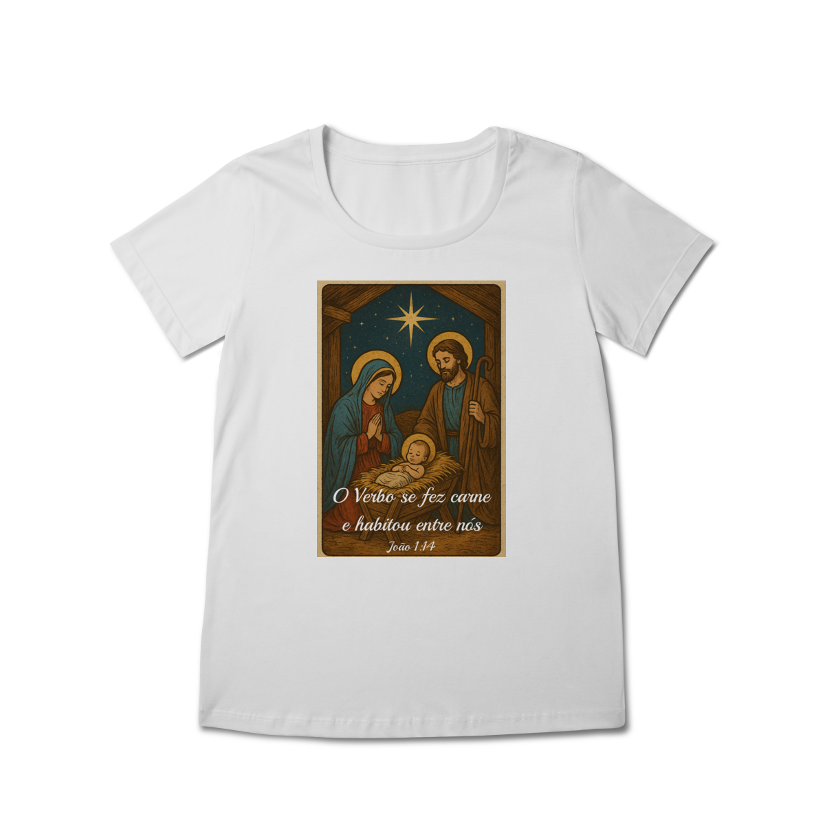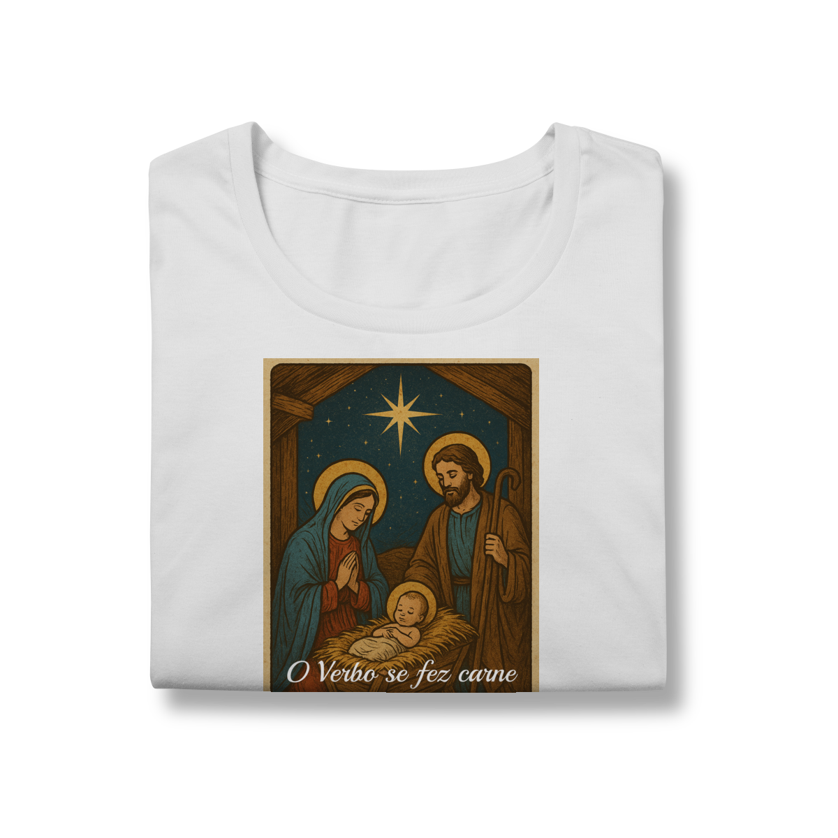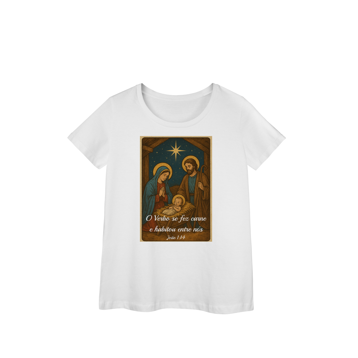 A Baby Long Prime “O Verbo Se Fez Carne” une feminilidade, qualidade e espiritualidade em uma peça sofisticada. A estampa traz a cena clássica do presépio — Maria, José e o Menino Jesus iluminados pela Estrela de Belém — acompanhada da passagem “O Verbo se fez carne e habitou entre nós — João 1:14”.