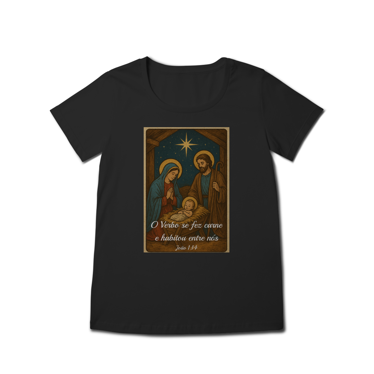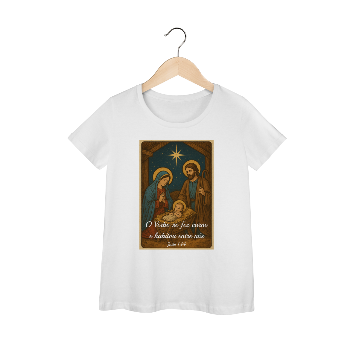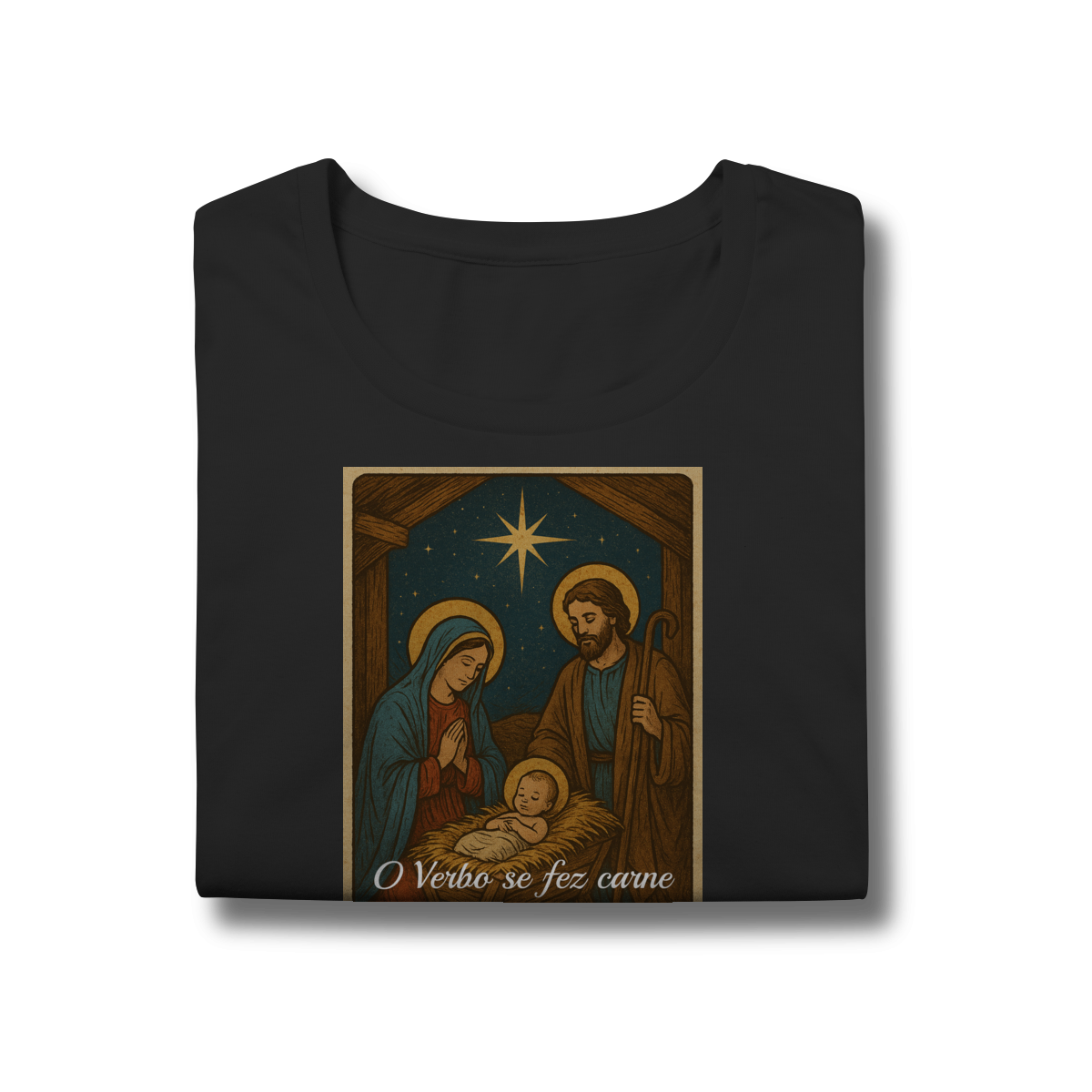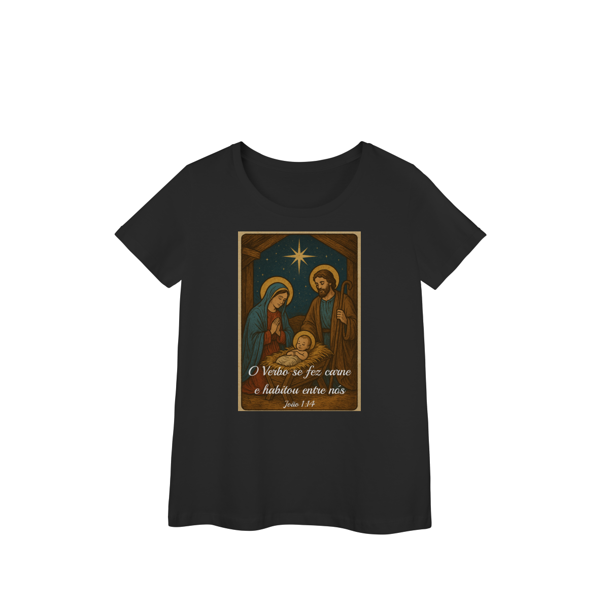 A Baby Long Prime “O Verbo Se Fez Carne” une feminilidade, qualidade e espiritualidade em uma peça sofisticada. A estampa traz a cena clássica do presépio — Maria, José e o Menino Jesus iluminados pela Estrela de Belém — acompanhada da passagem “O Verbo se fez carne e habitou entre nós — João 1:14”.