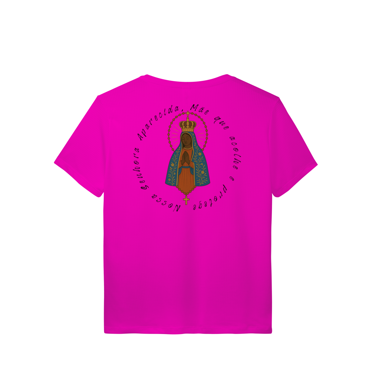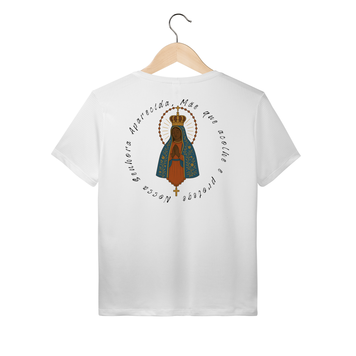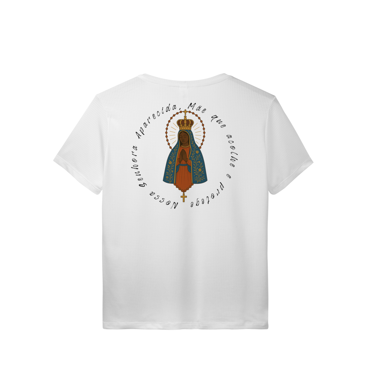 Nas costas, a arte grande de Nossa Senhora Aparecida se destaca de forma elegante e impactante, criando um visual marcante e inspirador.