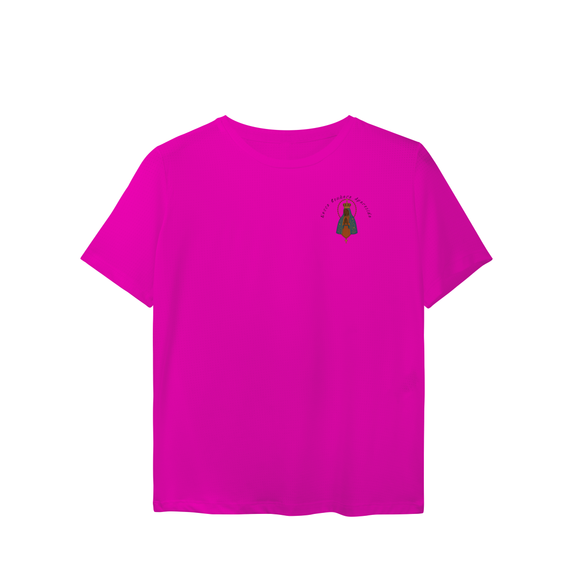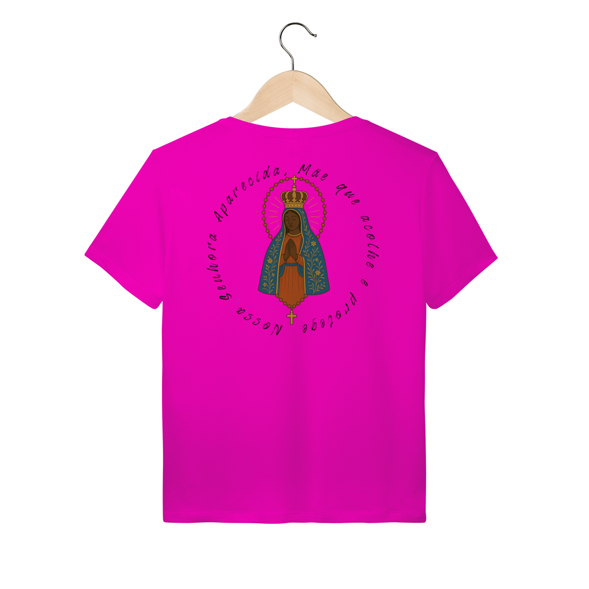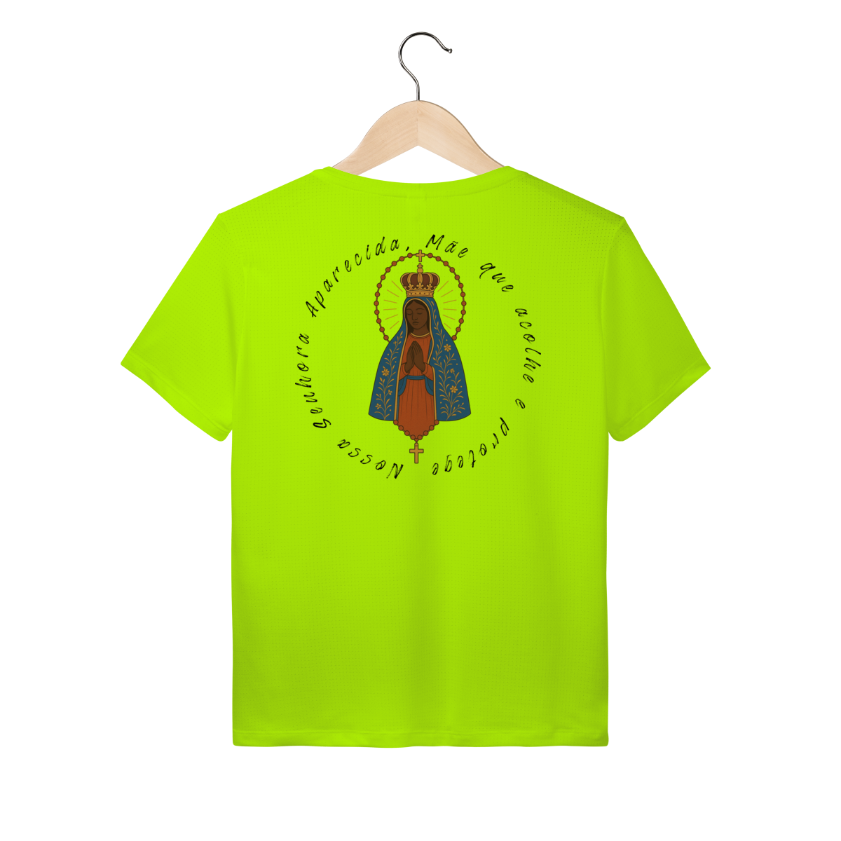 Nas costas, a arte grande de Nossa Senhora Aparecida se destaca de forma elegante e impactante, criando um visual marcante e inspirador.