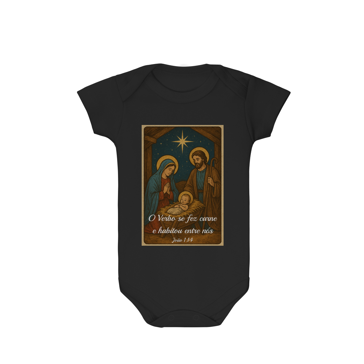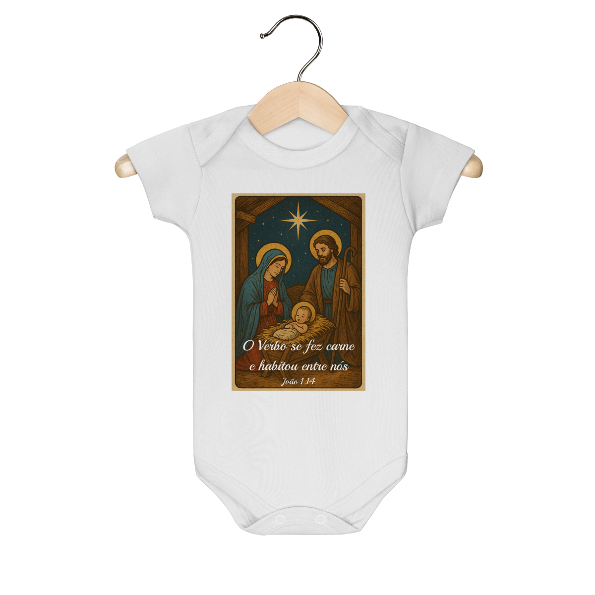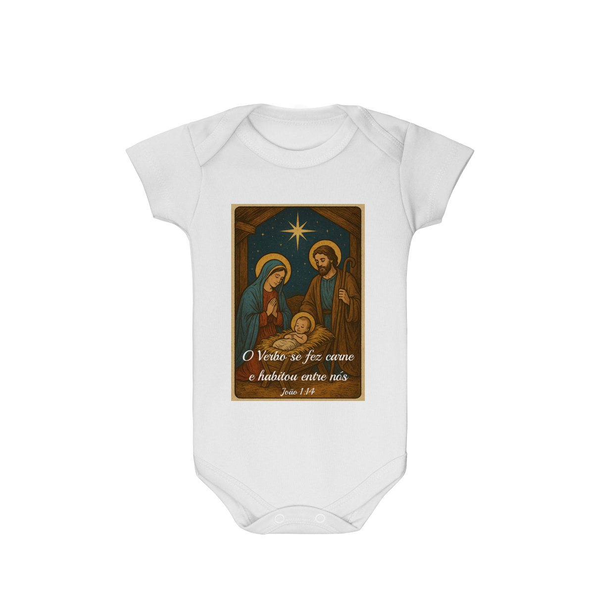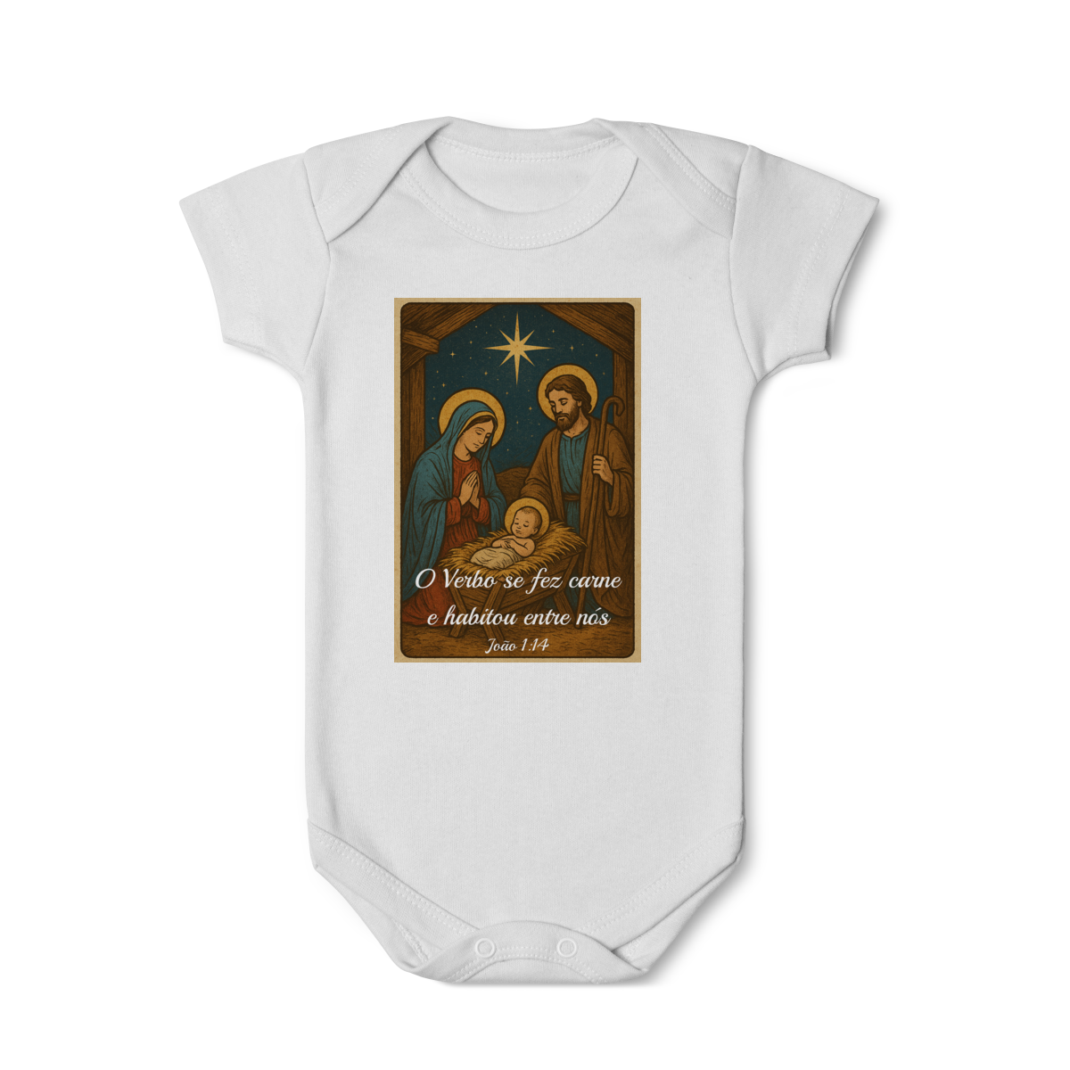 O Body Infantil “O Verbo Se Fez Carne” traz a doçura do presépio em uma arte suave e cheia de significado. A estampa apresenta Maria, José e o Menino Jesus sob a luz da Estrela de Belém, acompanhados da passagem bíblica “O Verbo se fez carne e habitou entre nós — João 1:14”.