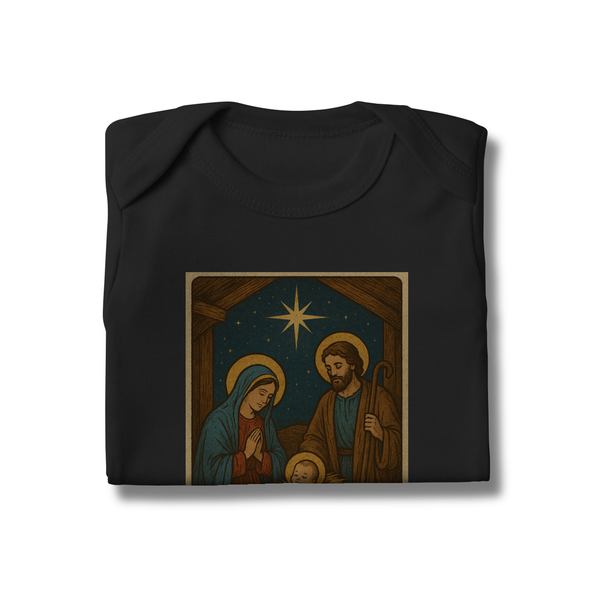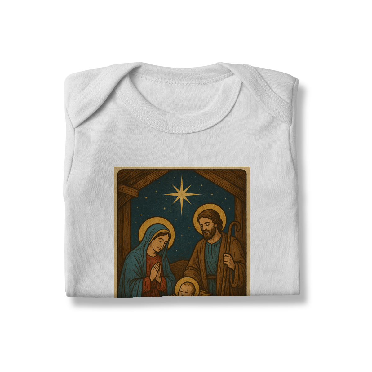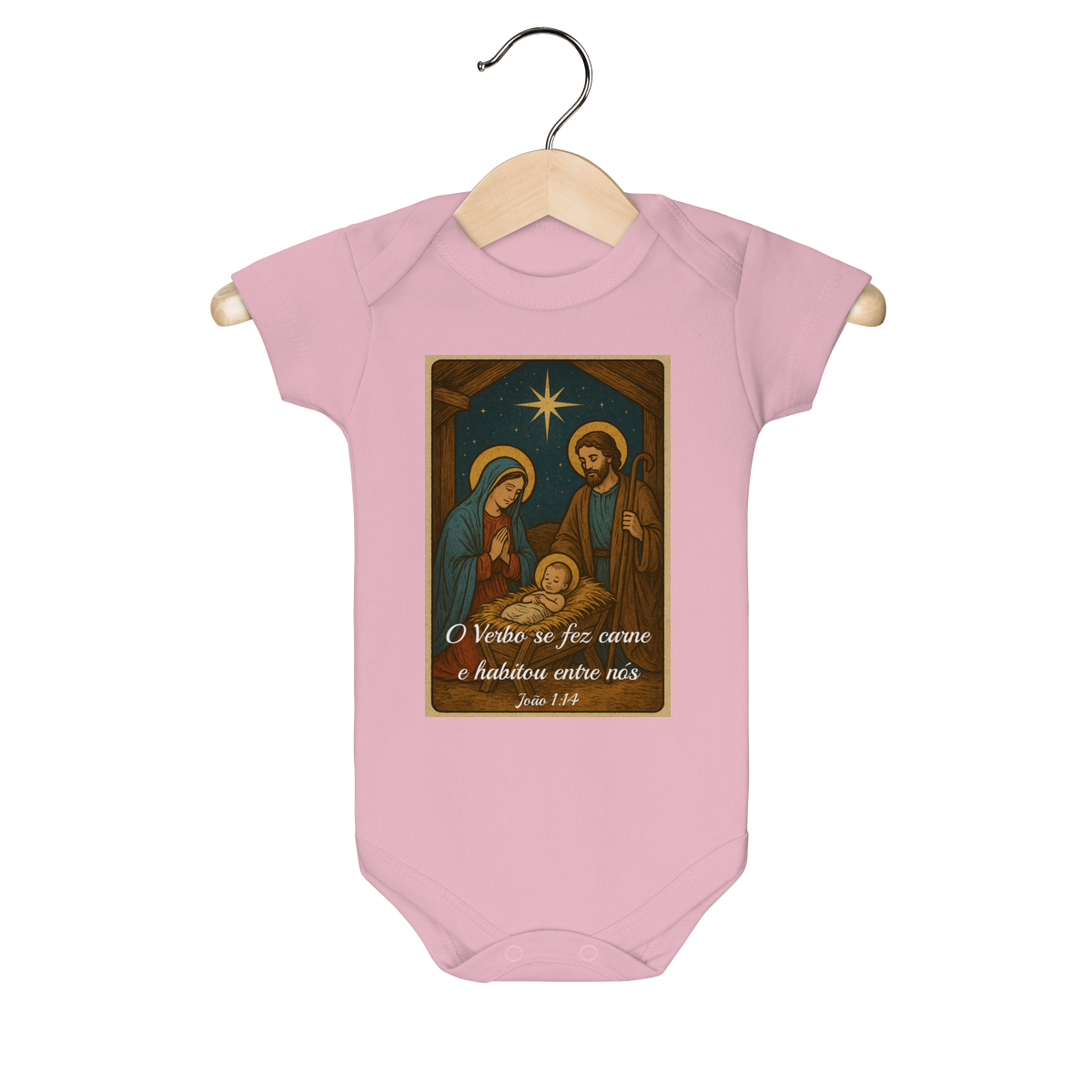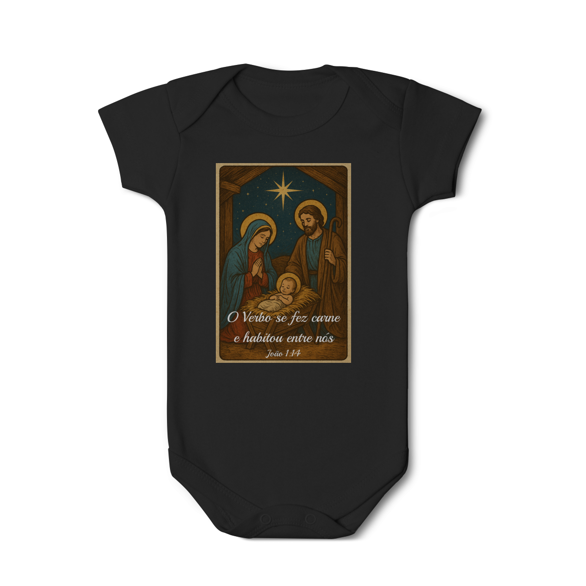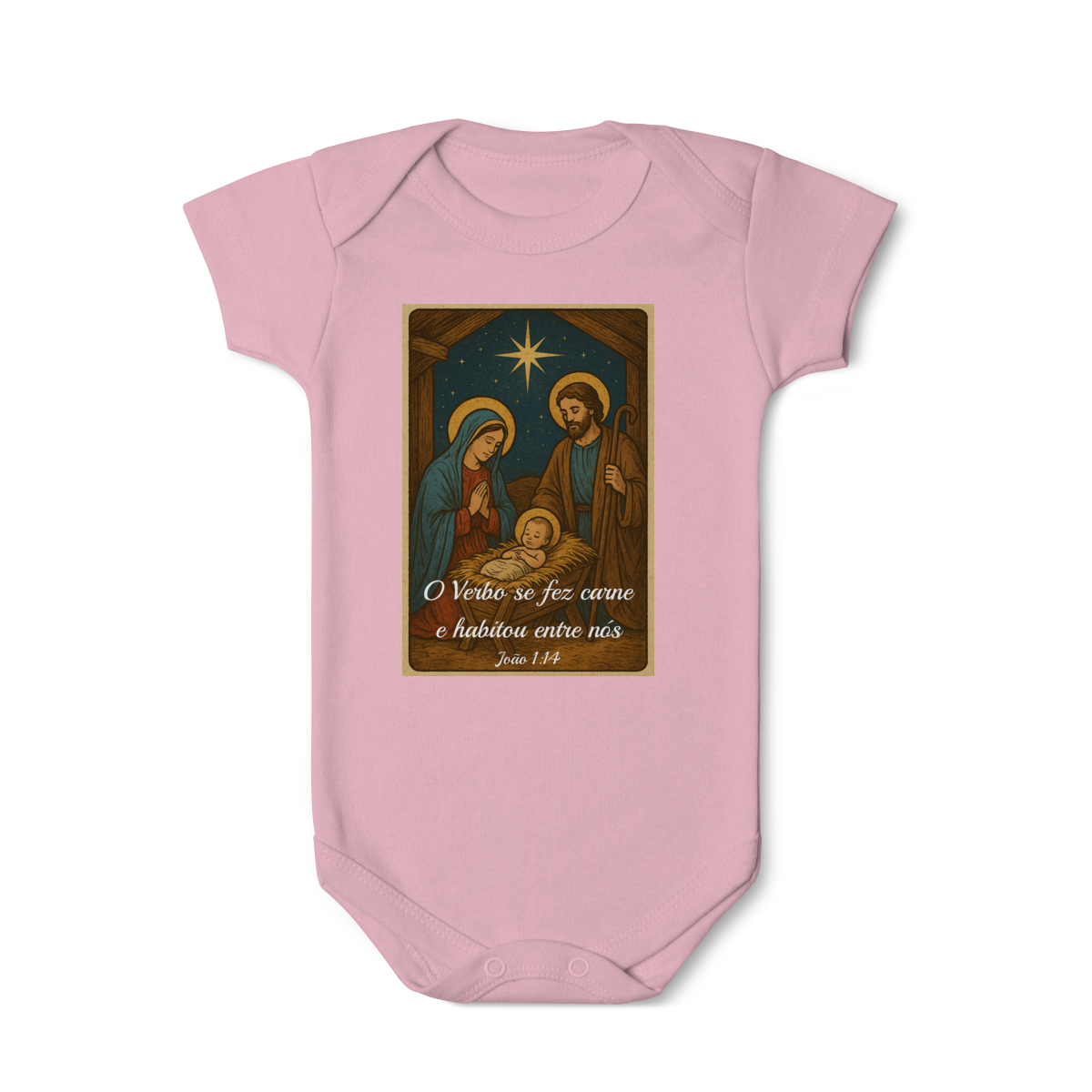 O Body Infantil “O Verbo Se Fez Carne” traz a doçura do presépio em uma arte suave e cheia de significado. A estampa apresenta Maria, José e o Menino Jesus sob a luz da Estrela de Belém, acompanhados da passagem bíblica “O Verbo se fez carne e habitou entre nós — João 1:14”.