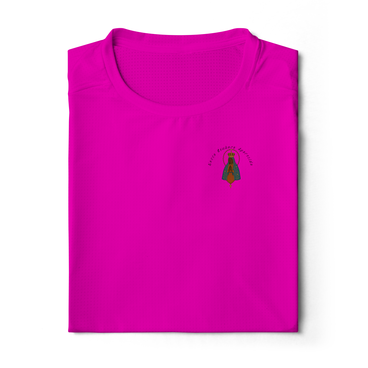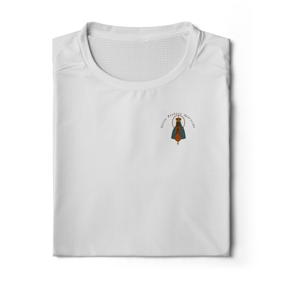 Nas costas, a estampa grande de Nossa Senhora Aparecida se destaca, transmitindo espiritualidade e beleza em cada traço.