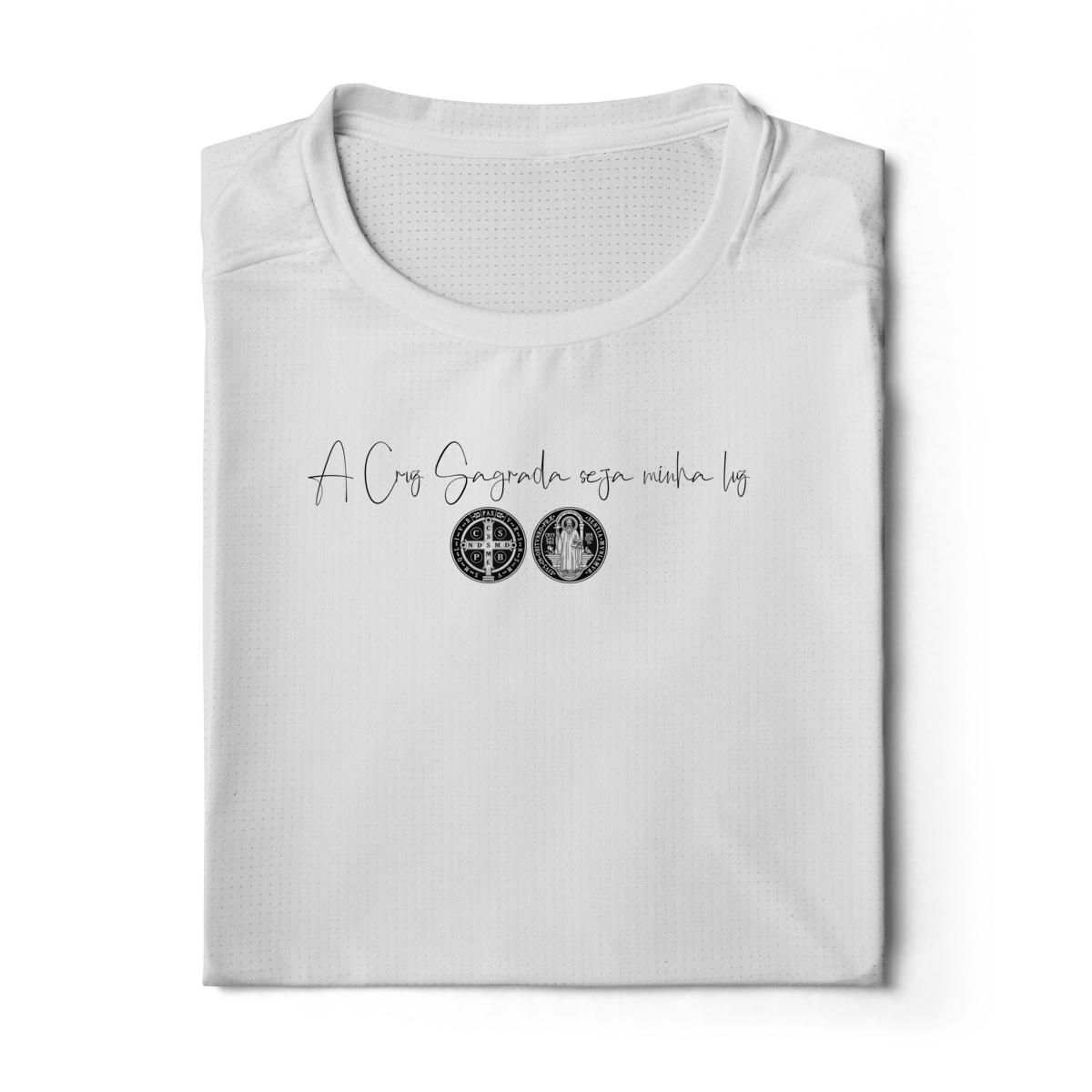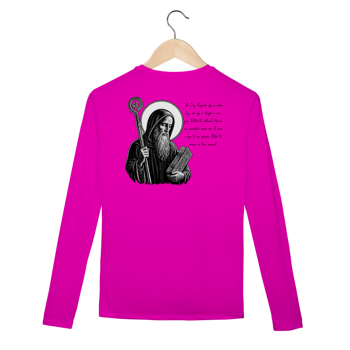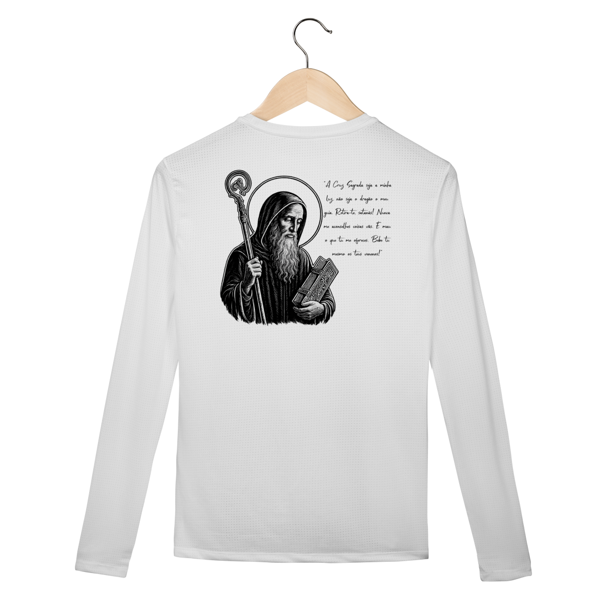 Nas costas, uma estampa grande e detalhada de São Bento acompanhada da Oração da Medalha de São Bento, símbolo tradicional de proteção espiritual e intercessão poderosa contra todo mal.