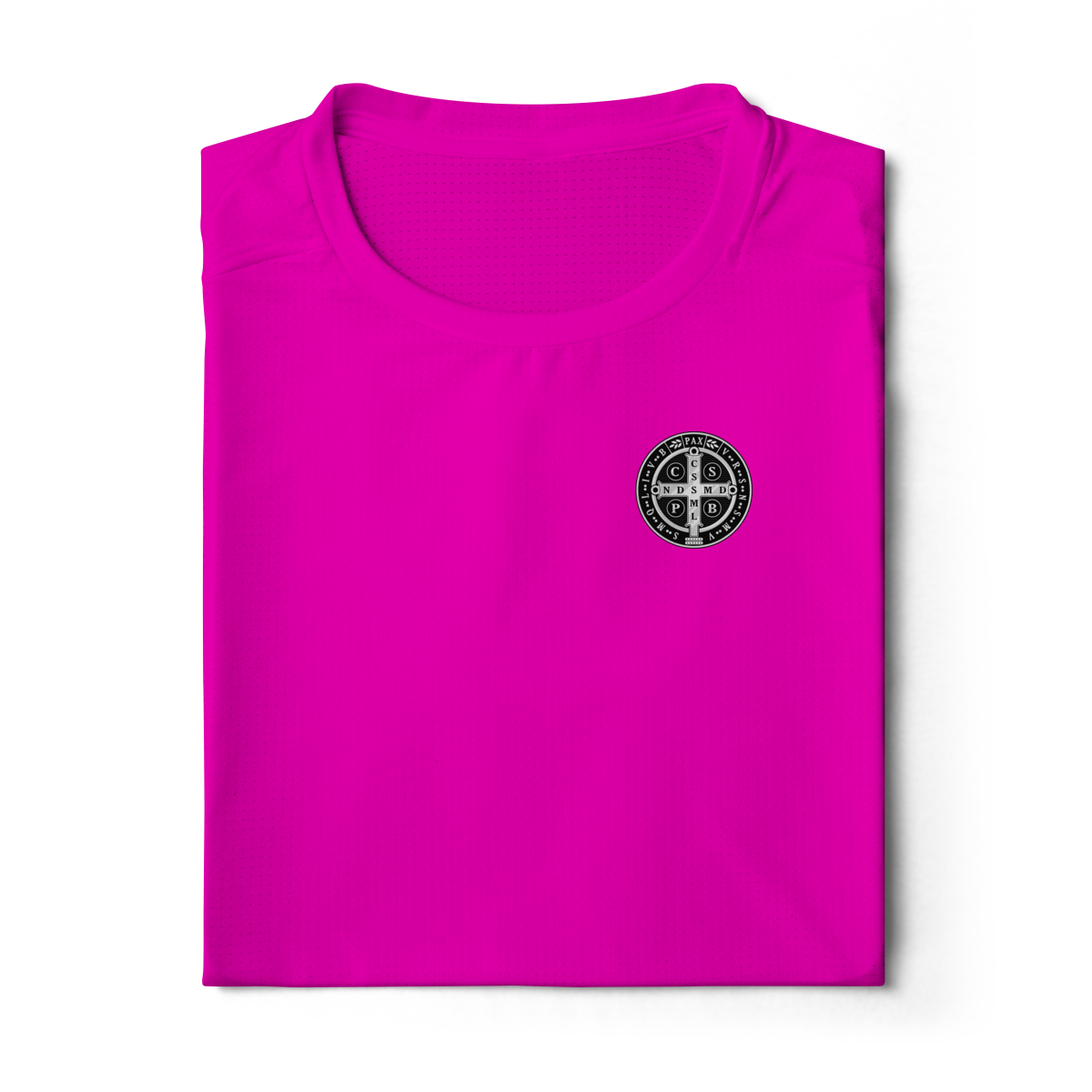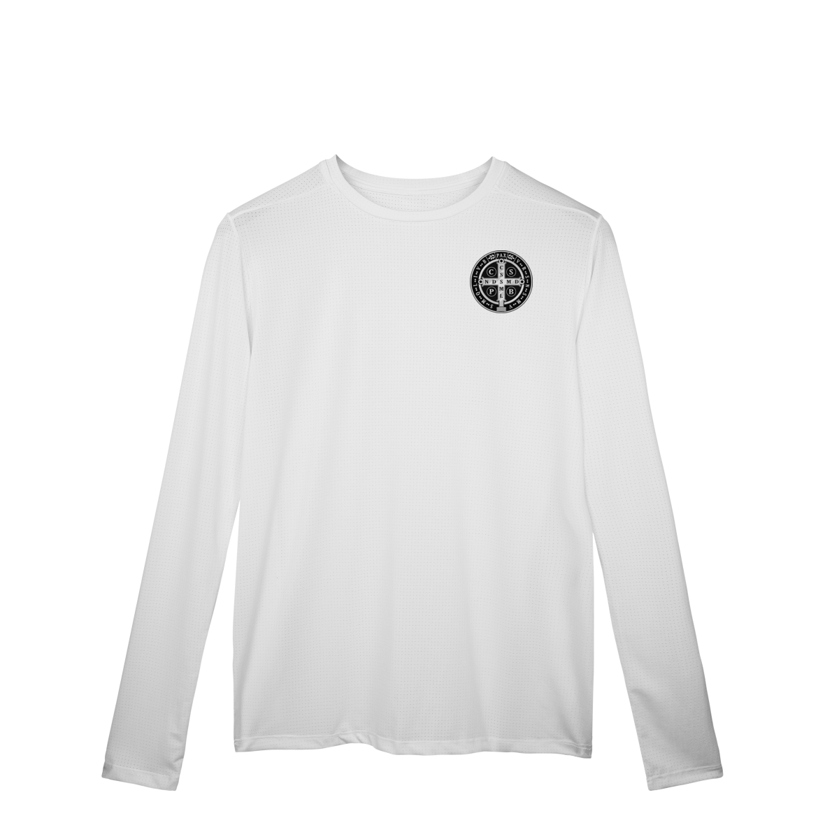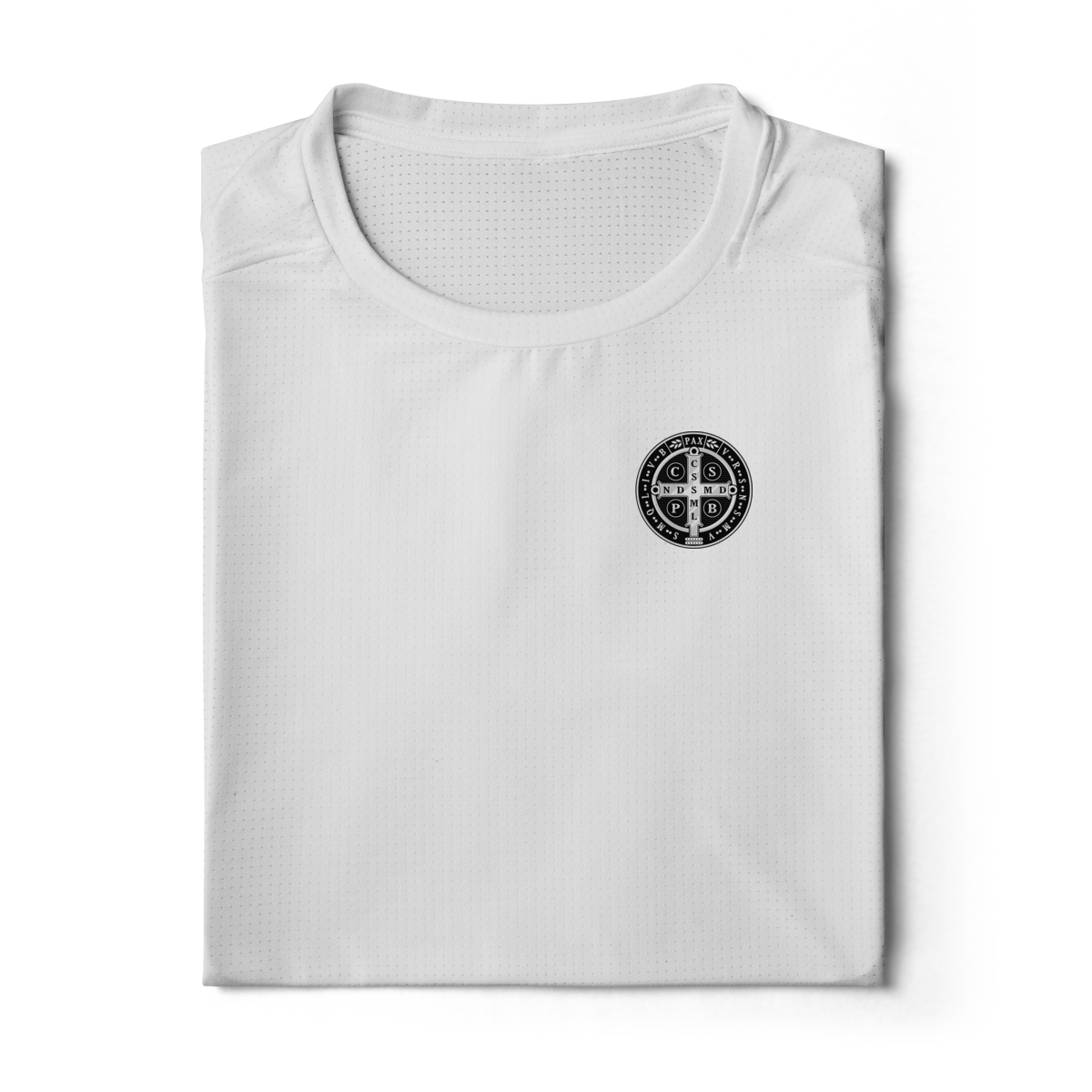 Na parte frontal, a estampa é discreta e minimalista, com a Medalha de São Bento aplicada no lado esquerdo do peito, simbolizando proteção constante e fé pessoal.