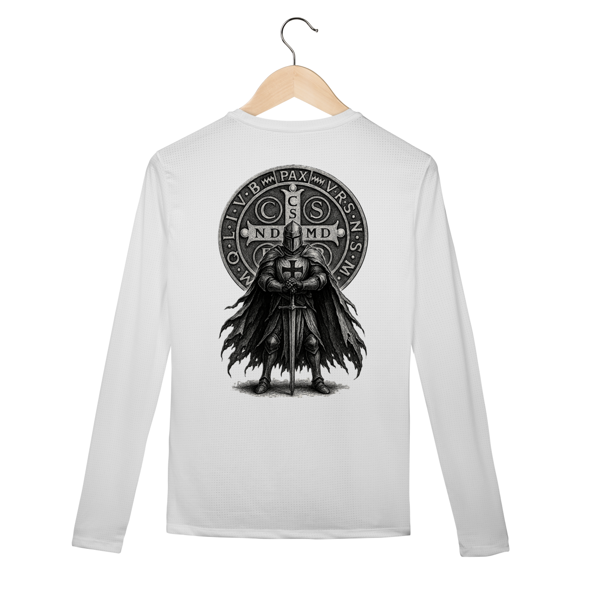 Nas costas, a estampa é grande e imponente, trazendo uma arte forte inspirada na Medalha de São Bento, representando a batalha espiritual e a confiança na vitória de Cristo.