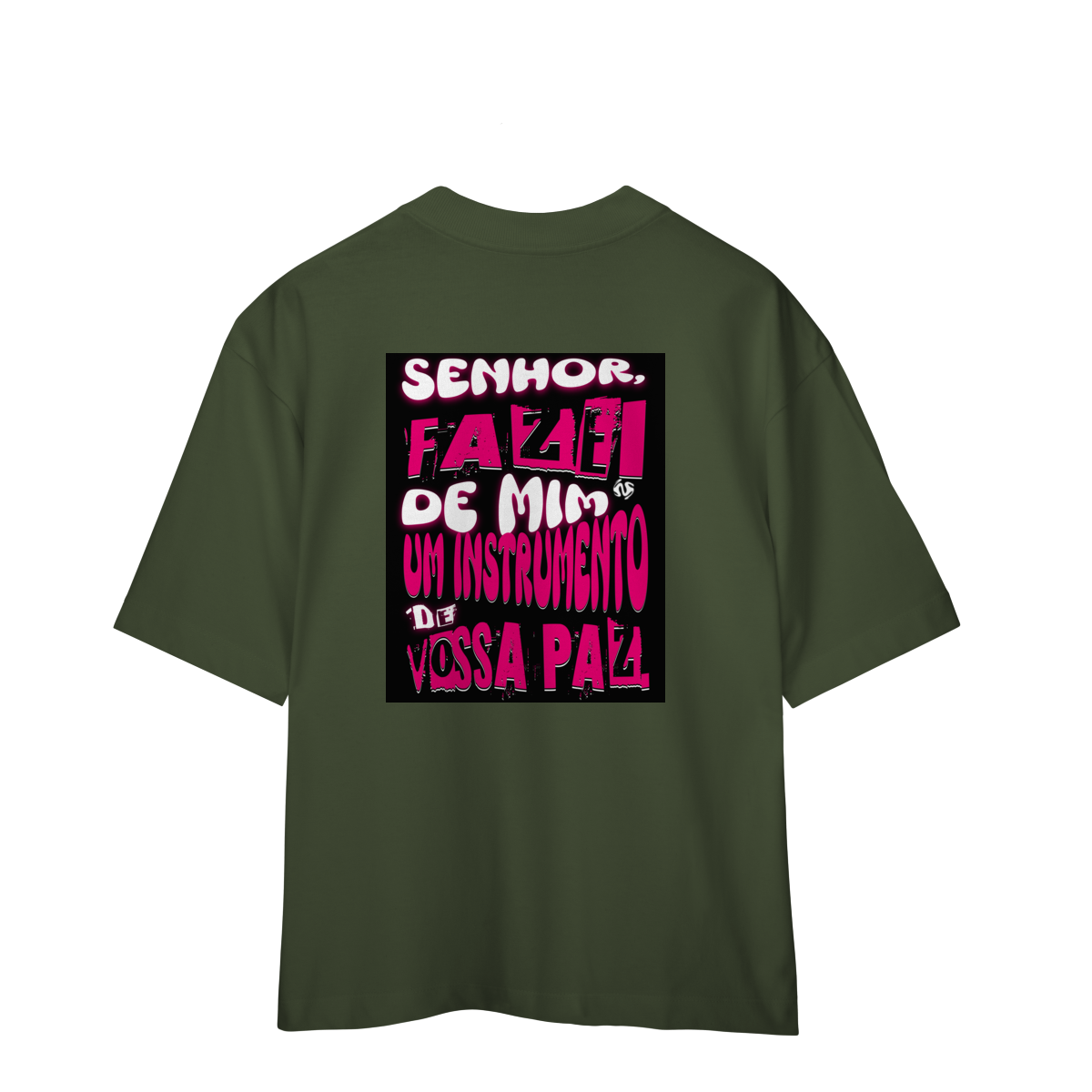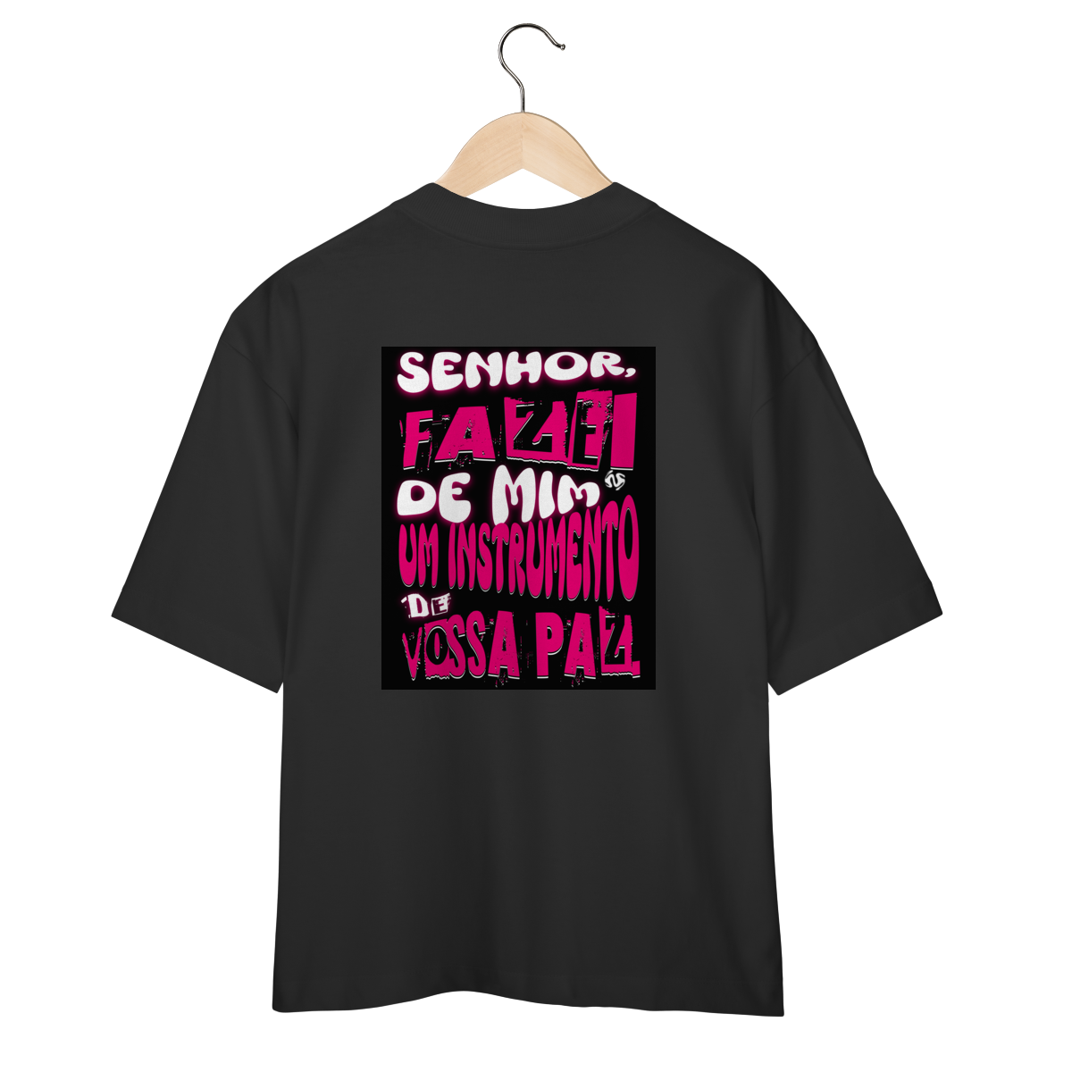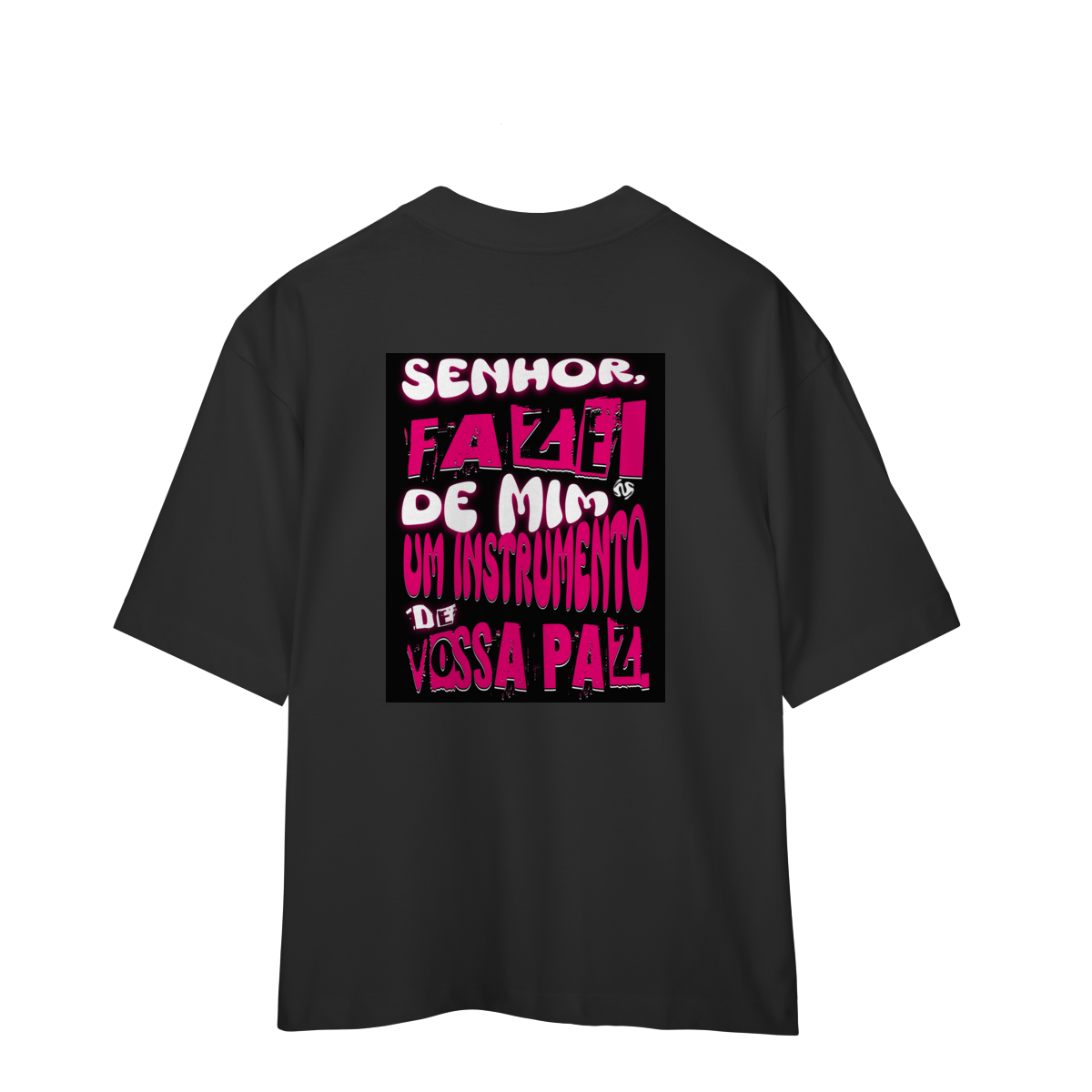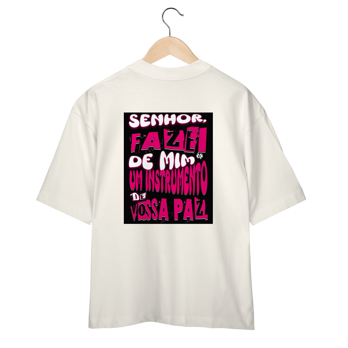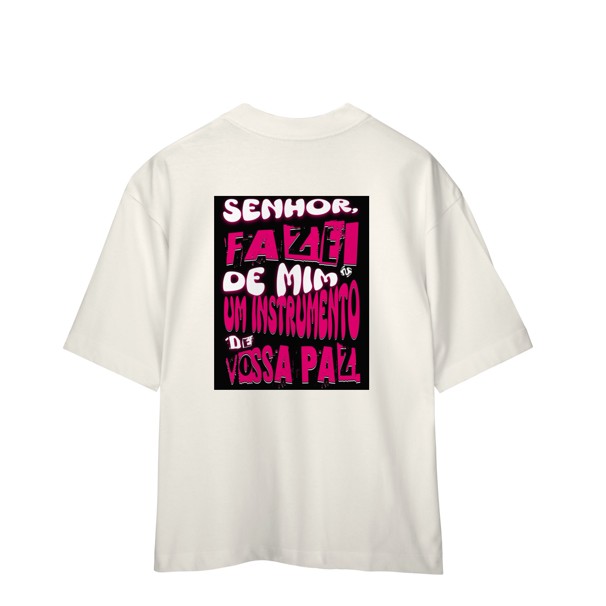 A Camiseta Oversized “Instrumento de Paz” une o visual moderno e despojado da modelagem ampla com a profundidade espiritual da oração de São Francisco: “Fazei de mim instrumento de vossa paz”.