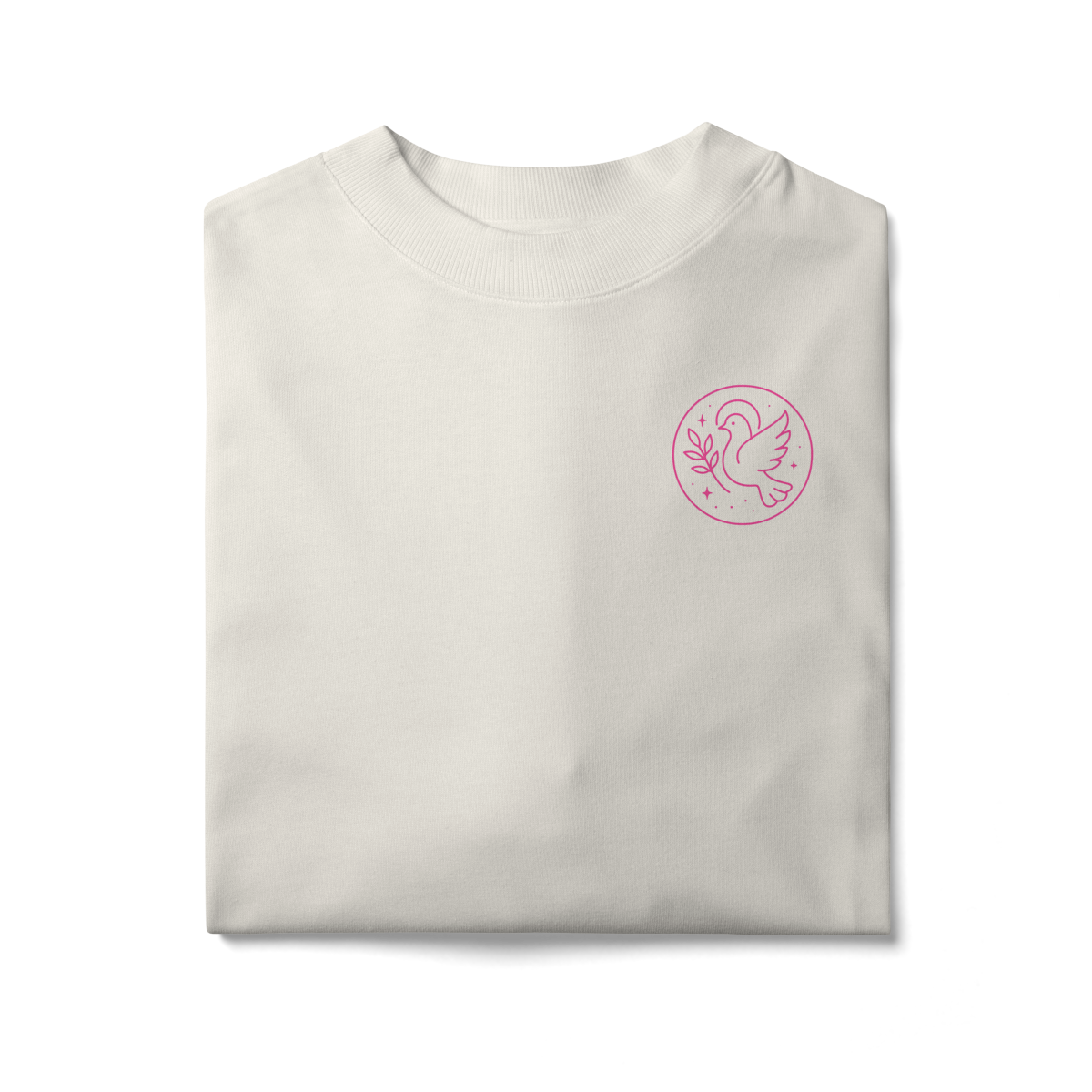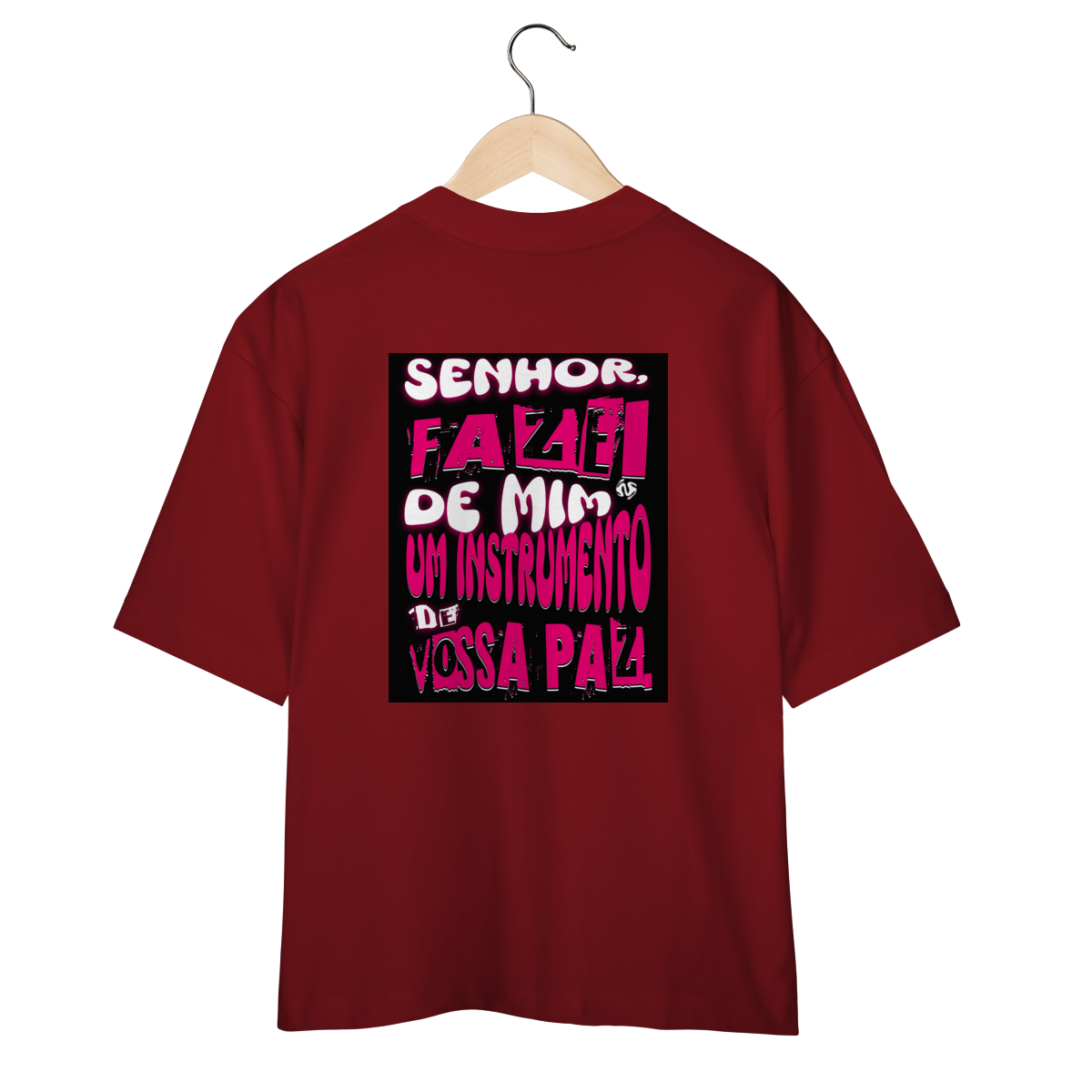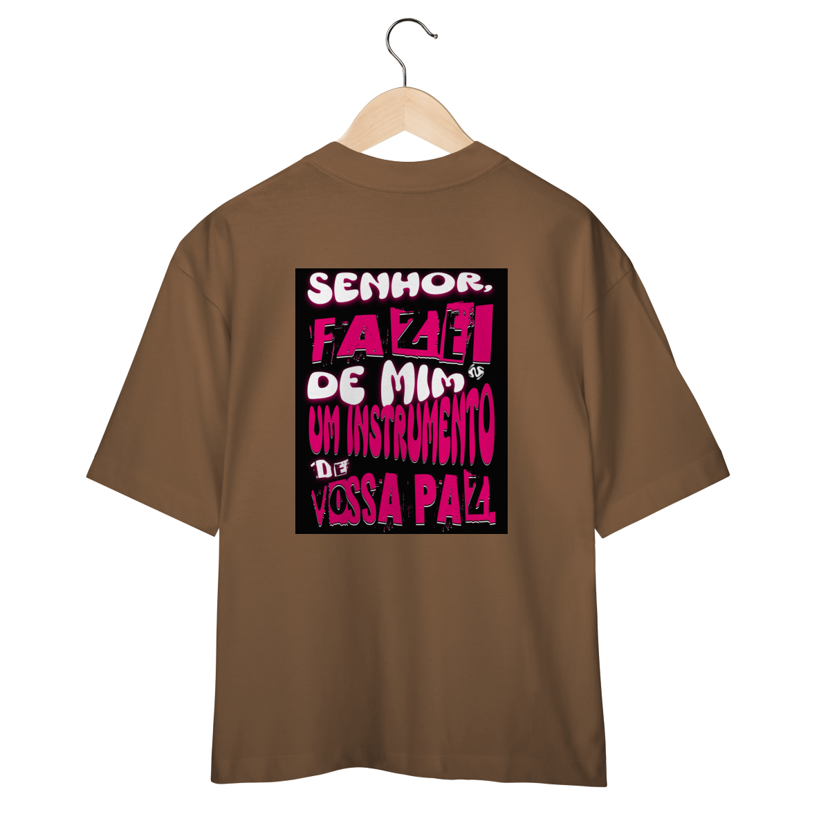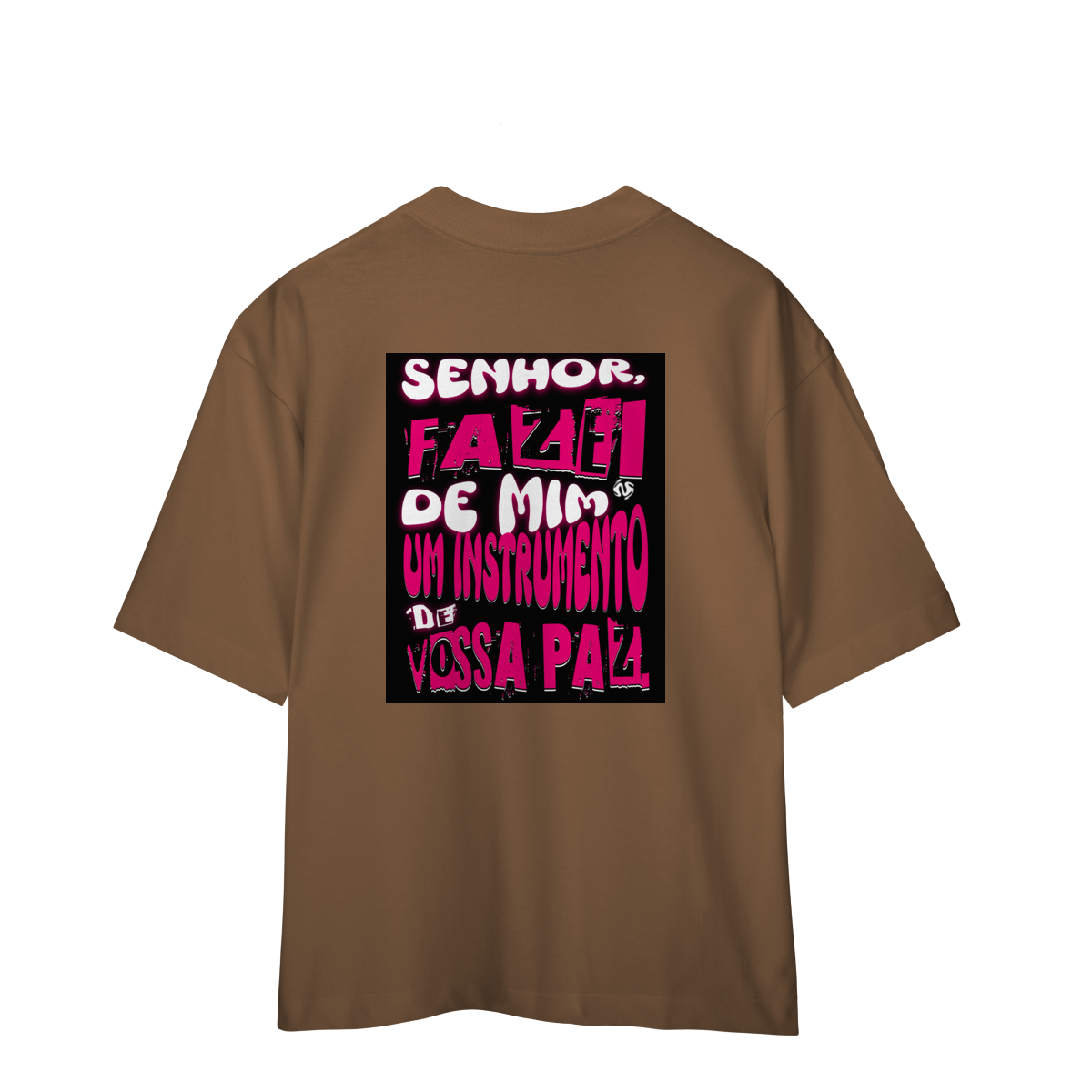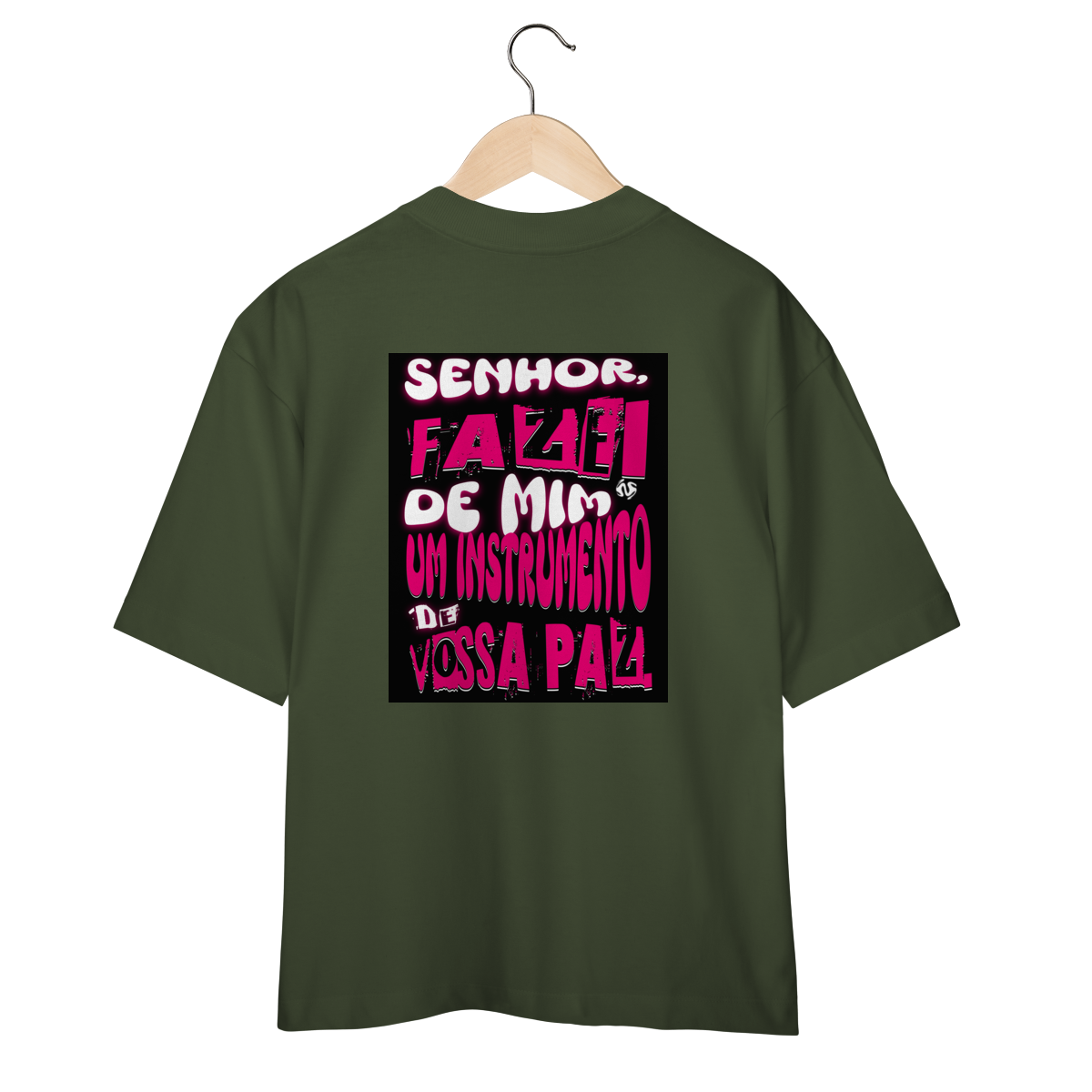 A Camiseta Oversized “Instrumento de Paz” une o visual moderno e despojado da modelagem ampla com a profundidade espiritual da oração de São Francisco: “Fazei de mim instrumento de vossa paz”.