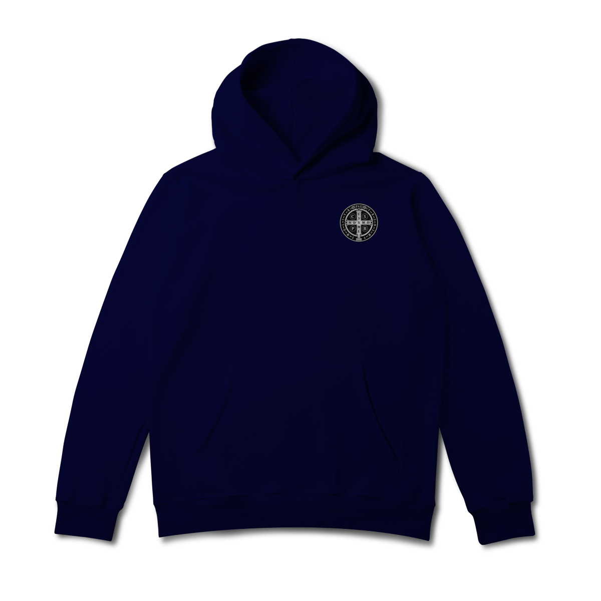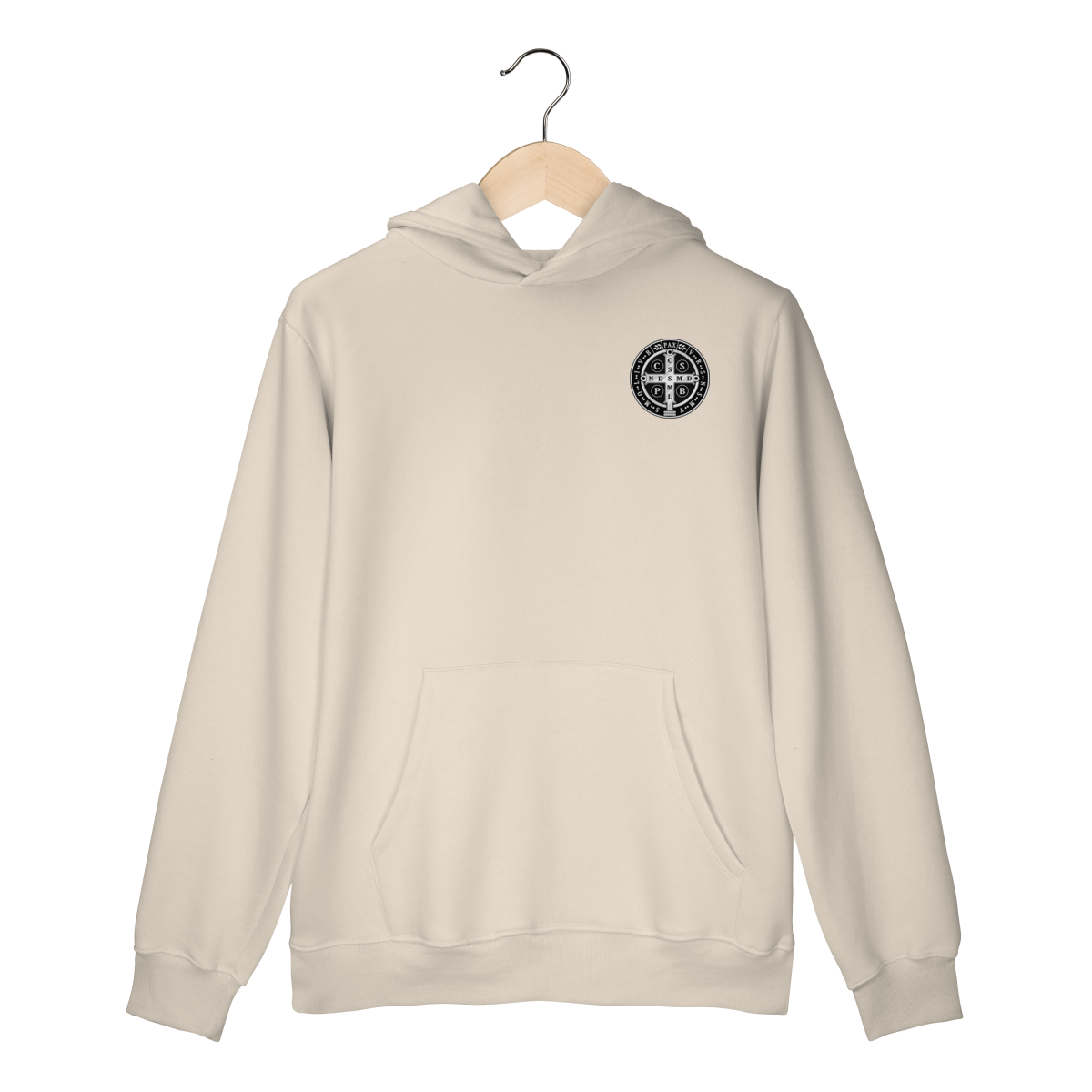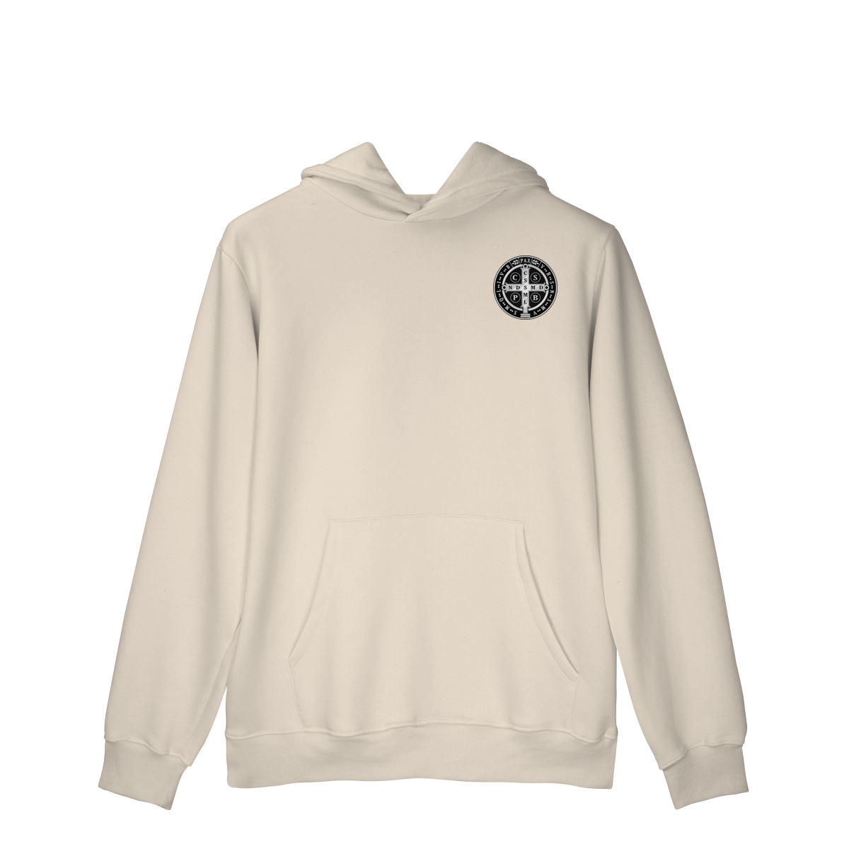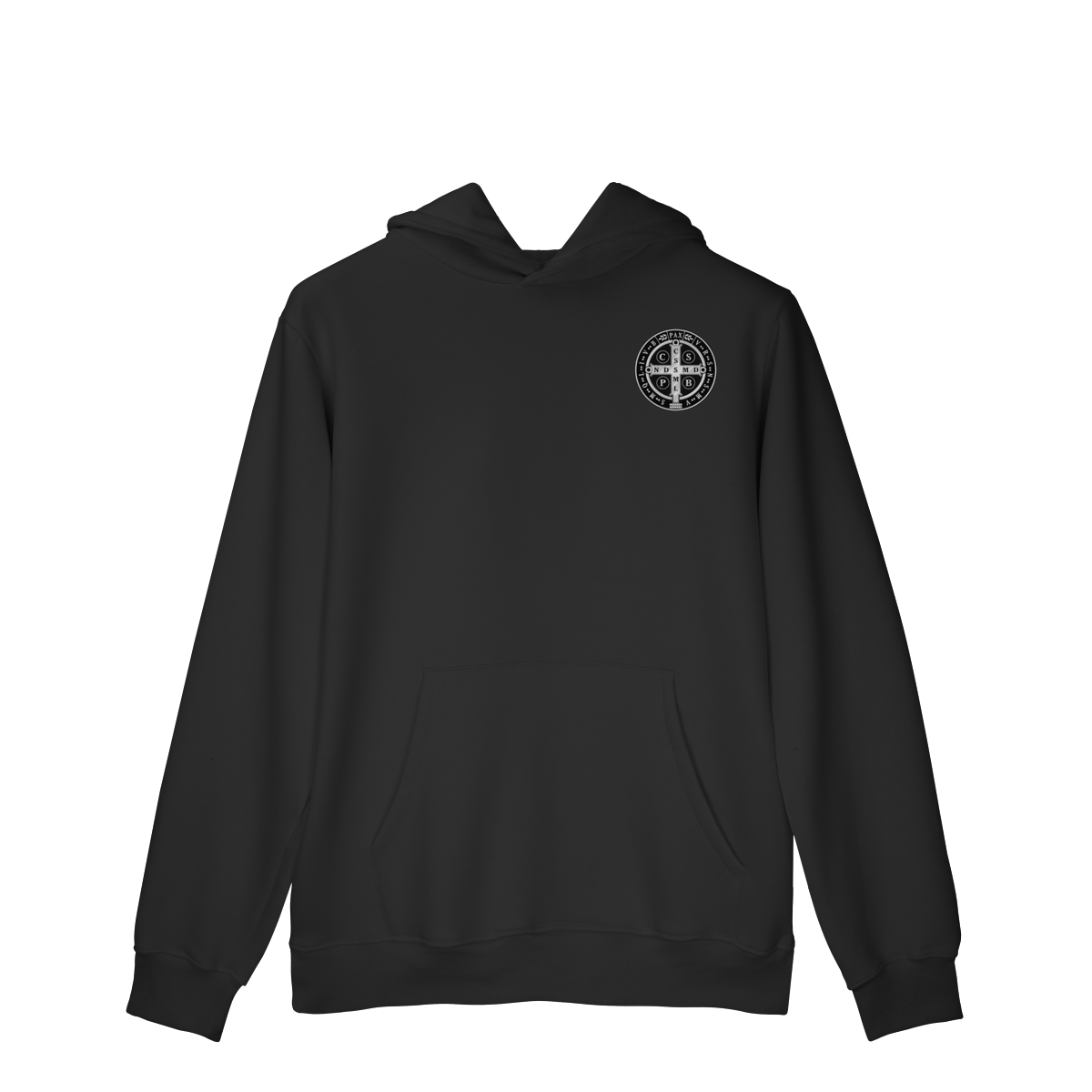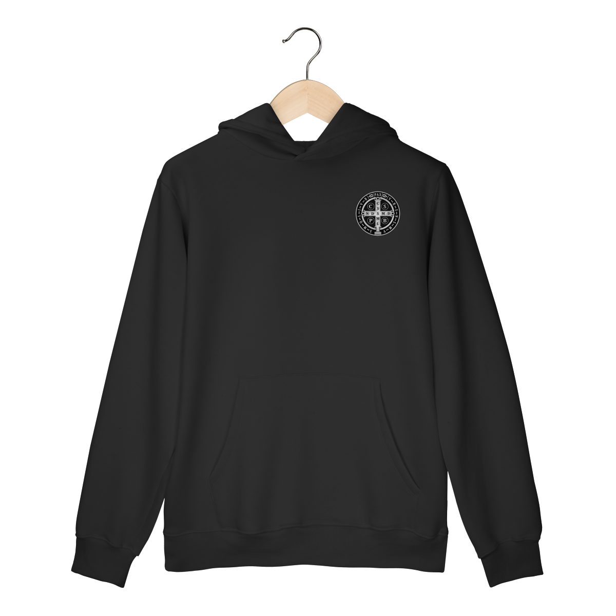 Na parte frontal, a estampa é minimalista, trazendo apenas um lado da Medalha de São Bento, aplicada de forma discreta e elegante, representando proteção espiritual e fé constante.