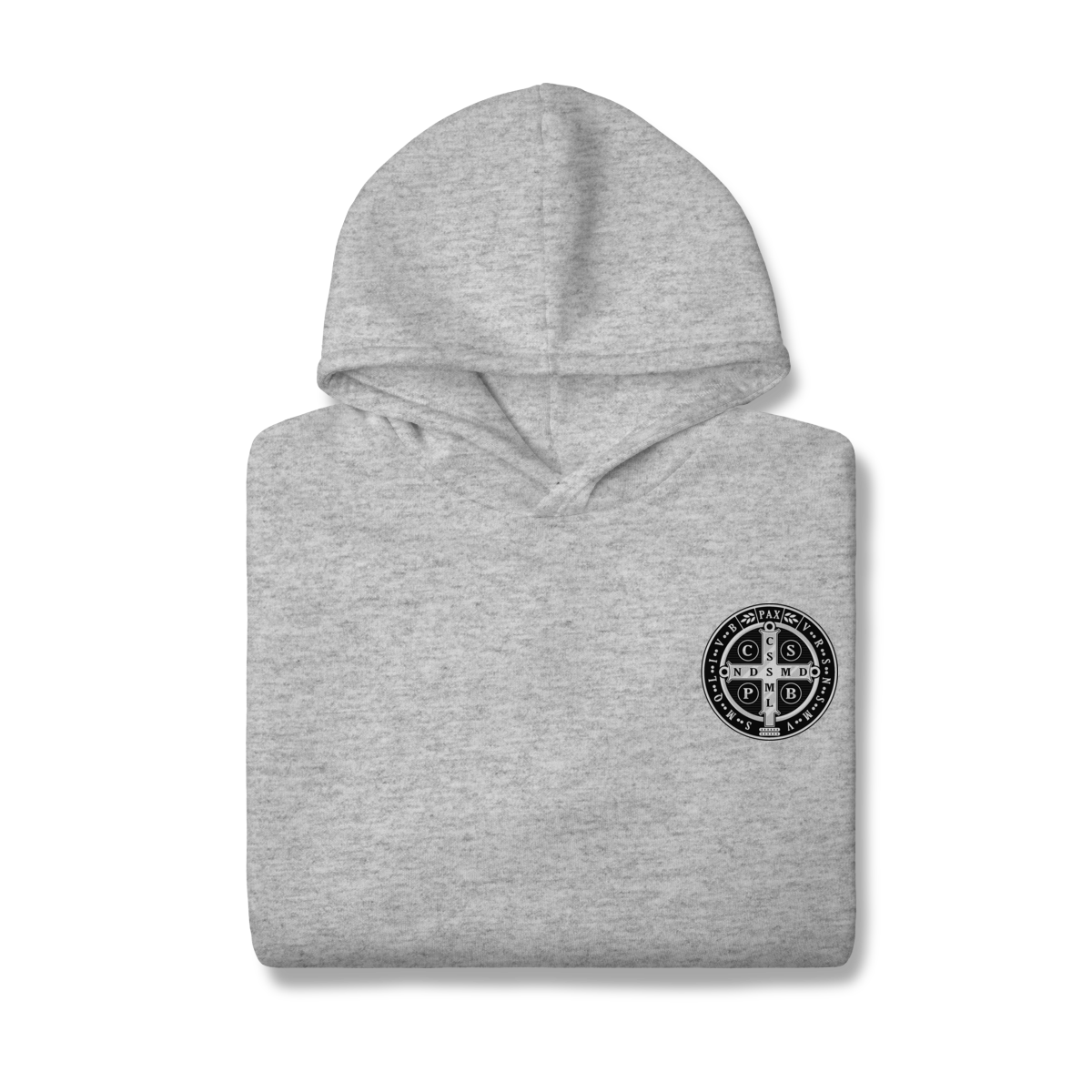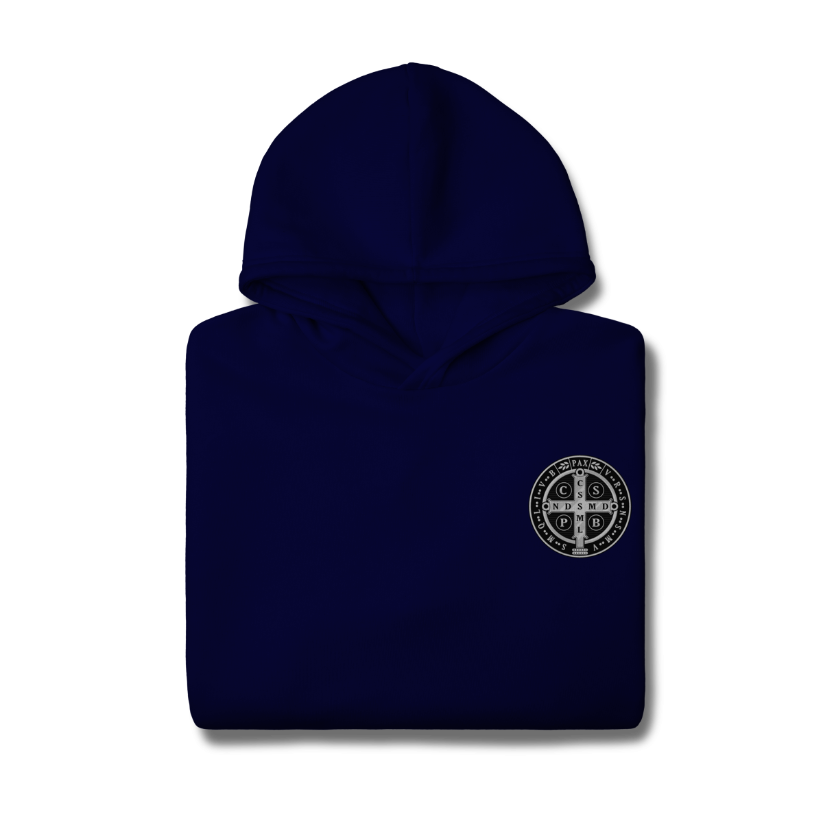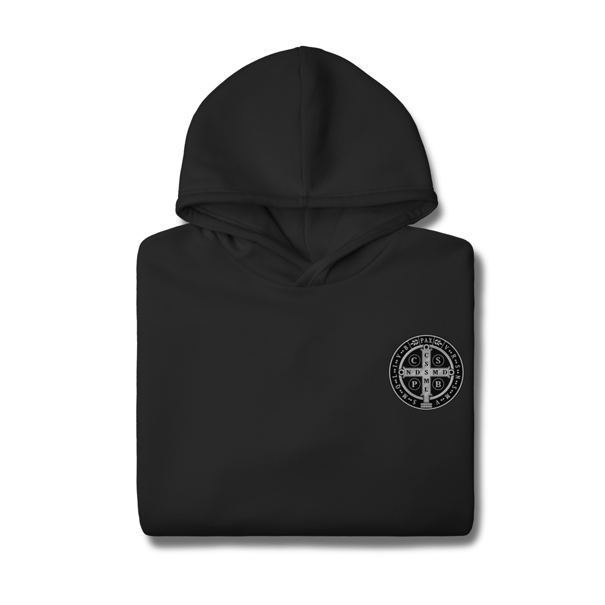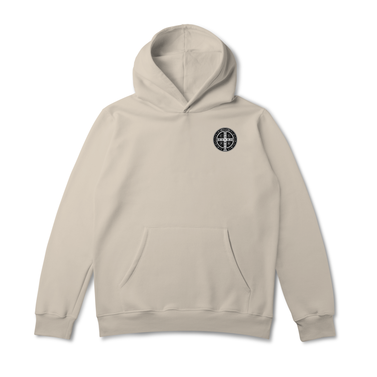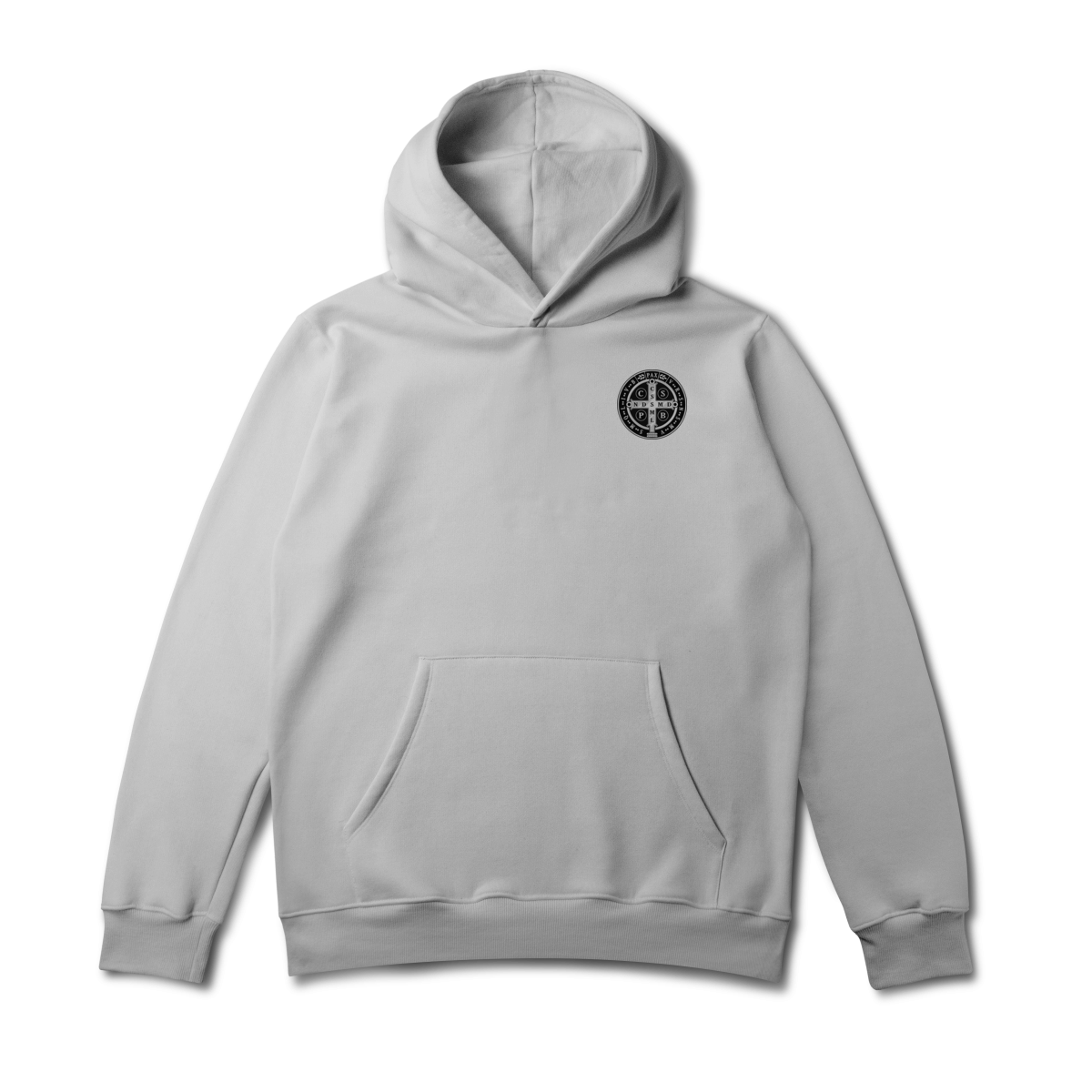 Na parte frontal, a estampa é minimalista, trazendo apenas um lado da Medalha de São Bento, aplicada de forma discreta e elegante, representando proteção espiritual e fé constante.