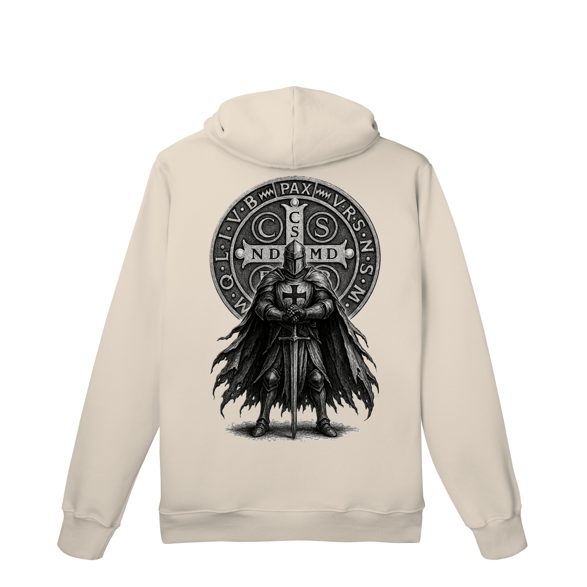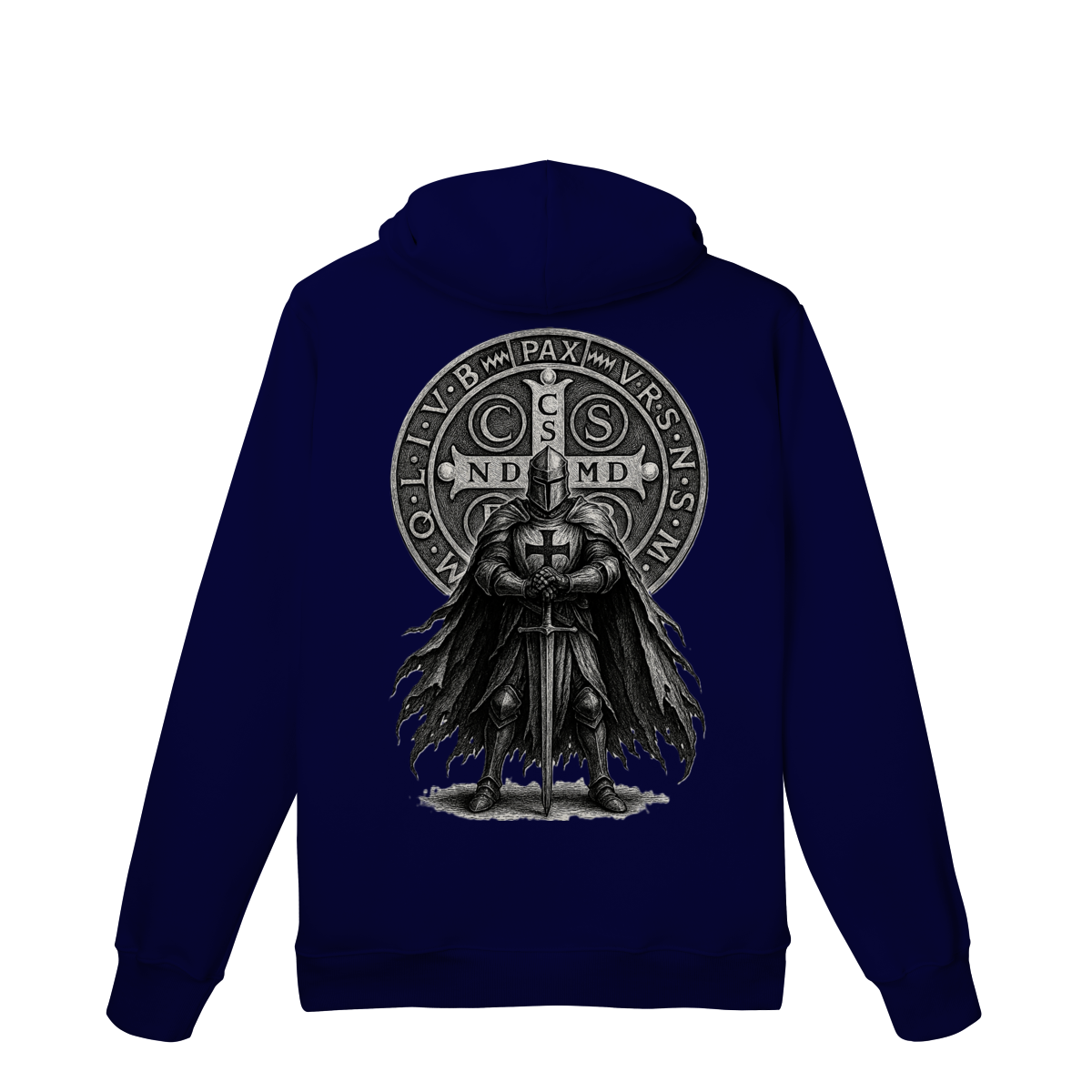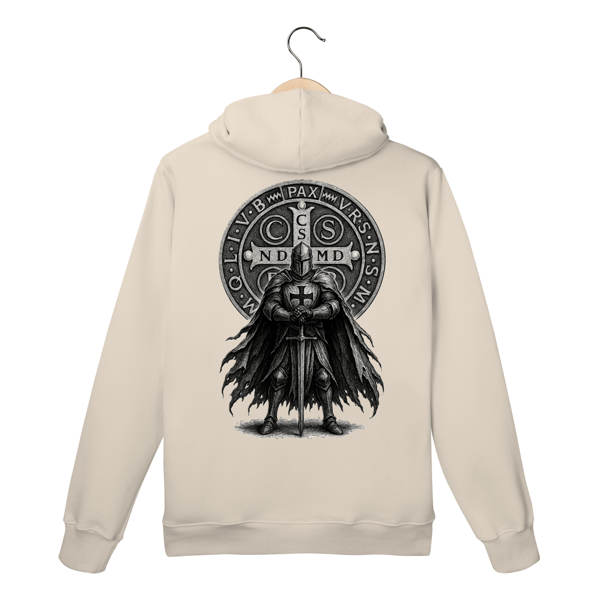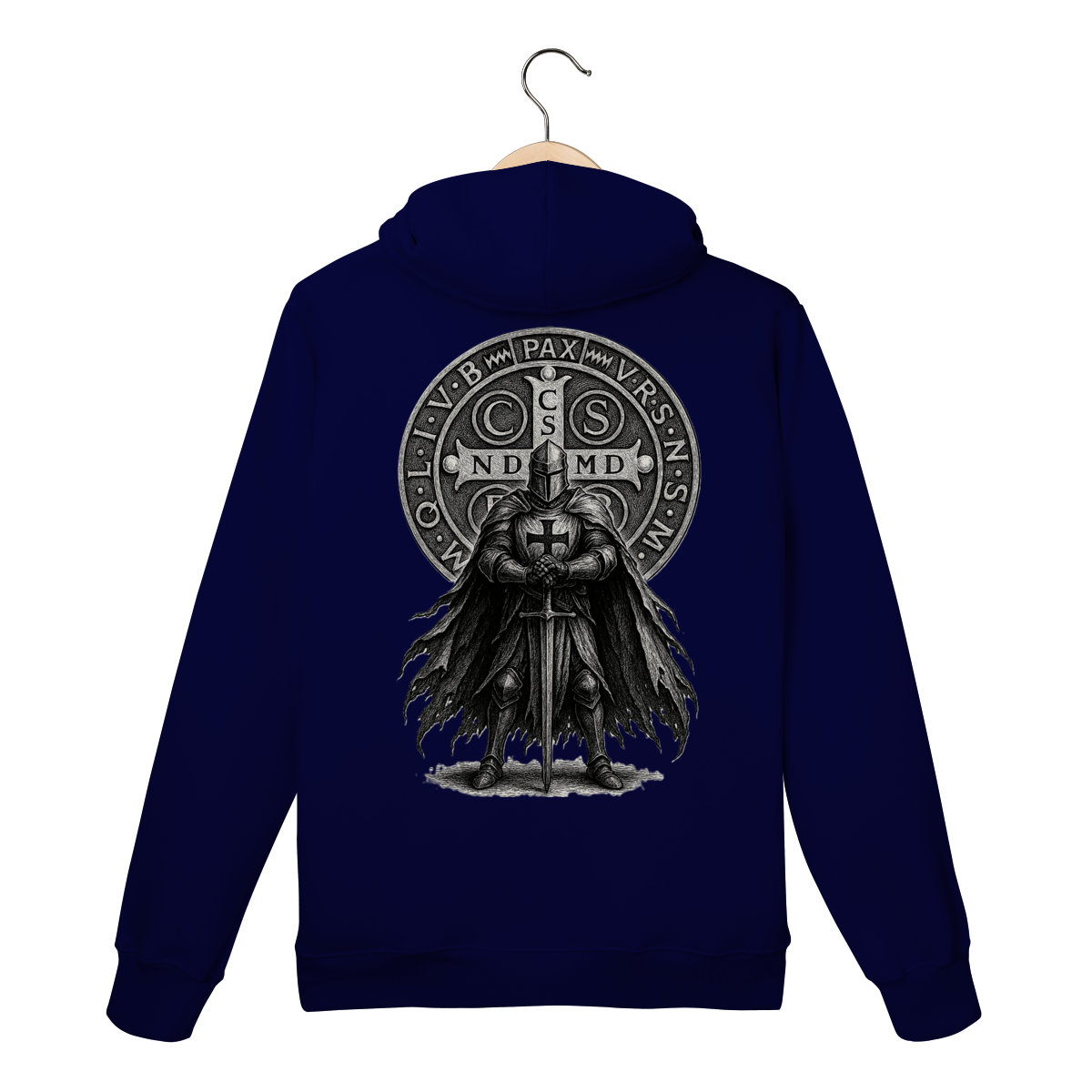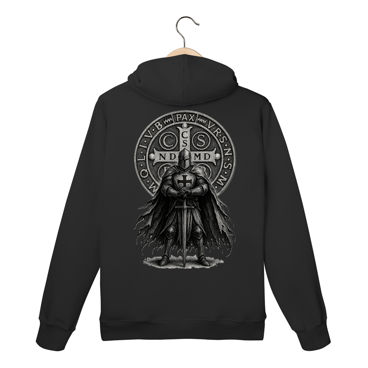 Nas costas, o moletom ganha destaque com a estampa imponente do Cavaleiro, símbolo de força, vigilância espiritual e firmeza na fé cristã.