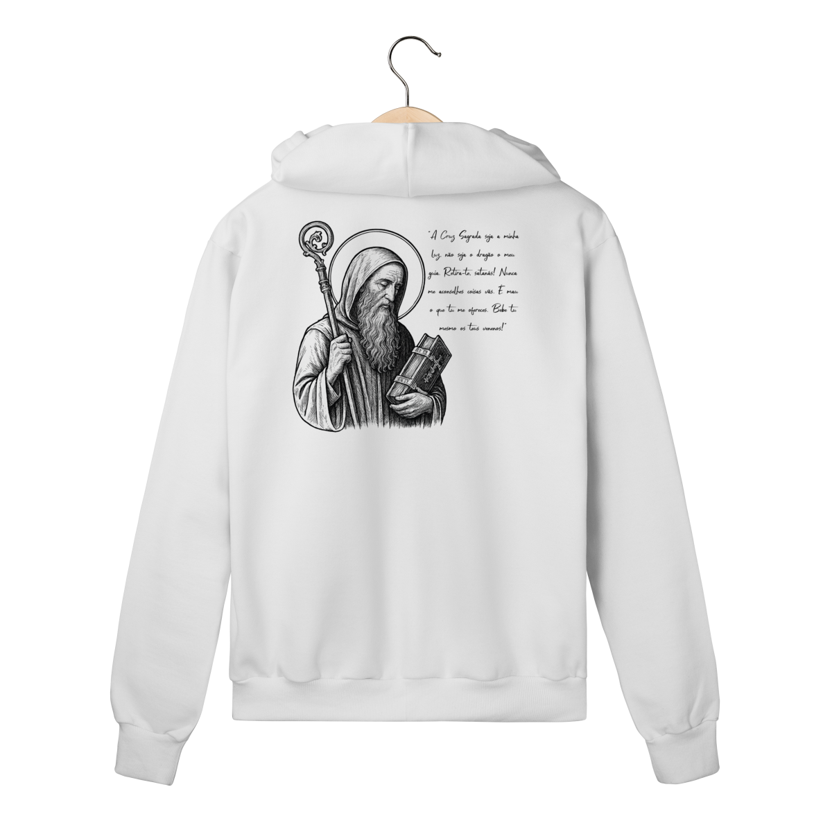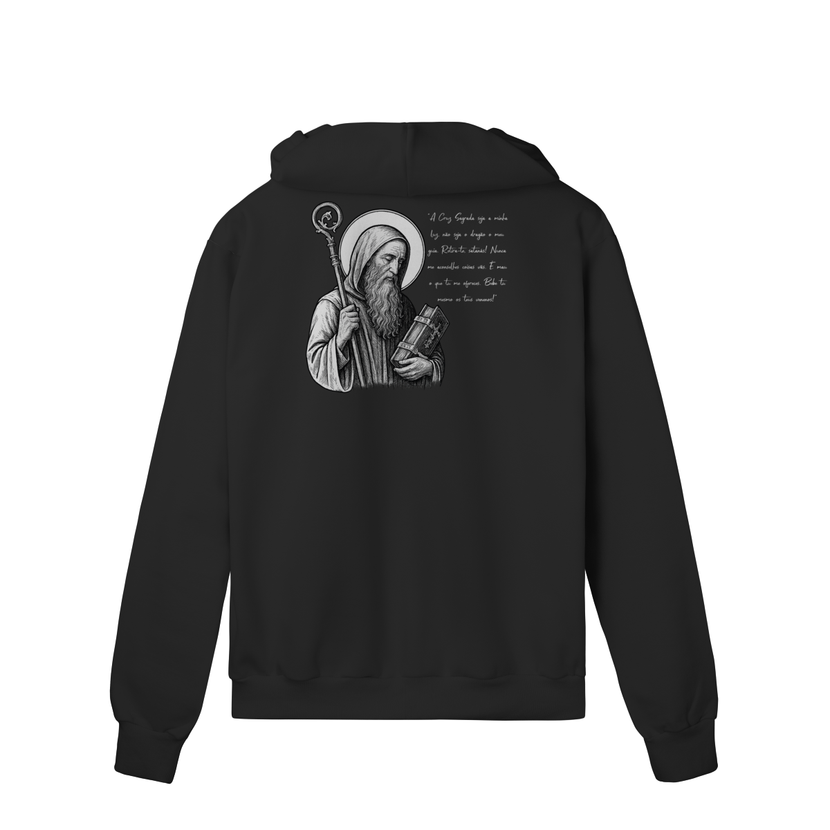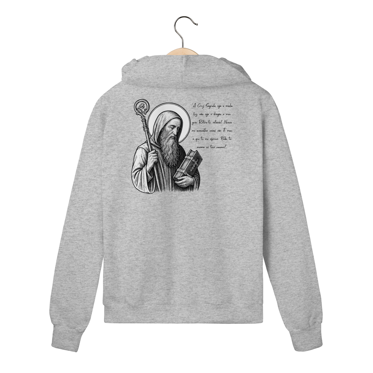 O Moletom Prime com Zíper São Bento foi desenvolvido para quem busca conforto premium, praticidade e expressão de fé em uma peça discreta na frente e profunda em significado.