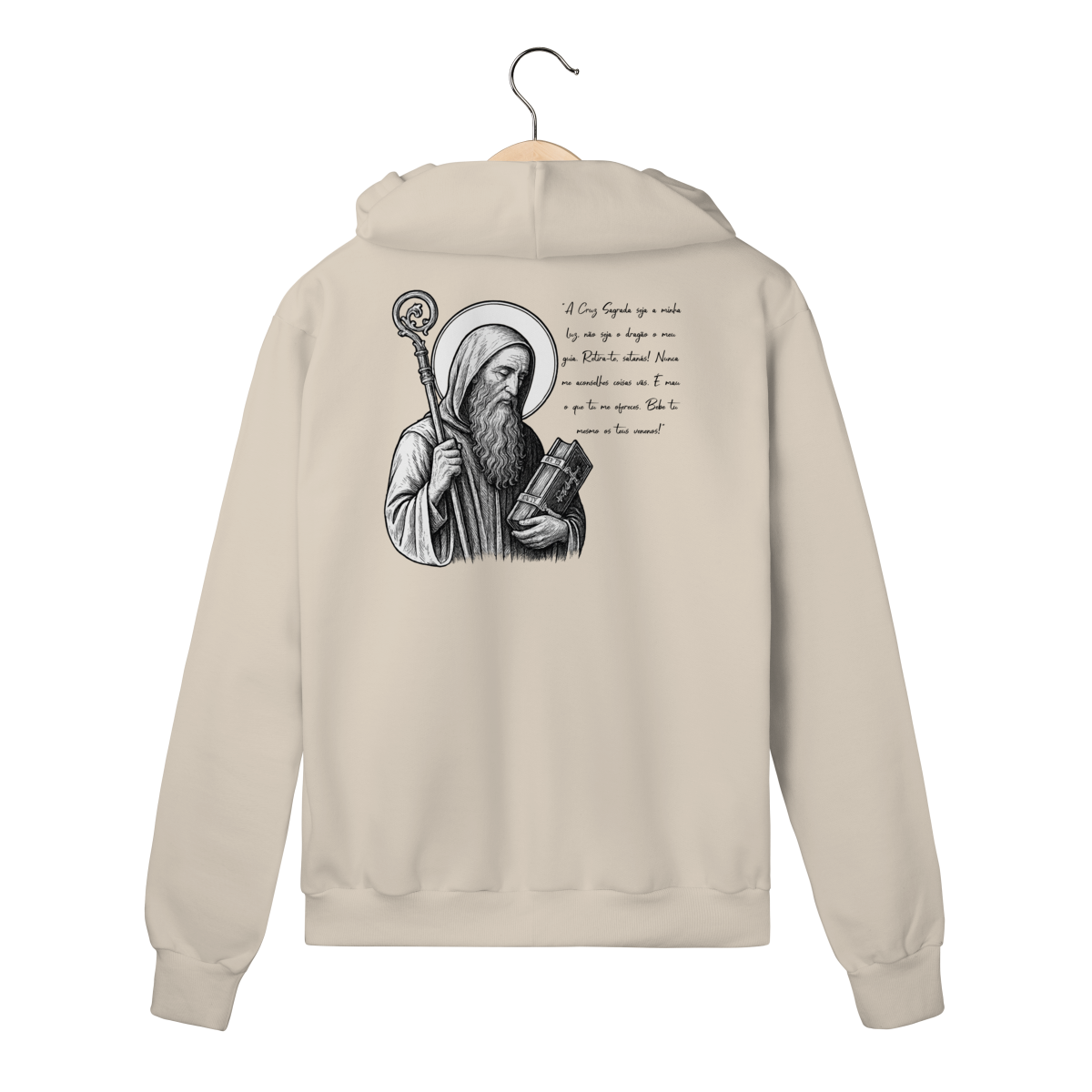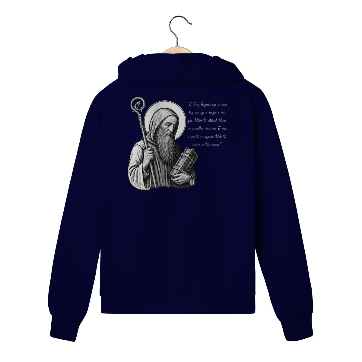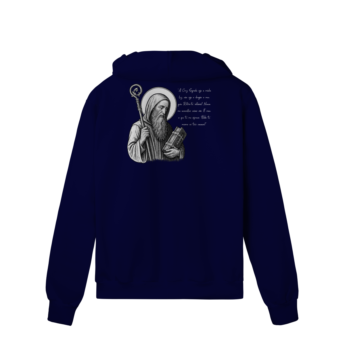 O Moletom Prime com Zíper São Bento foi desenvolvido para quem busca conforto premium, praticidade e expressão de fé em uma peça discreta na frente e profunda em significado.