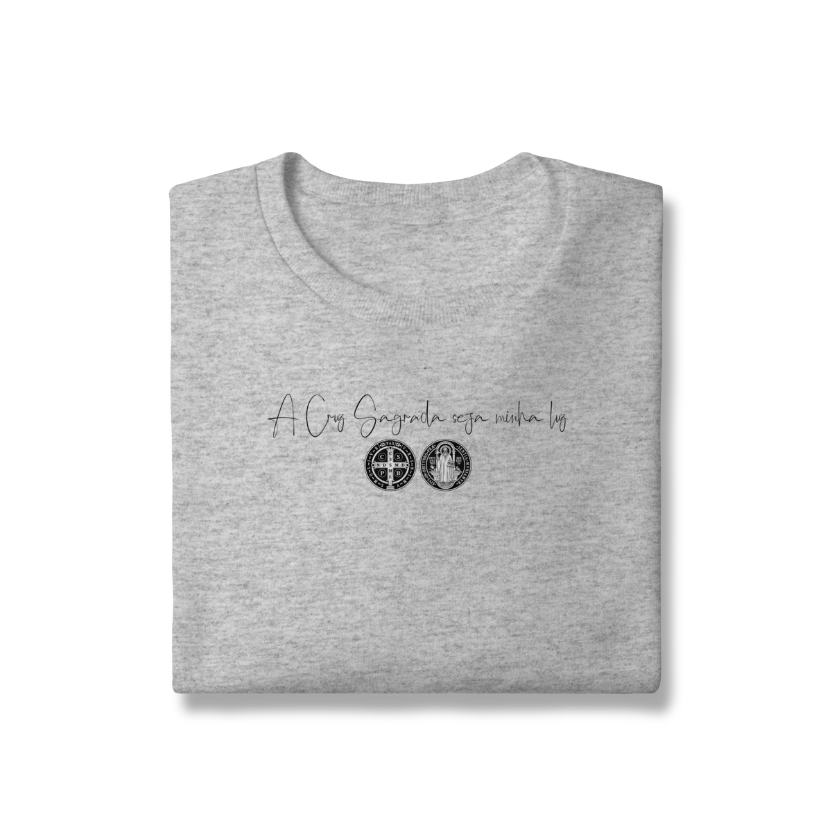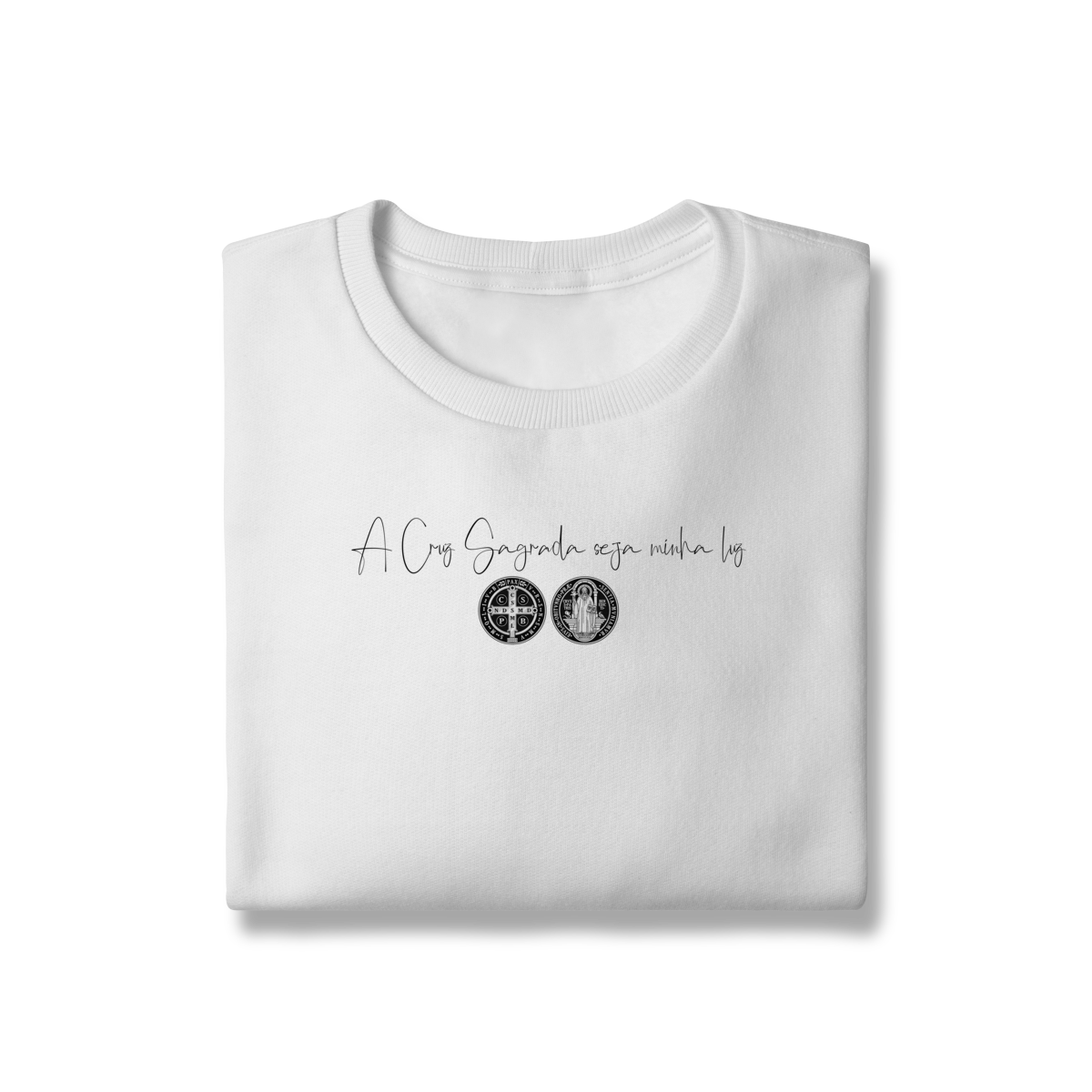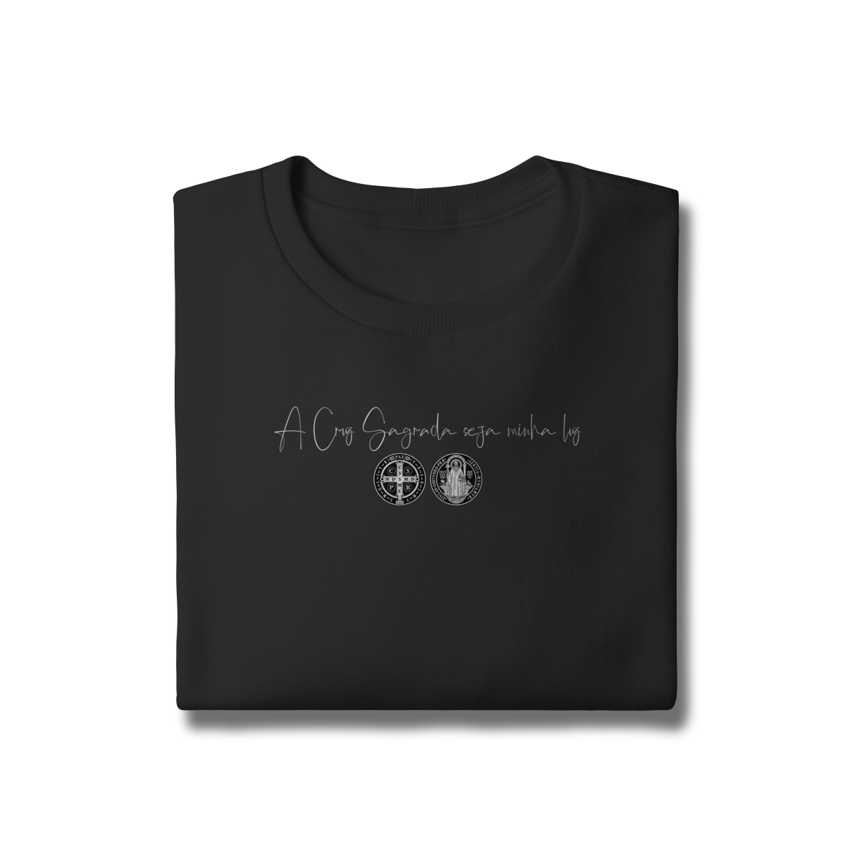 • Estampa frontal: frase + duas faces da Medalha de São Bento