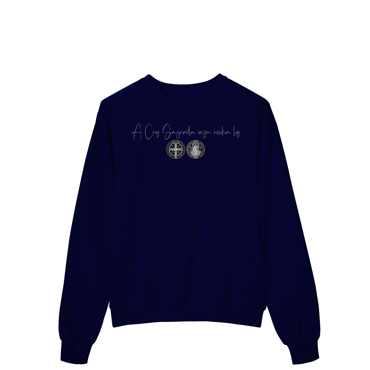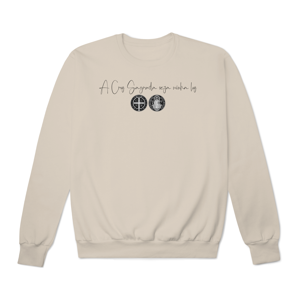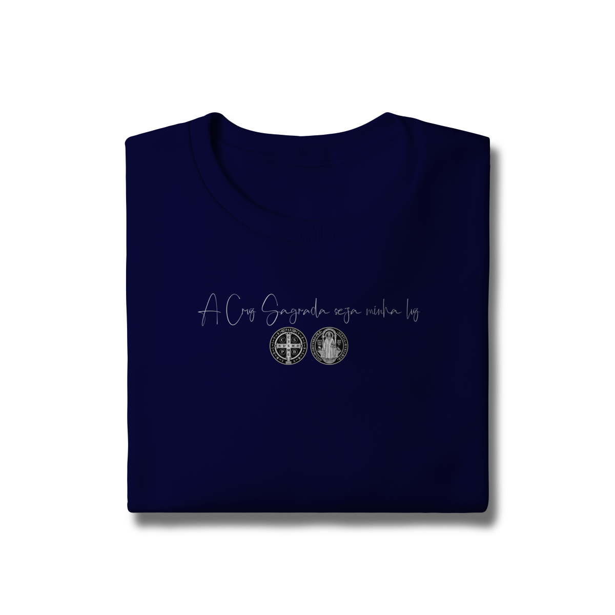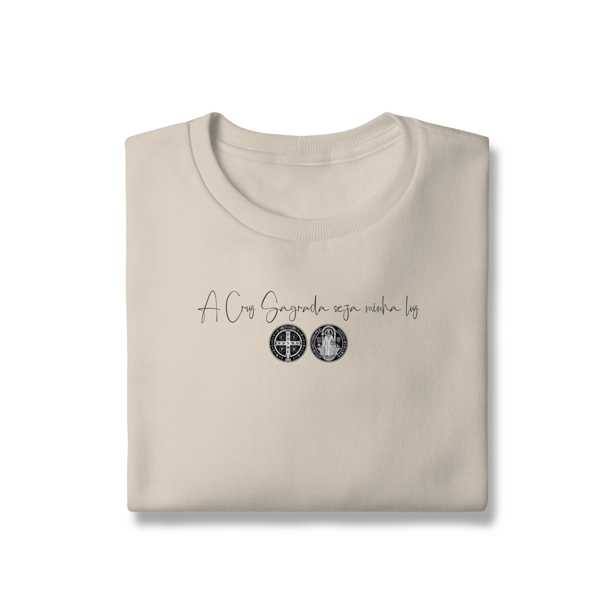 • Estampa frontal: frase + duas faces da Medalha de São Bento