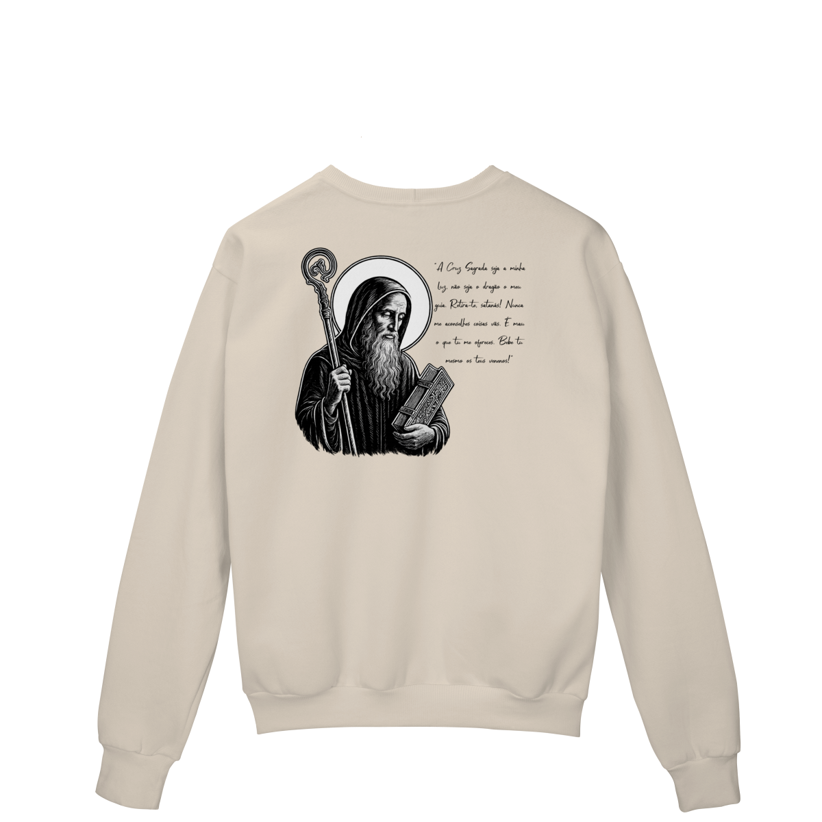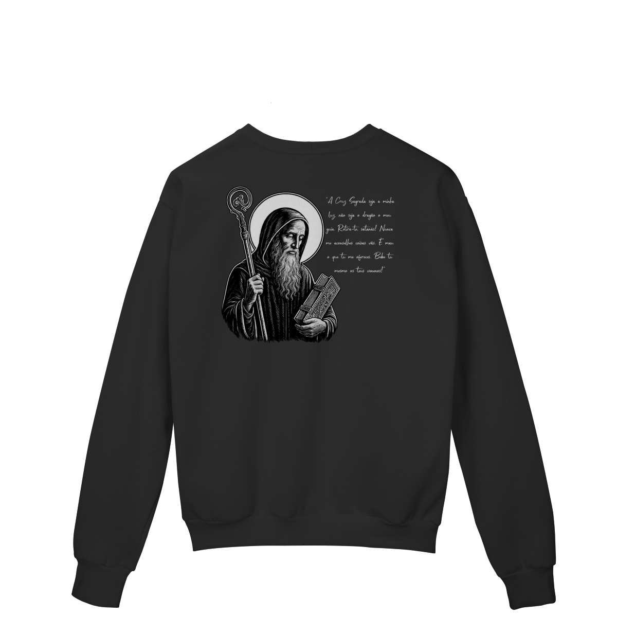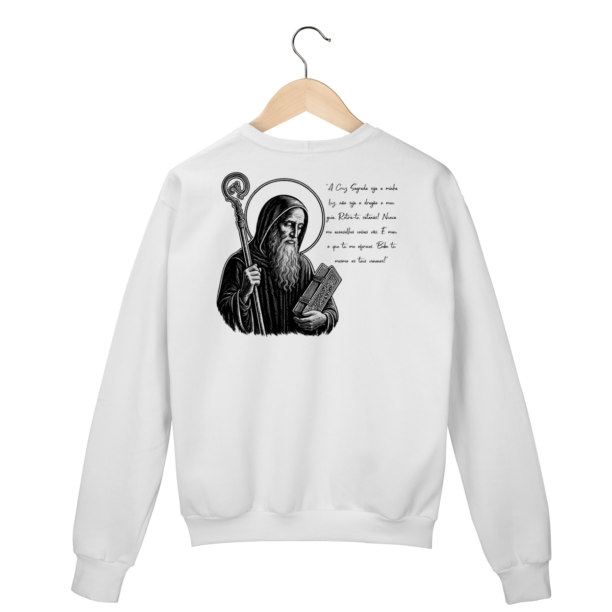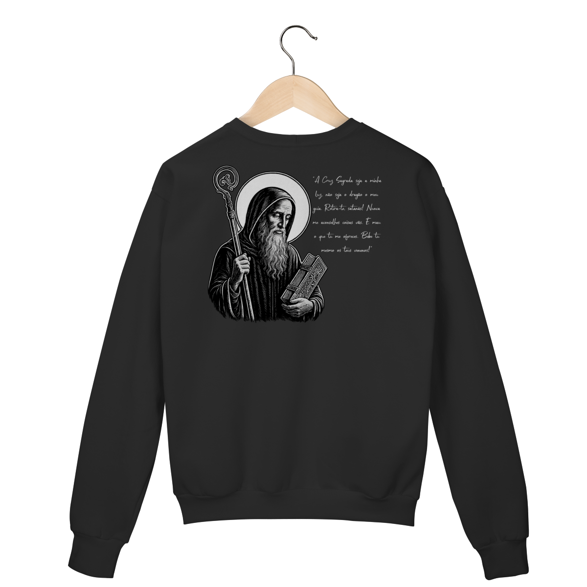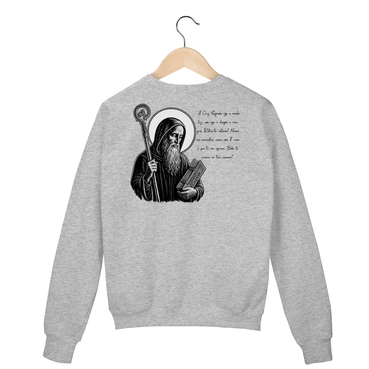 Nas costas, o moletom apresenta uma estampa grande de São Bento, acompanhada de sua oração, reforçando a confiança em Deus, a proteção contra o mal e a força espiritual no dia a dia.