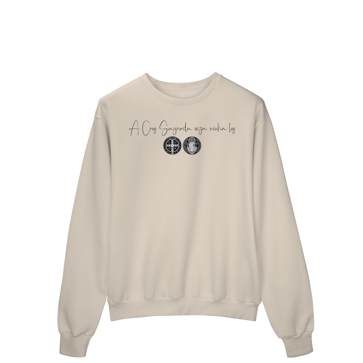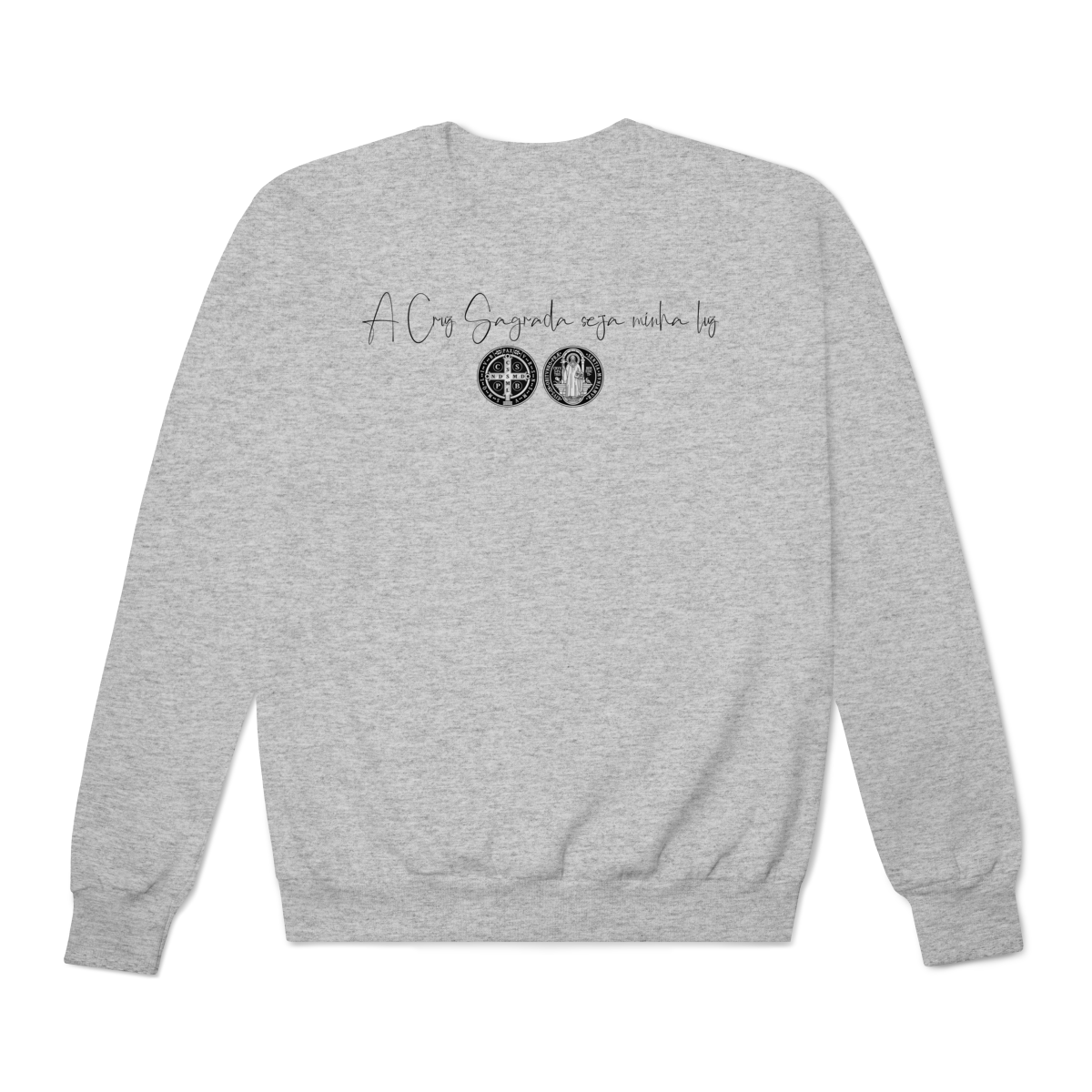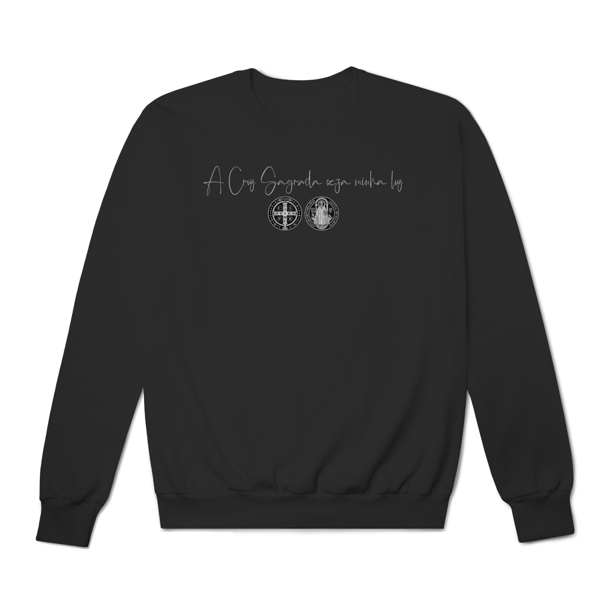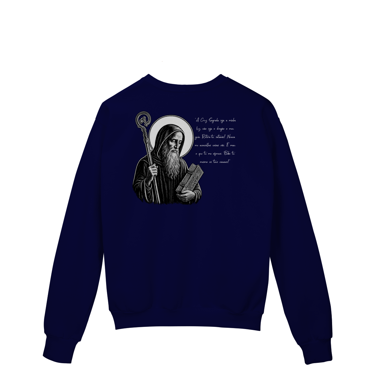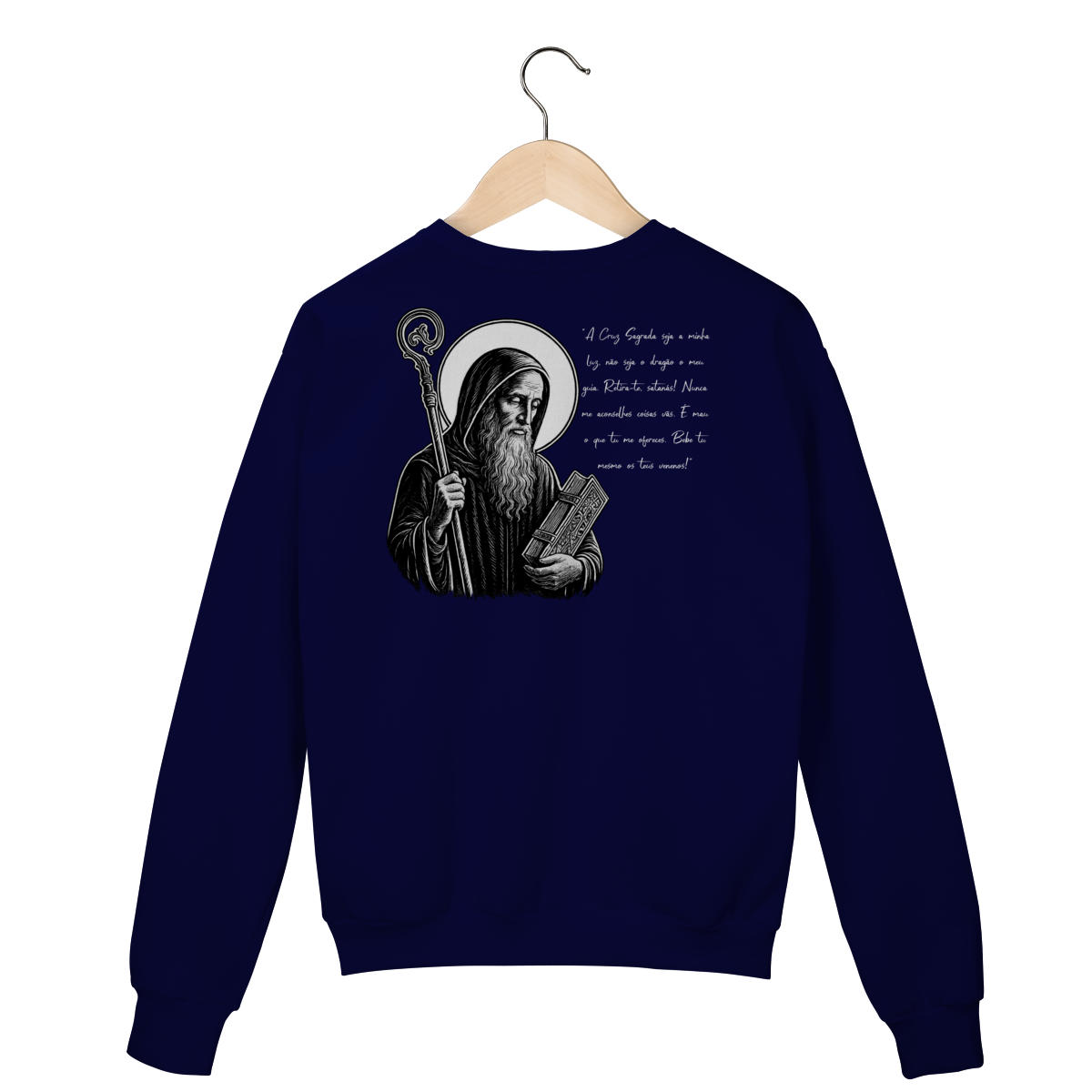 Nas costas, o moletom apresenta uma estampa grande de São Bento, acompanhada de sua oração, reforçando a confiança em Deus, a proteção contra o mal e a força espiritual no dia a dia.