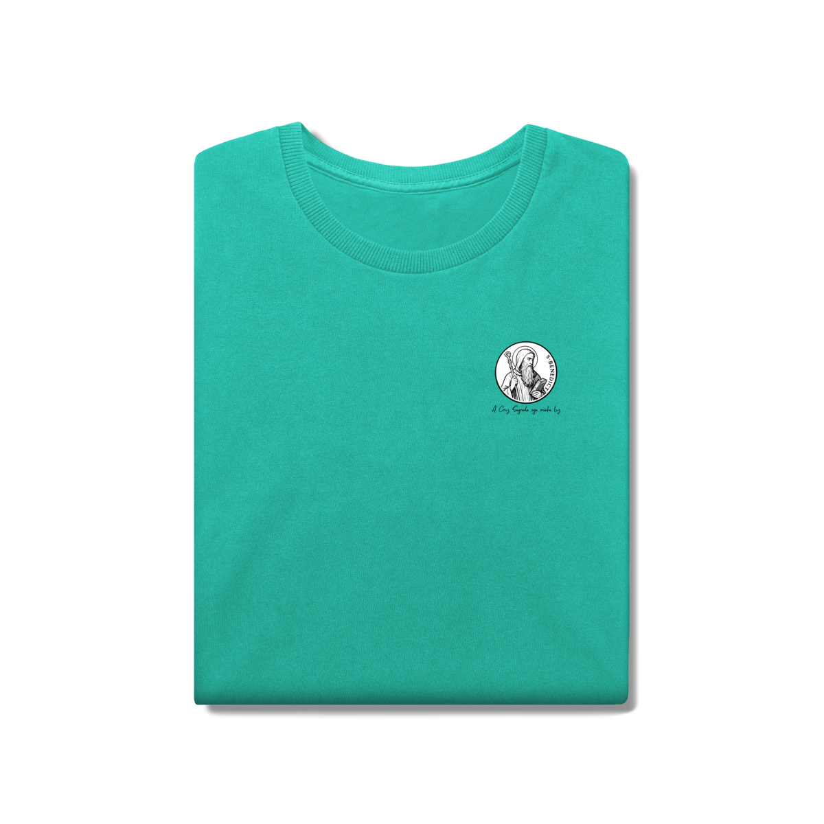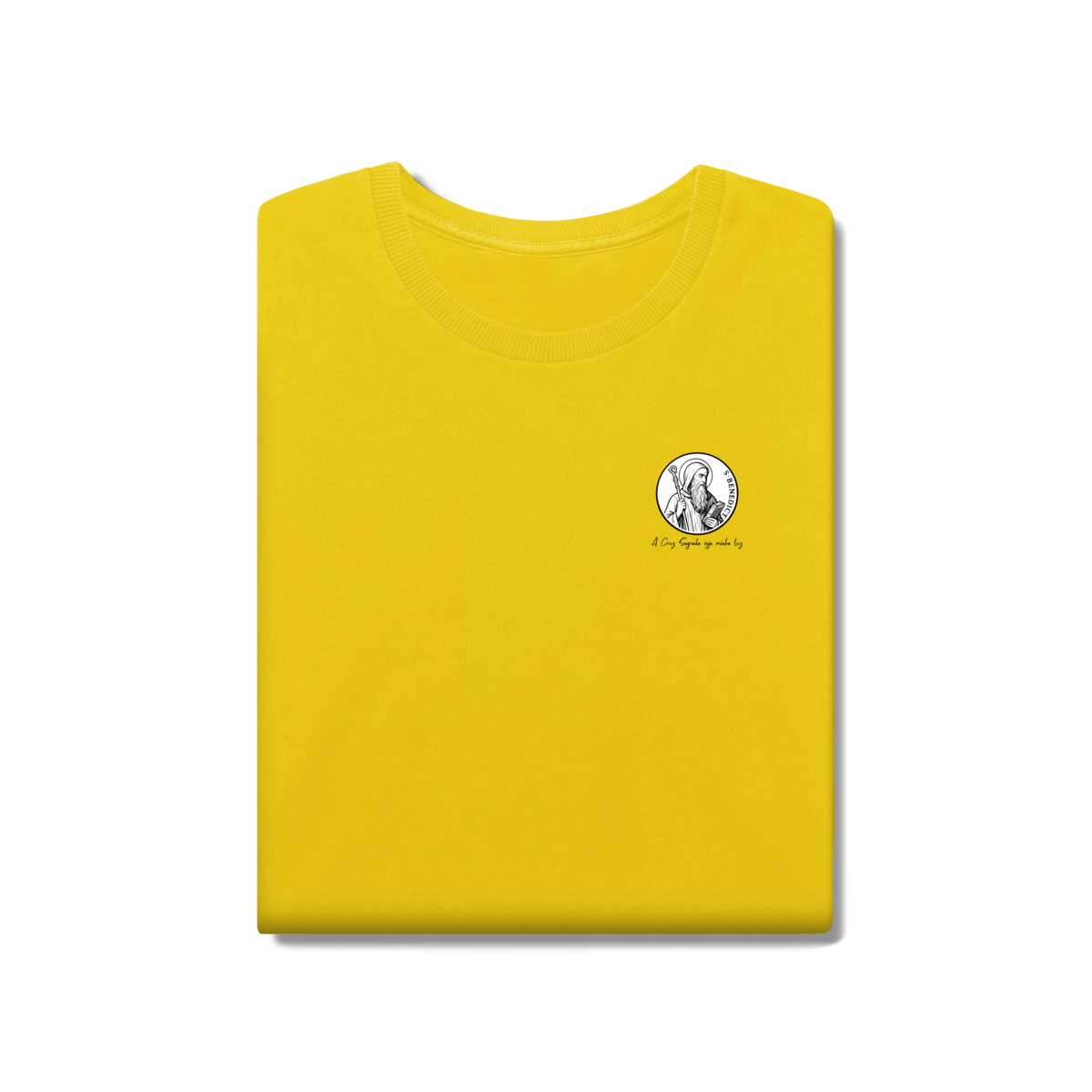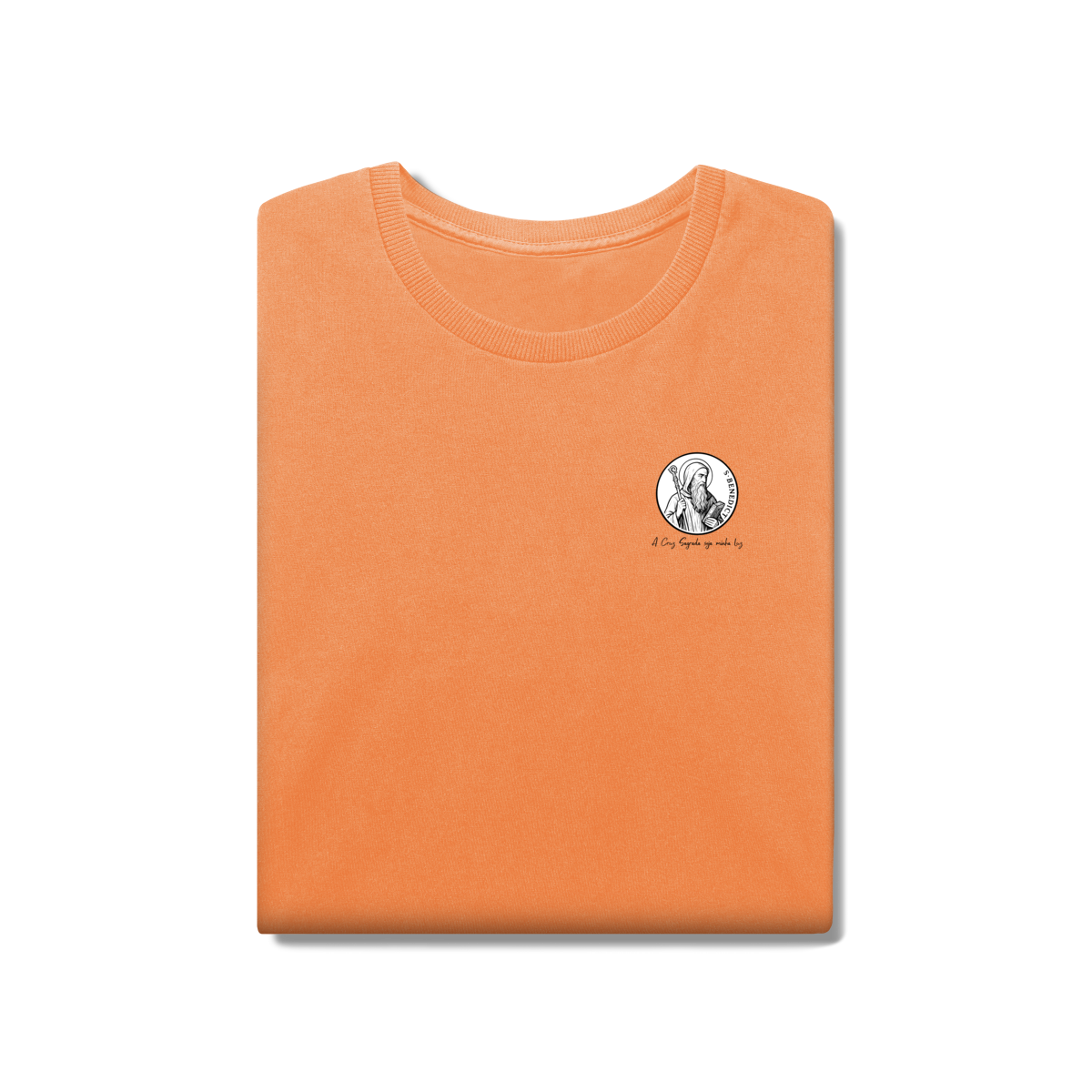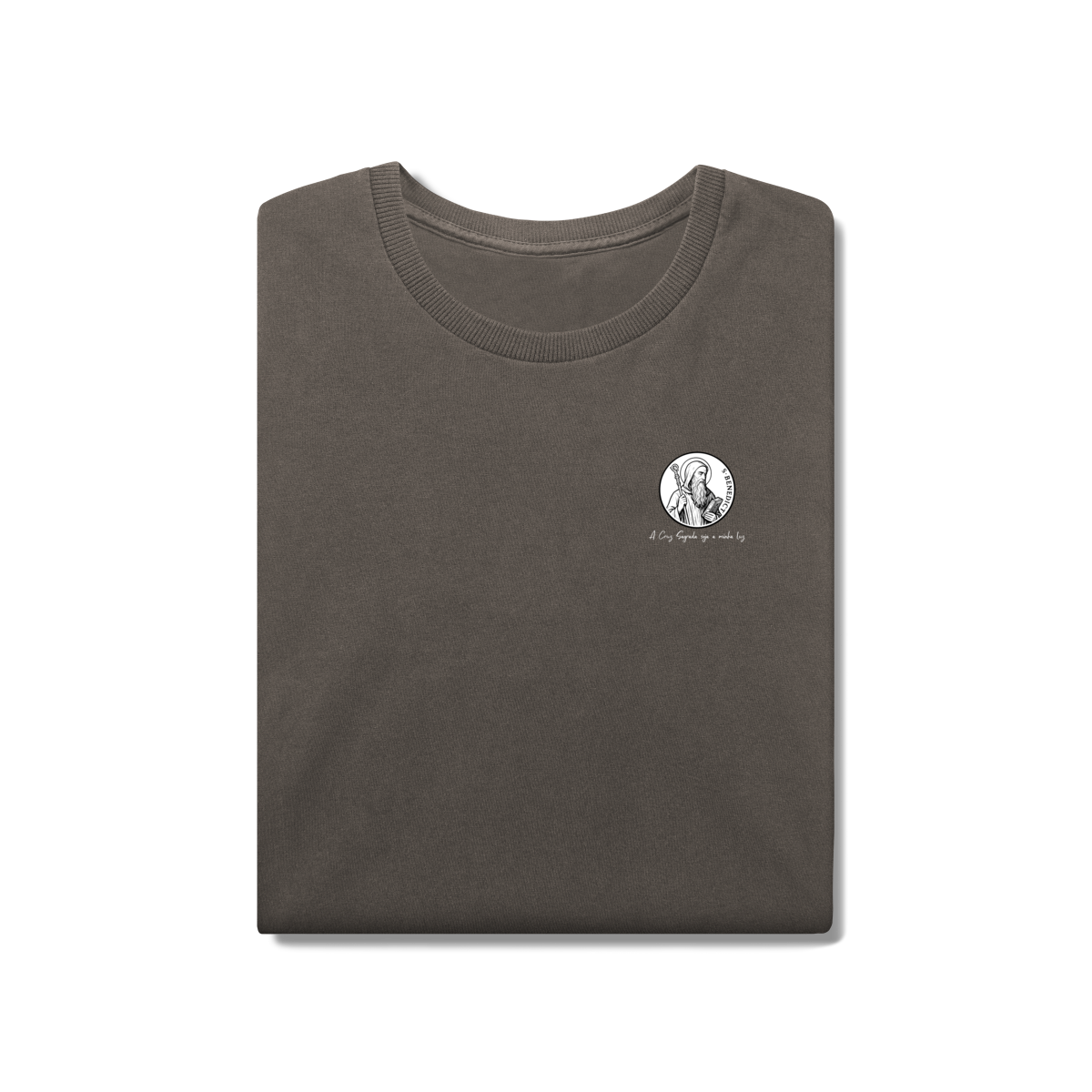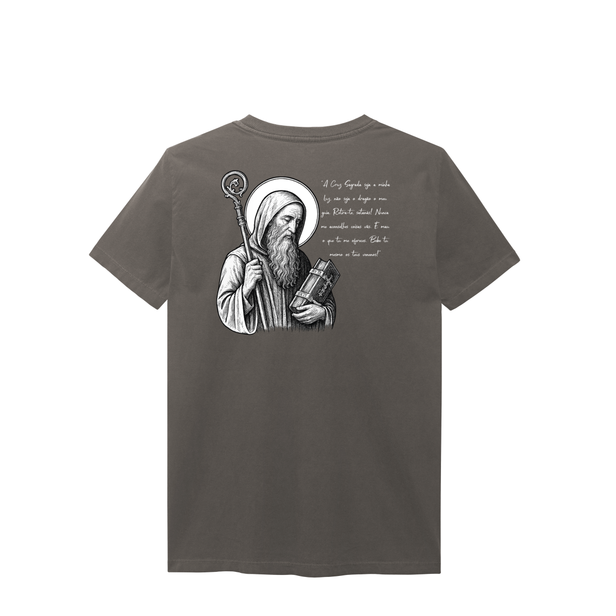 Na frente, a camiseta traz uma estampa pequena de São Bento, posicionada do lado esquerdo do peito.