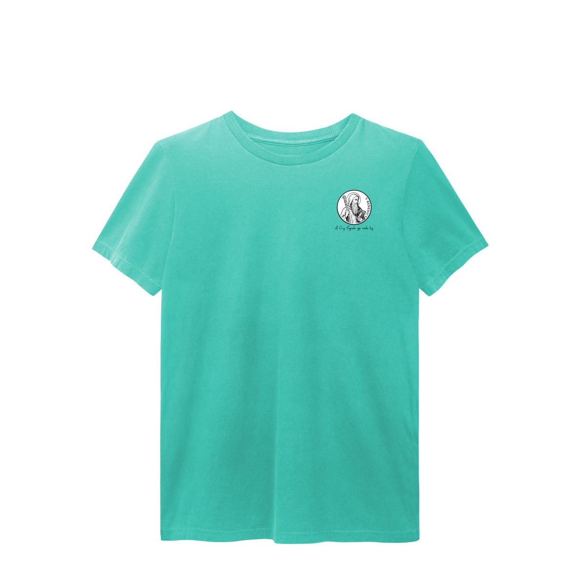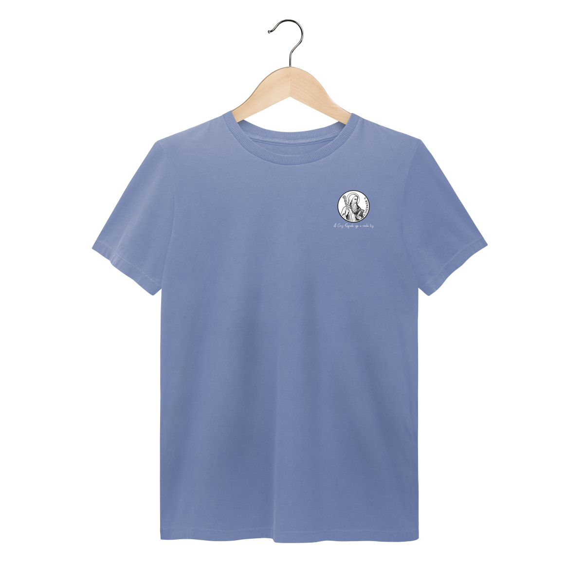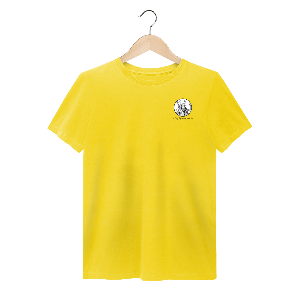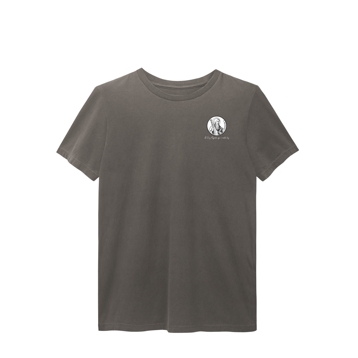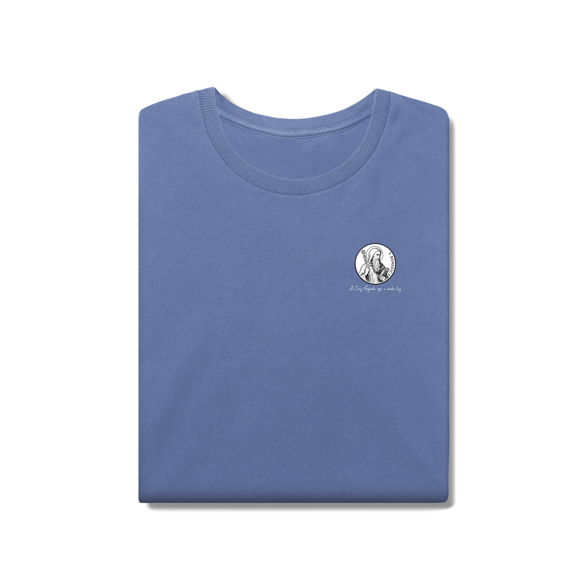 Na frente, a camiseta traz uma estampa pequena de São Bento, posicionada do lado esquerdo do peito.