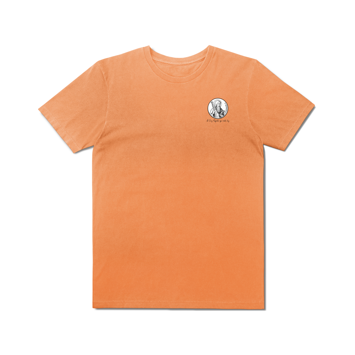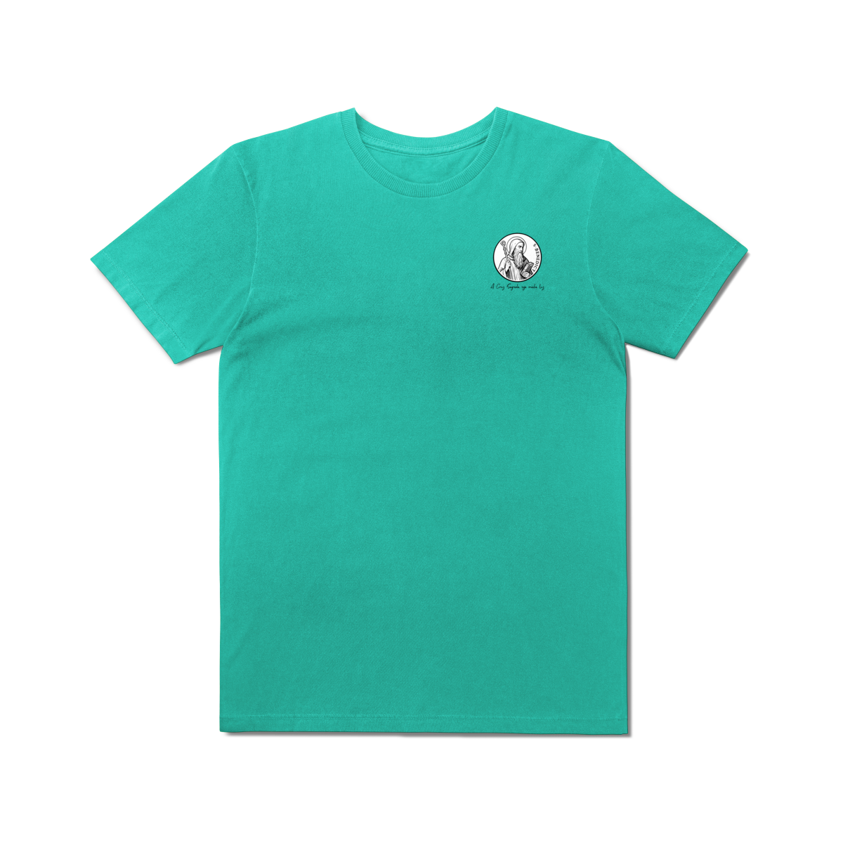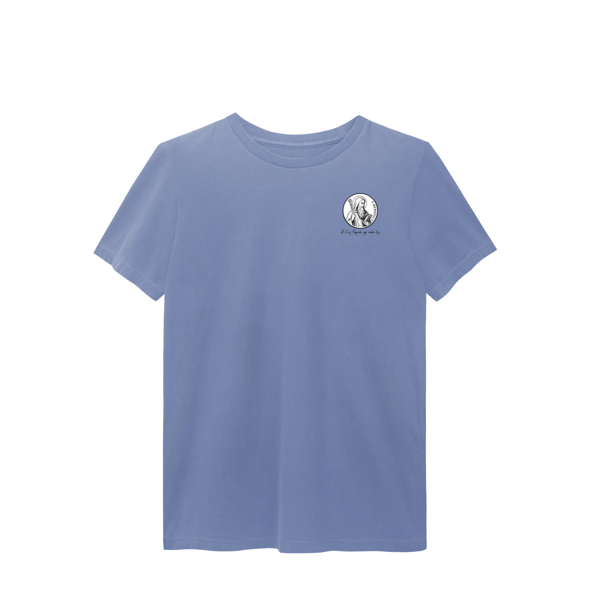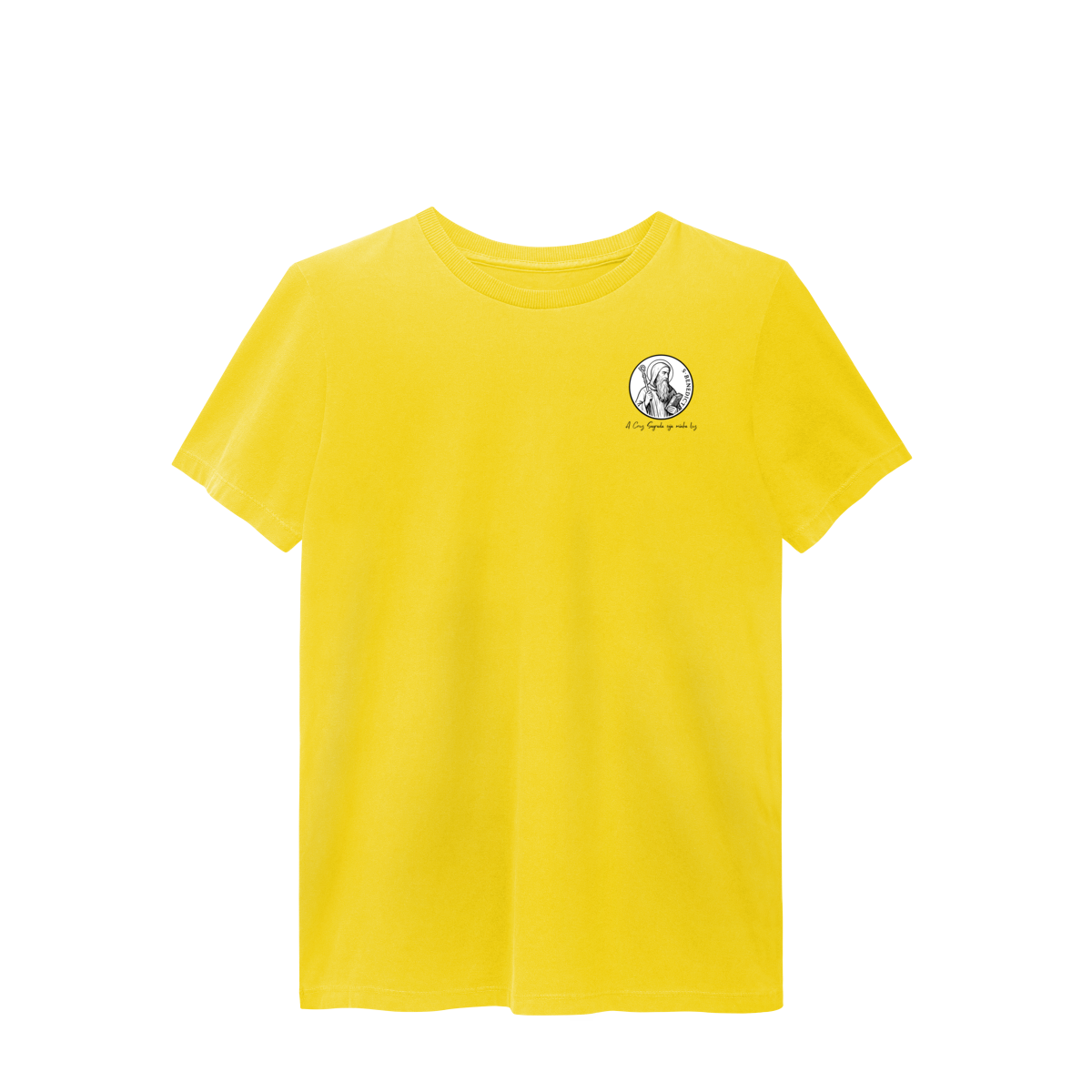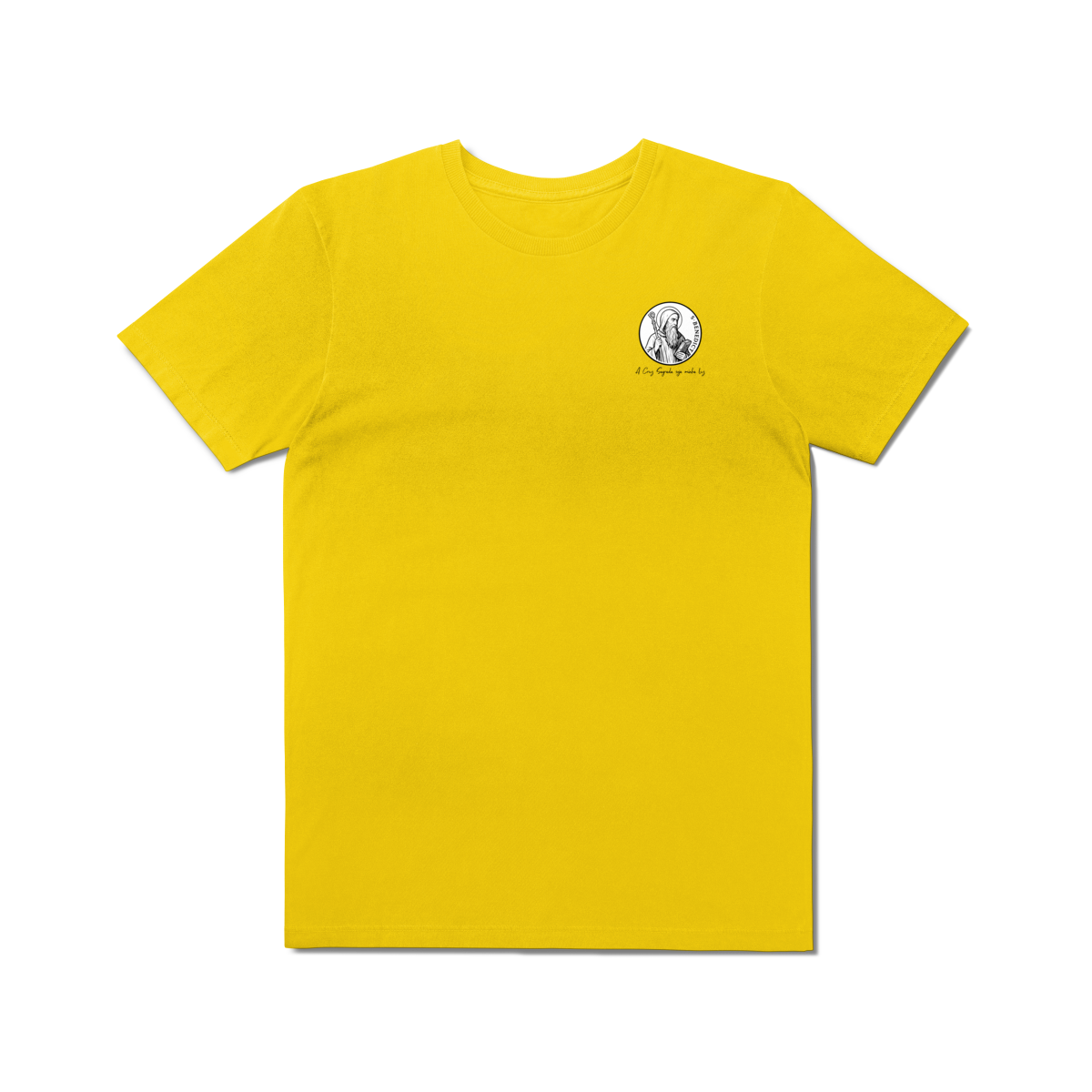 Na frente, a camiseta traz uma estampa pequena de São Bento, posicionada do lado esquerdo do peito.