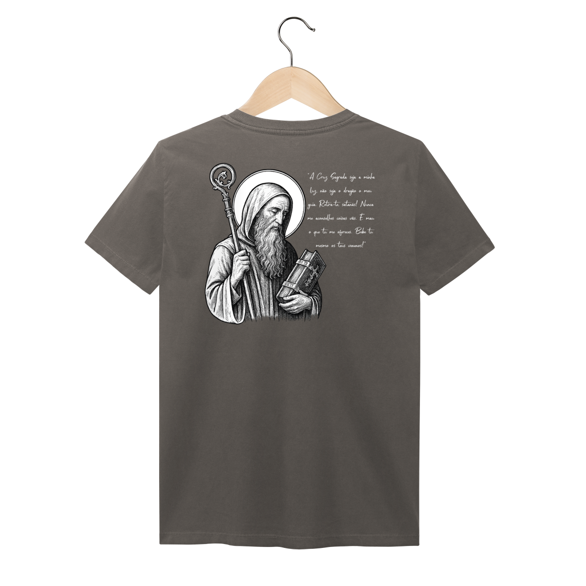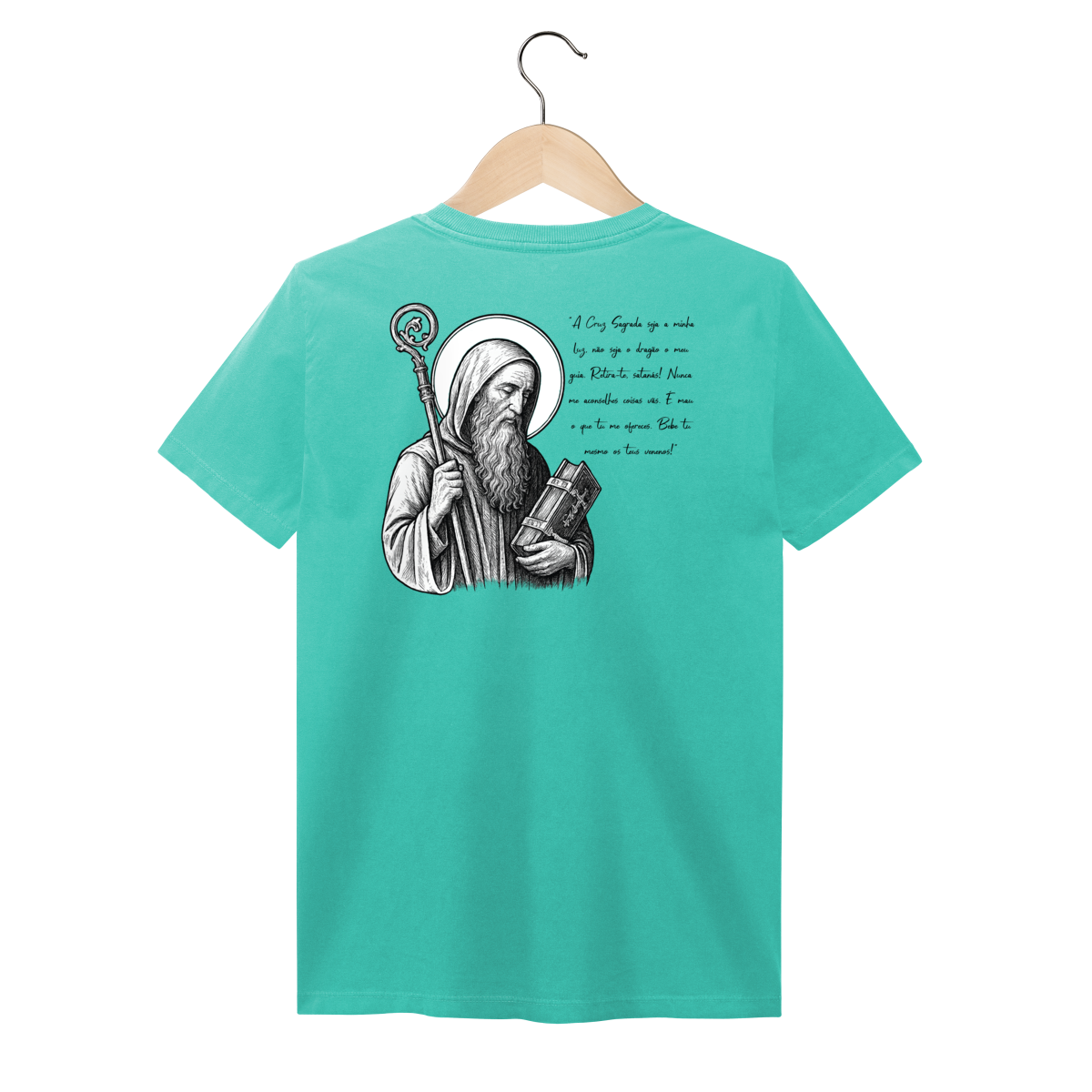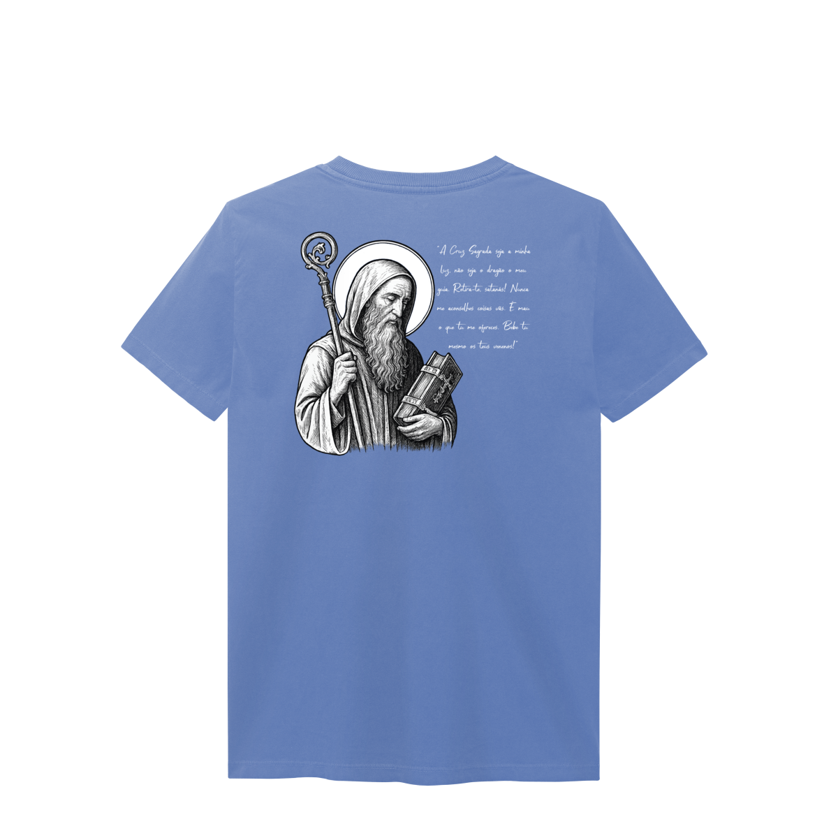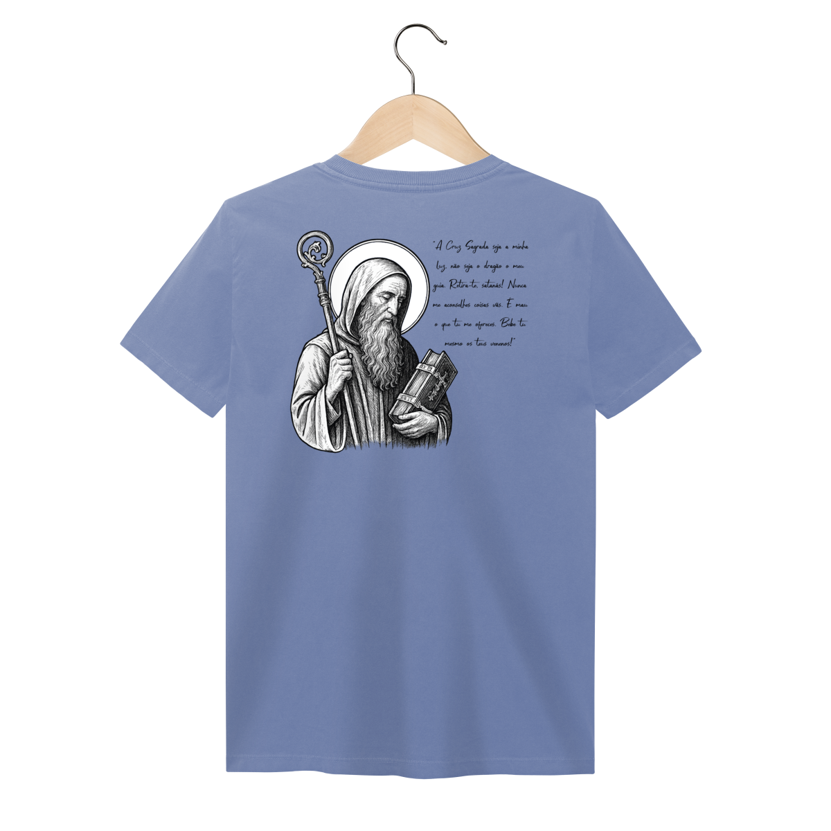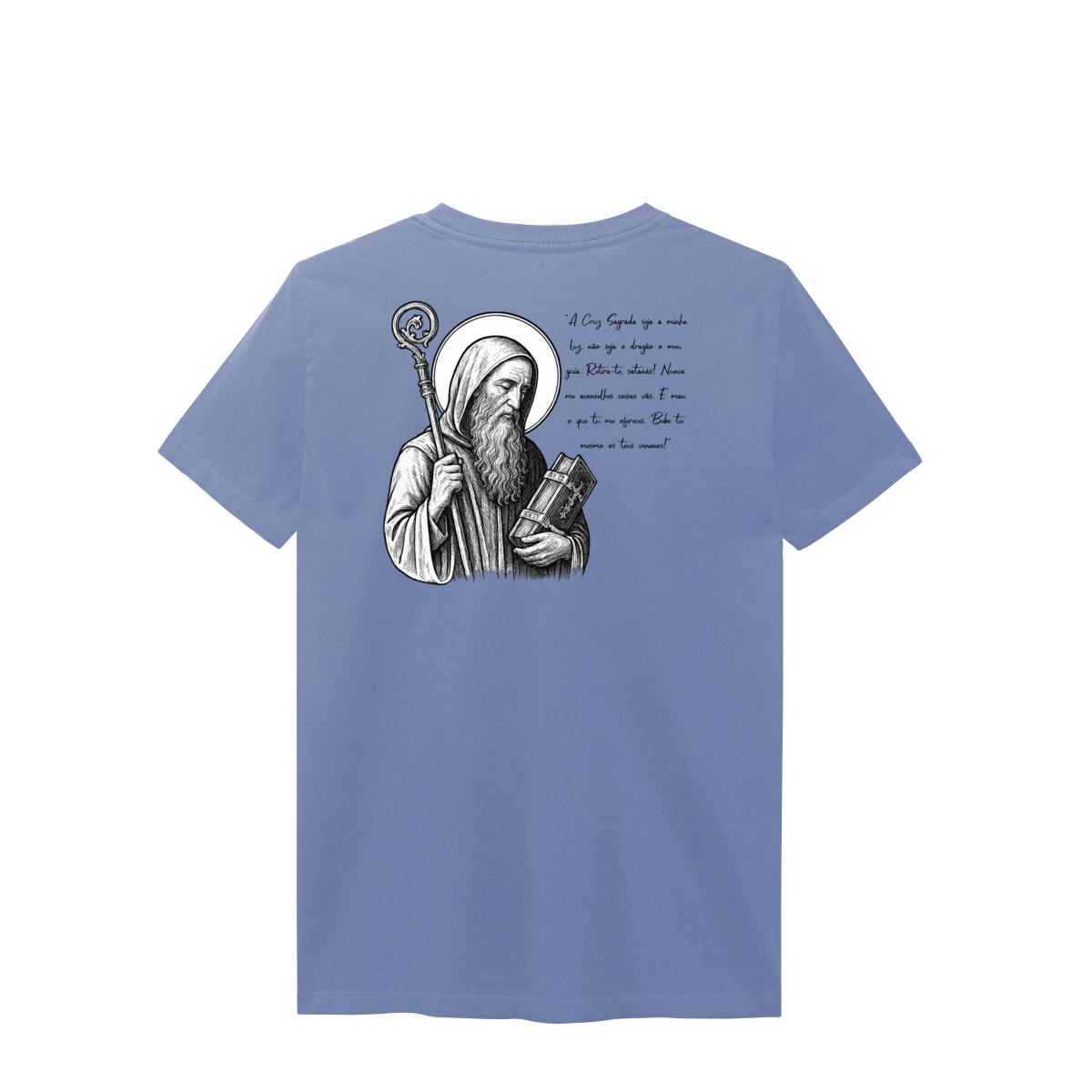 Nas costas, a estampa é grande e imponente, com a imagem de São Bento em destaque, acompanhada de sua oração, reforçando a mensagem de proteção, força espiritual e combate ao mal.