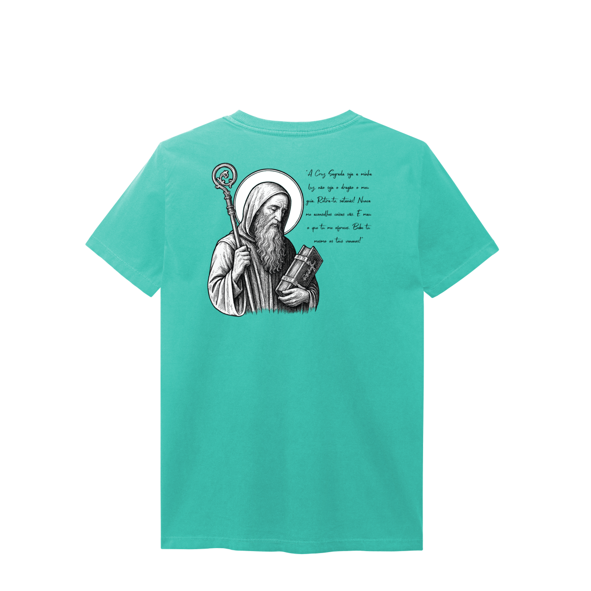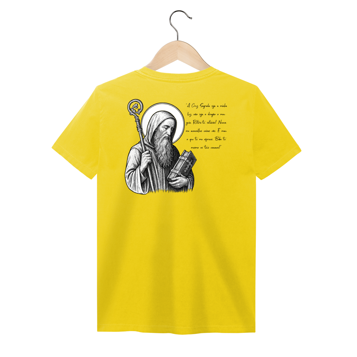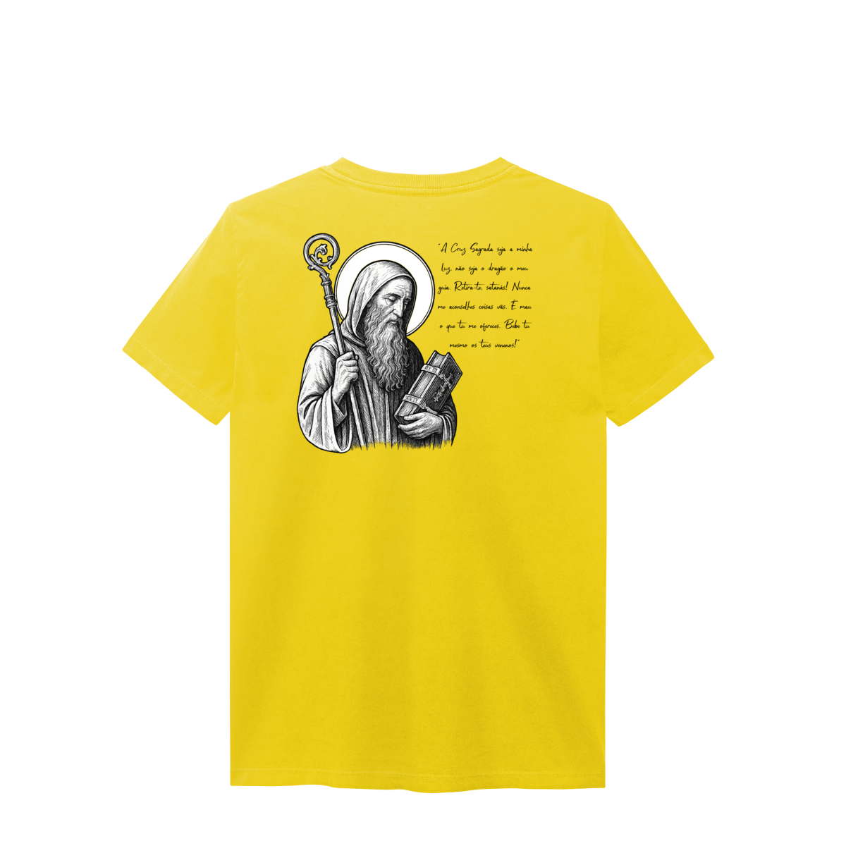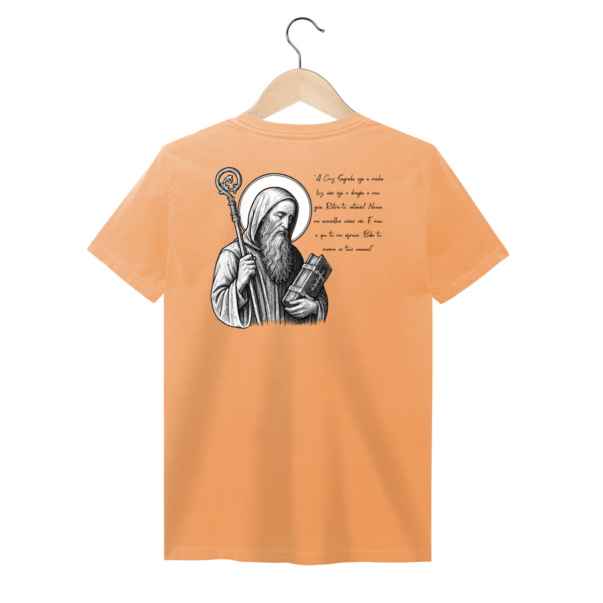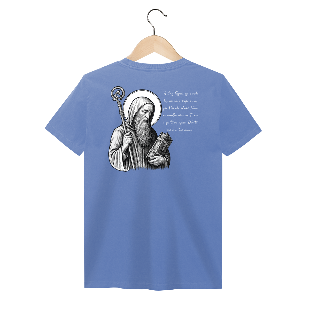 Nas costas, a estampa é grande e imponente, com a imagem de São Bento em destaque, acompanhada de sua oração, reforçando a mensagem de proteção, força espiritual e combate ao mal.