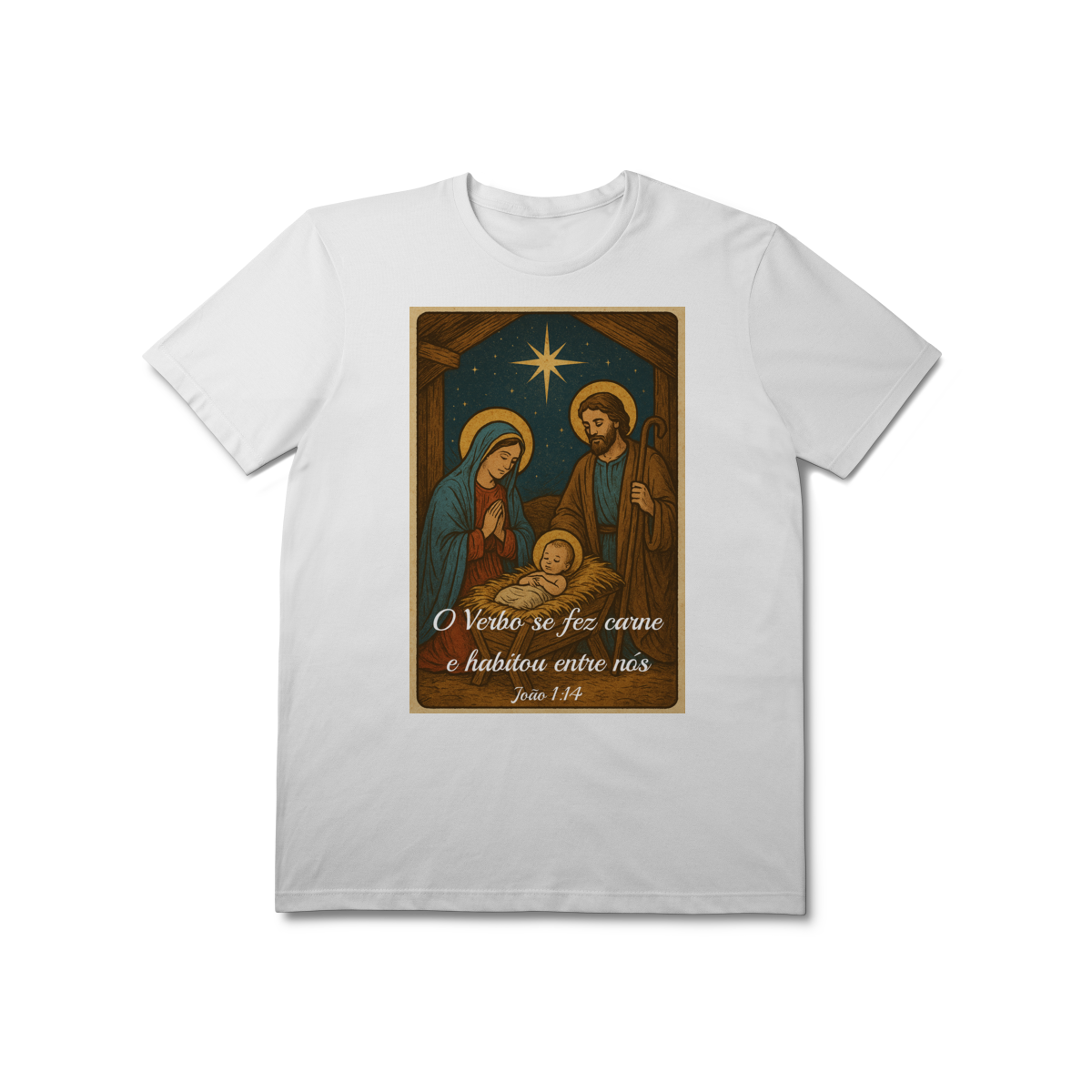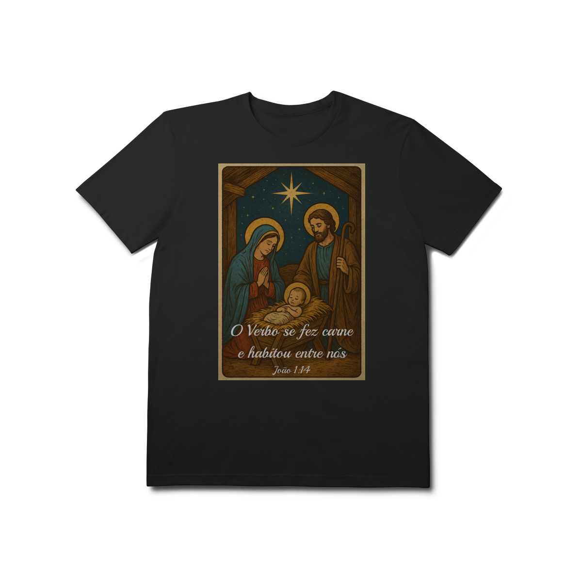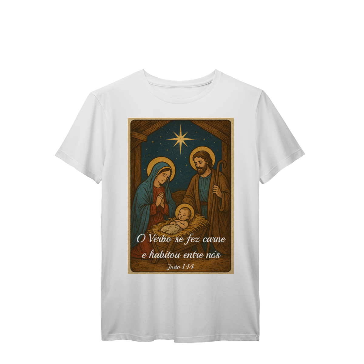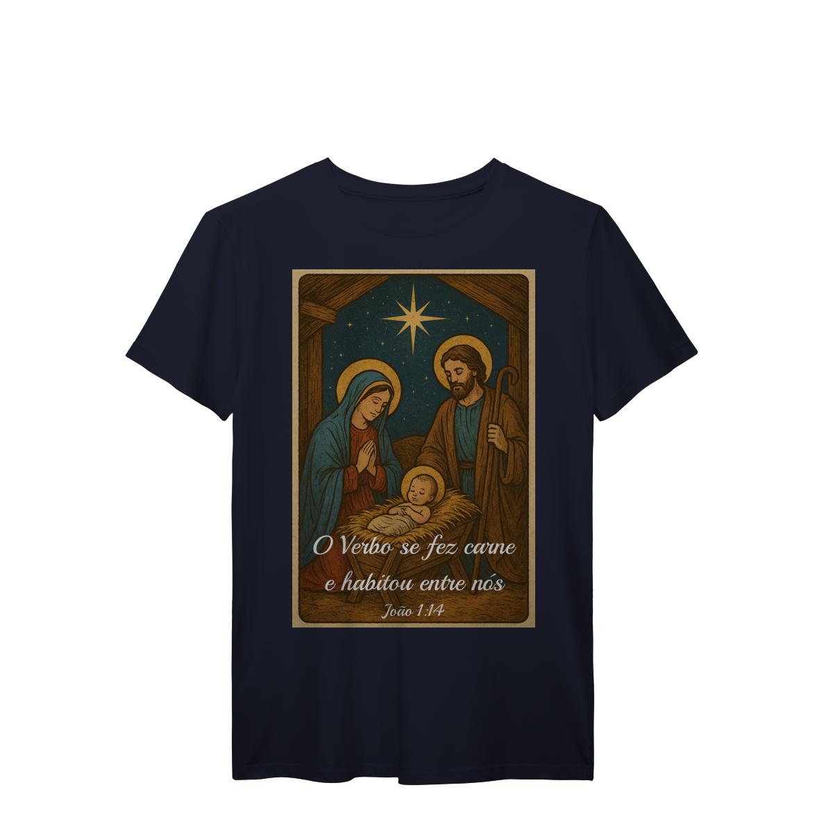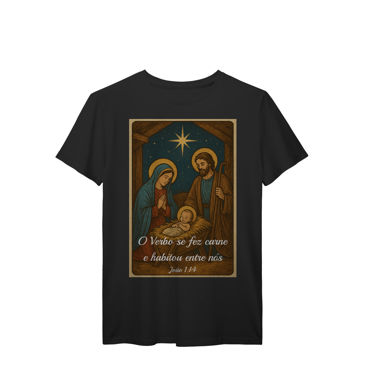 A T-Shirt Prime “O Verbo Se Fez Carne” combina qualidade superior com uma arte sacra cheia de profundidade. A estampa apresenta a cena clássica do presépio — Maria, José e o Menino Jesus sob a luz da Estrela de Belém — acompanhada da passagem bíblica “O Verbo se fez carne e habitou entre nós — João 1:14”.