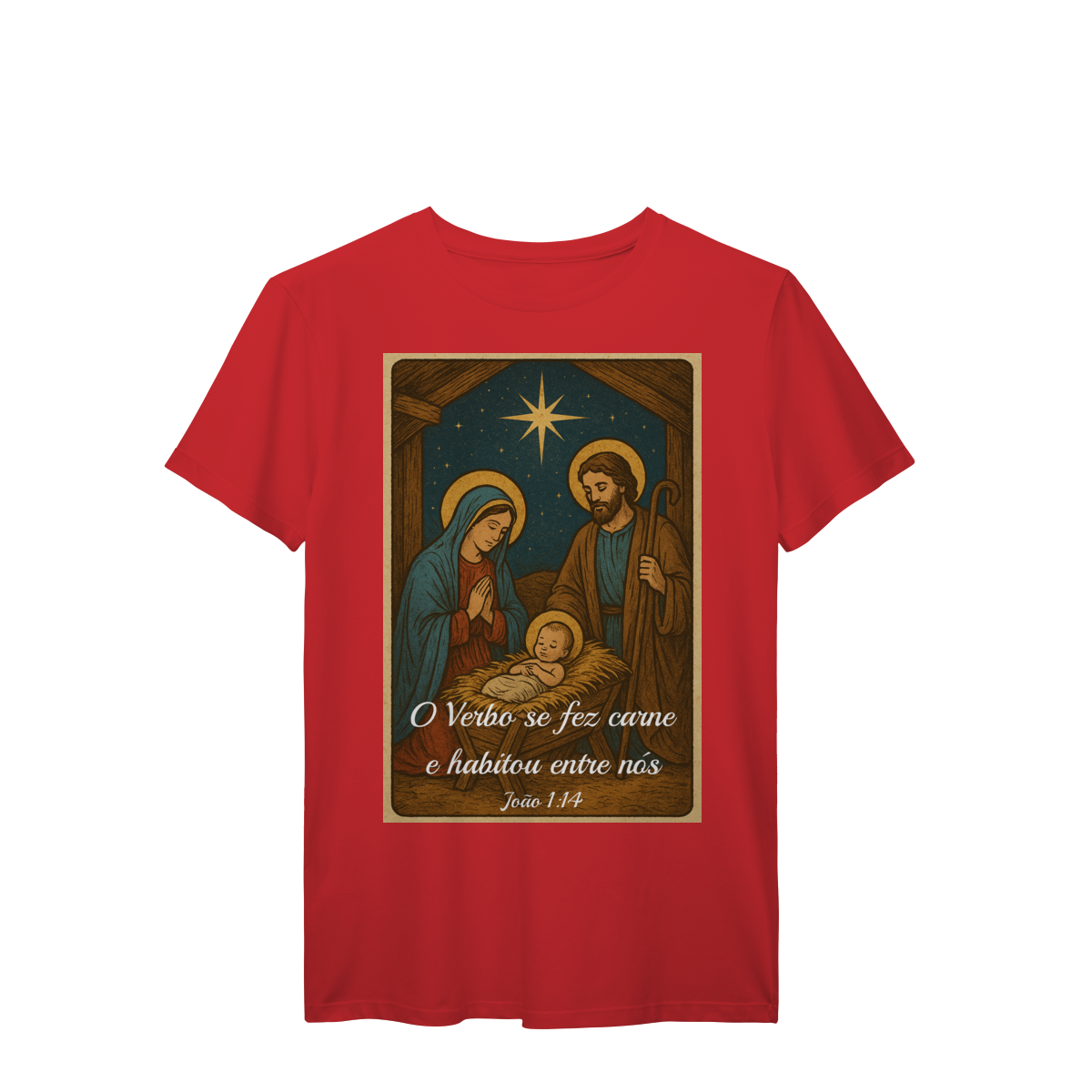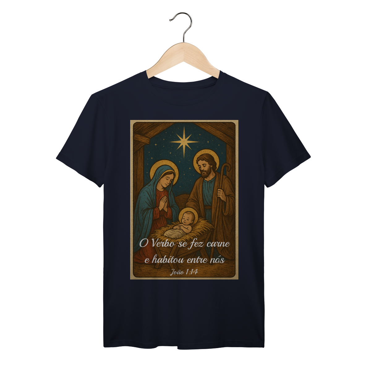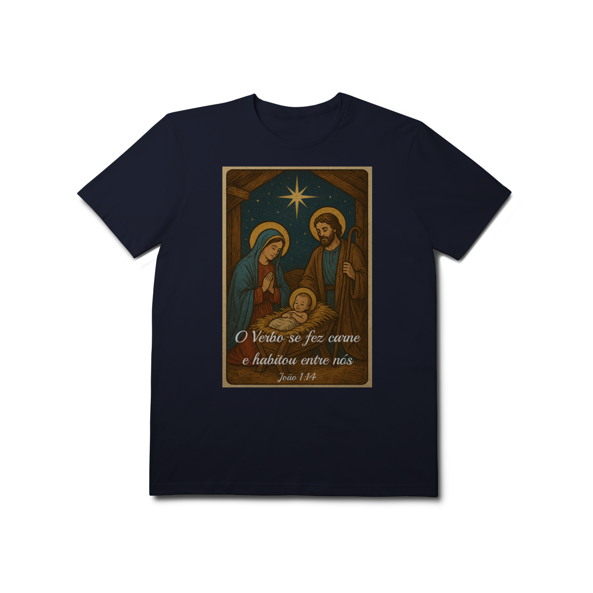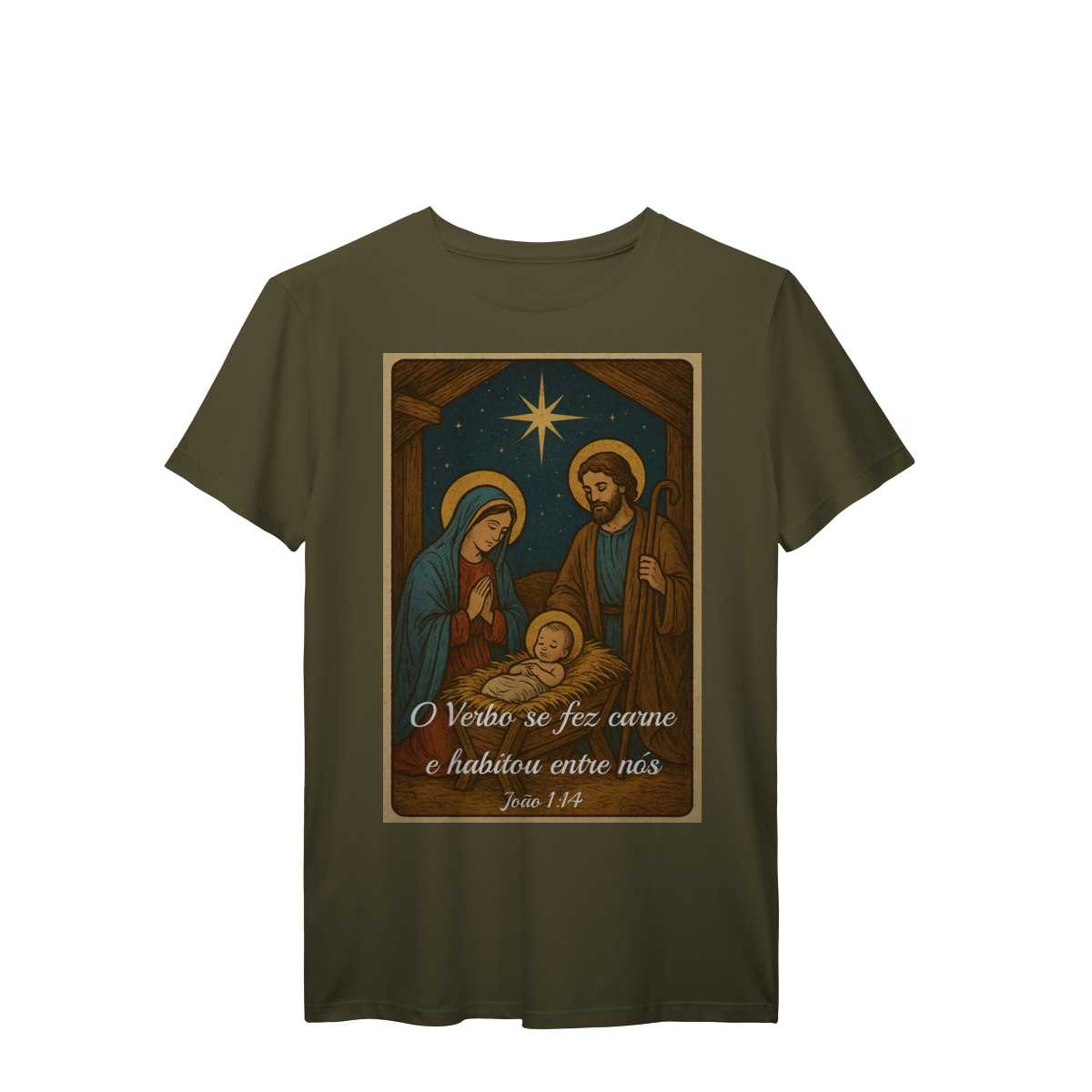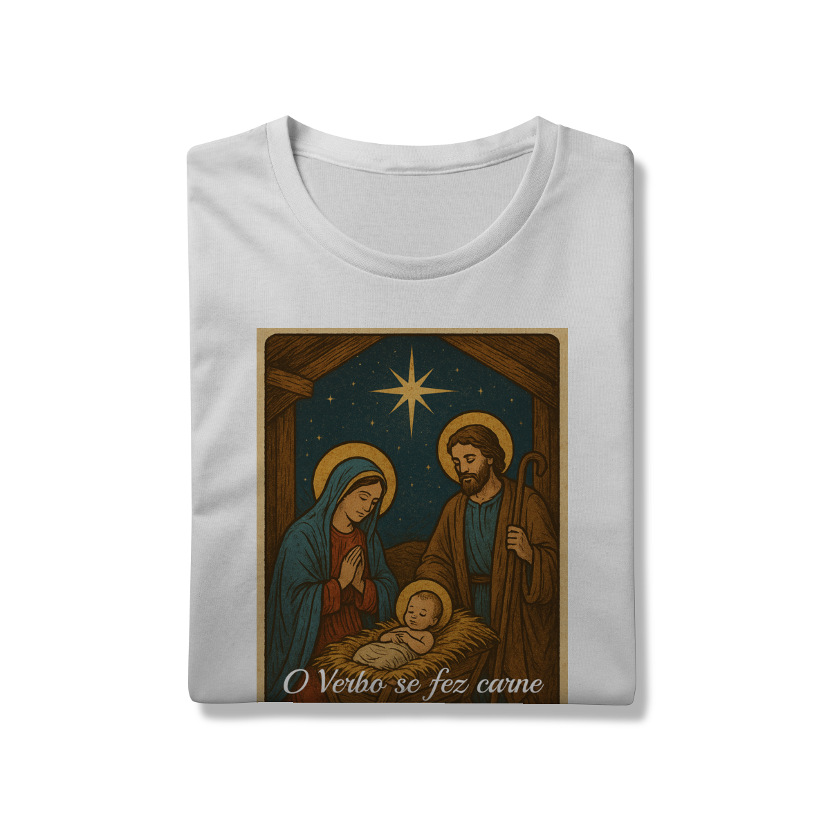 A T-Shirt Prime “O Verbo Se Fez Carne” combina qualidade superior com uma arte sacra cheia de profundidade. A estampa apresenta a cena clássica do presépio — Maria, José e o Menino Jesus sob a luz da Estrela de Belém — acompanhada da passagem bíblica “O Verbo se fez carne e habitou entre nós — João 1:14”.